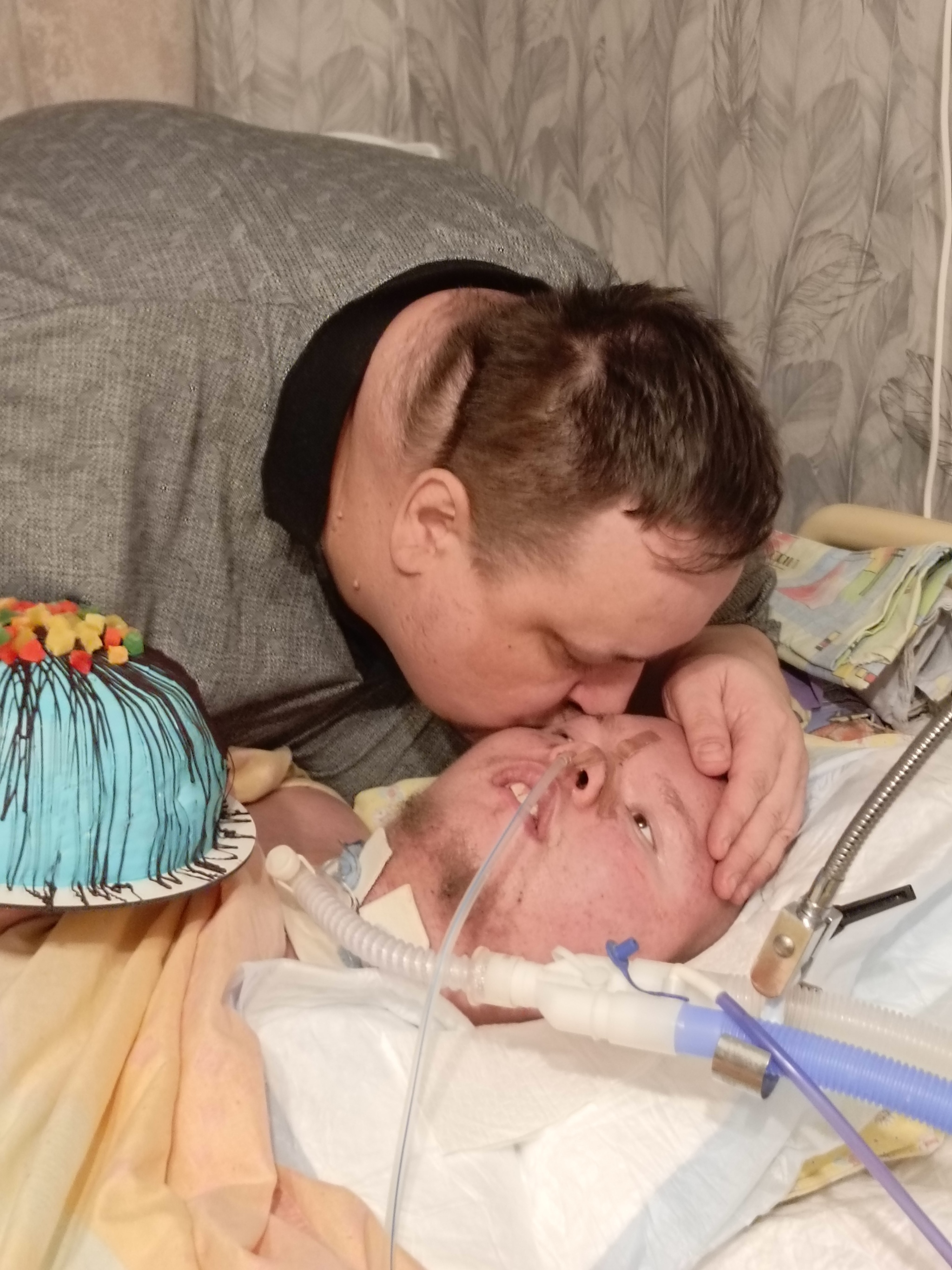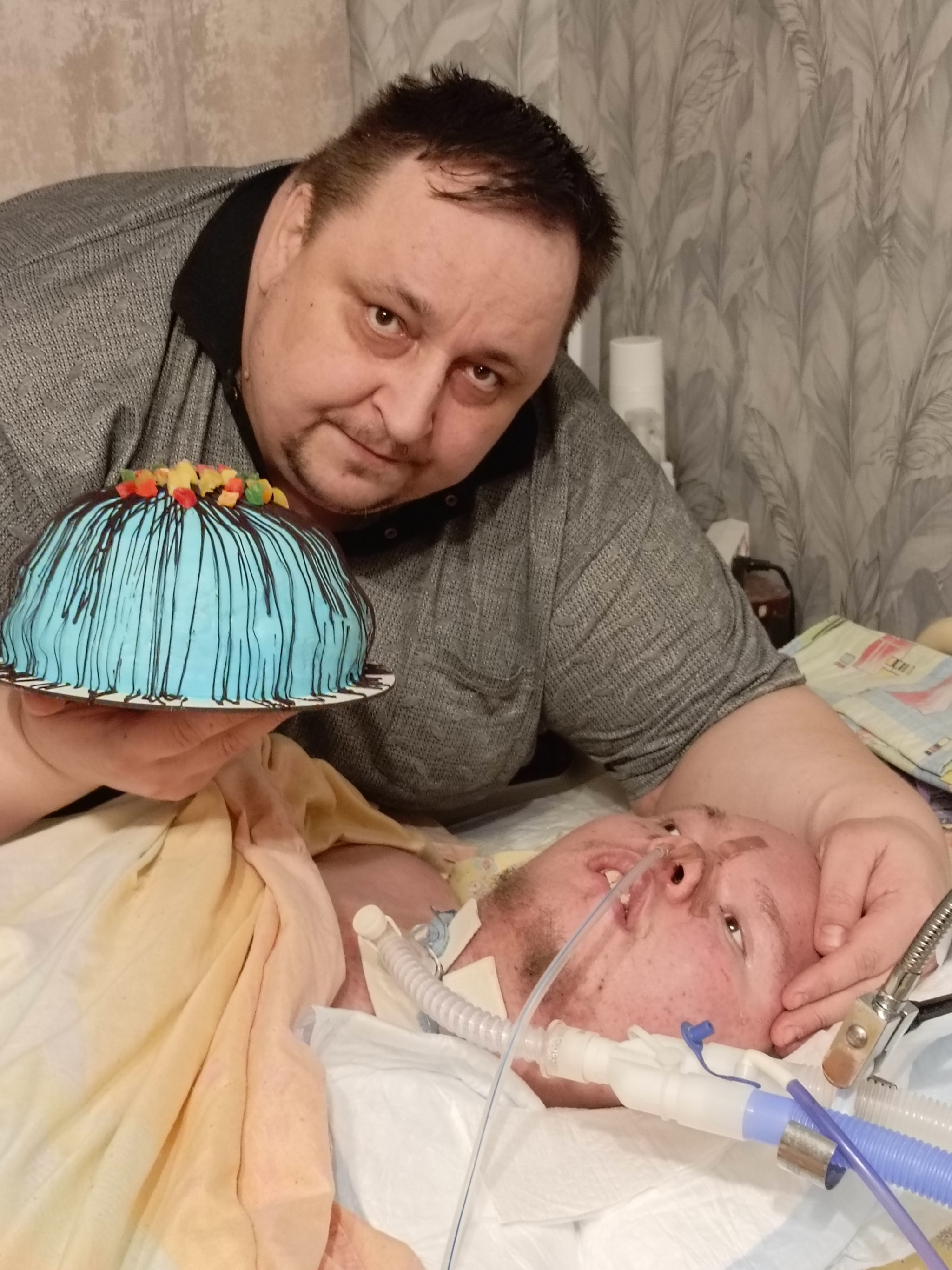 Сегодня у нас праздник 🎂 Моему любимому сынуле Антошке исполнилось 19 лет... Нам привезли вкусный торт ... Правда Антону нельзя тортик, он на специальном питании... Но когда его поздравили моя сестра и мой друг детства, он улыбнулся...