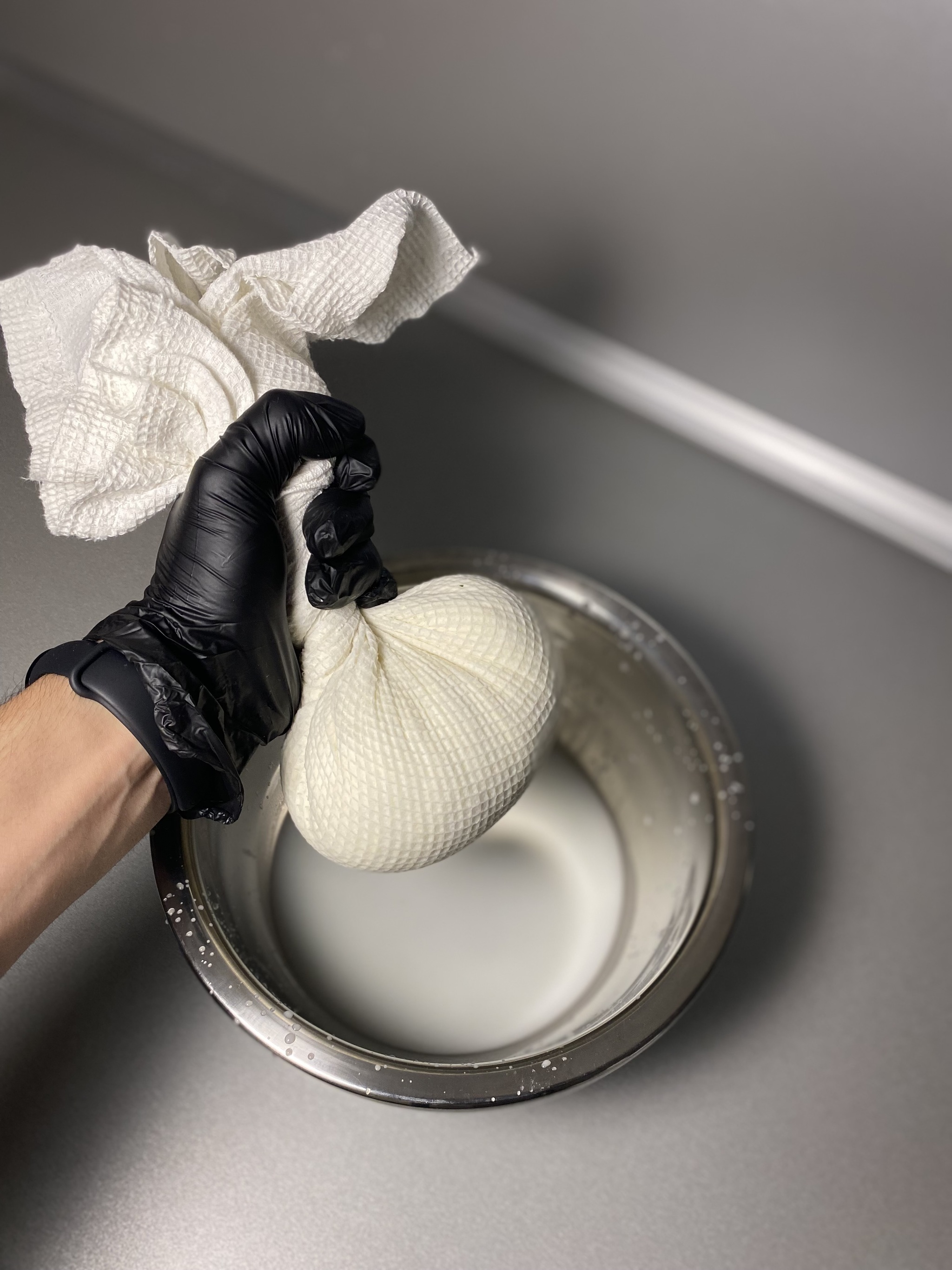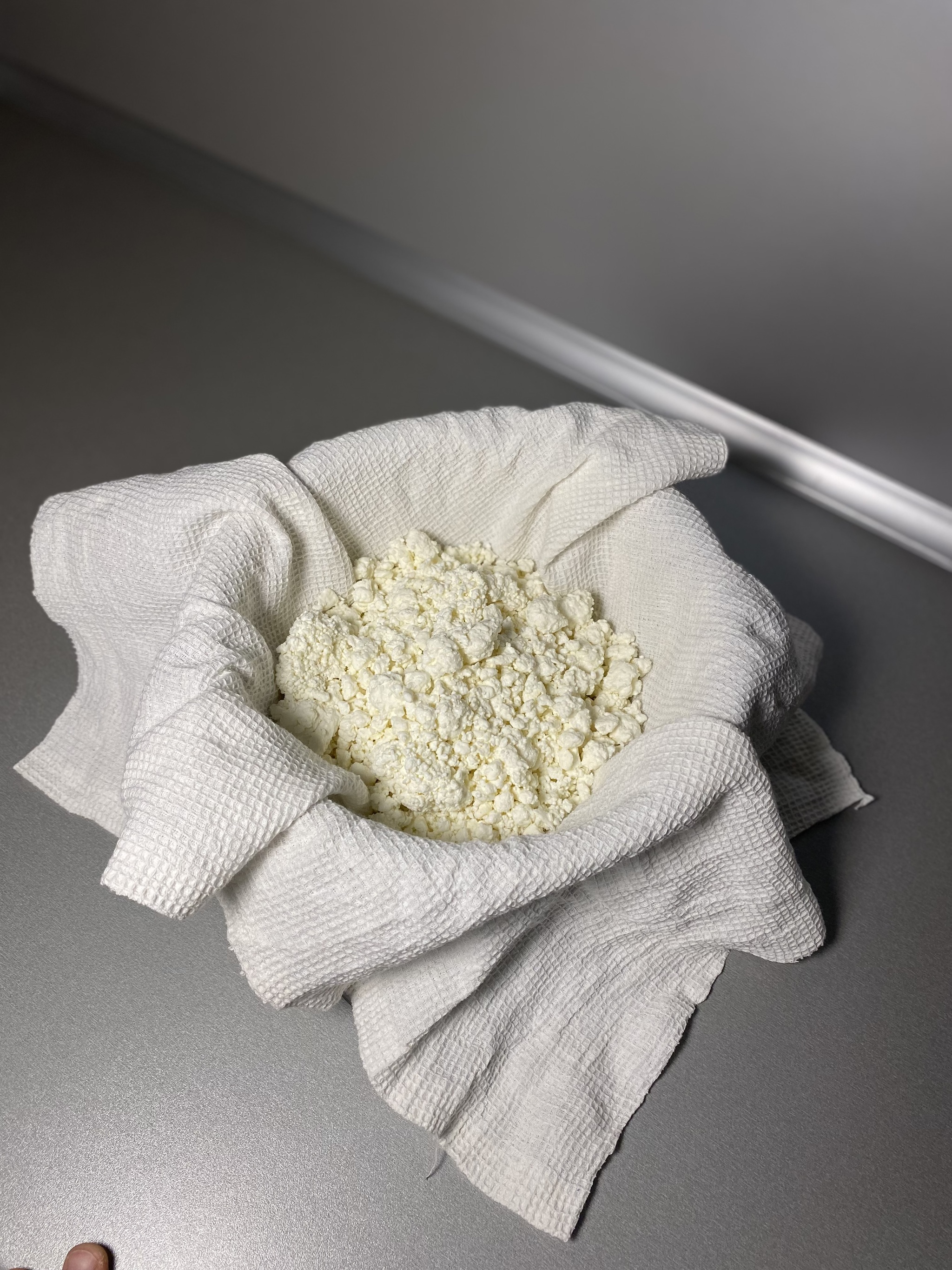 Творог необходимо отжать от лишней влаги, я использую для этого полотно, но подойдет и обычная марля.