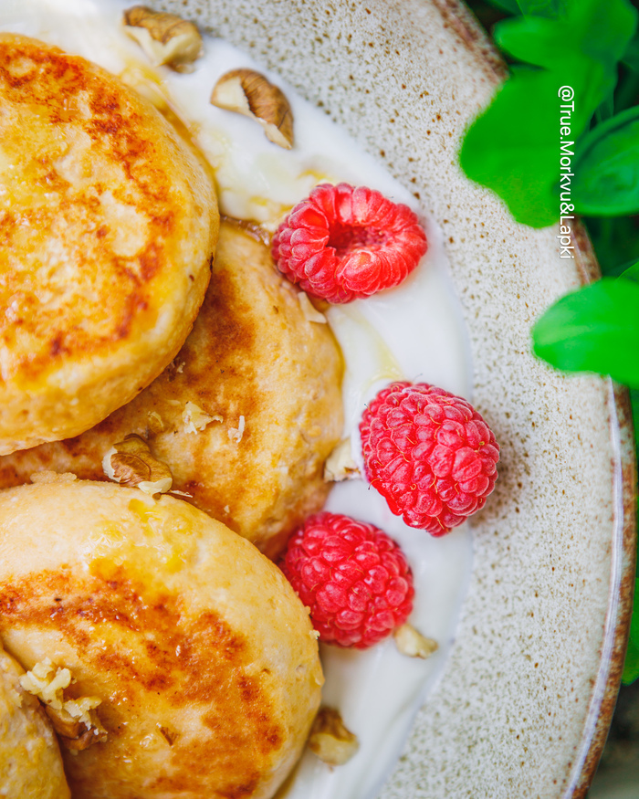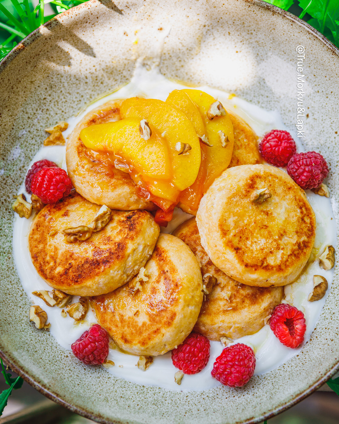 Сырники на топленом твороге с рикоттой, персиками и медом