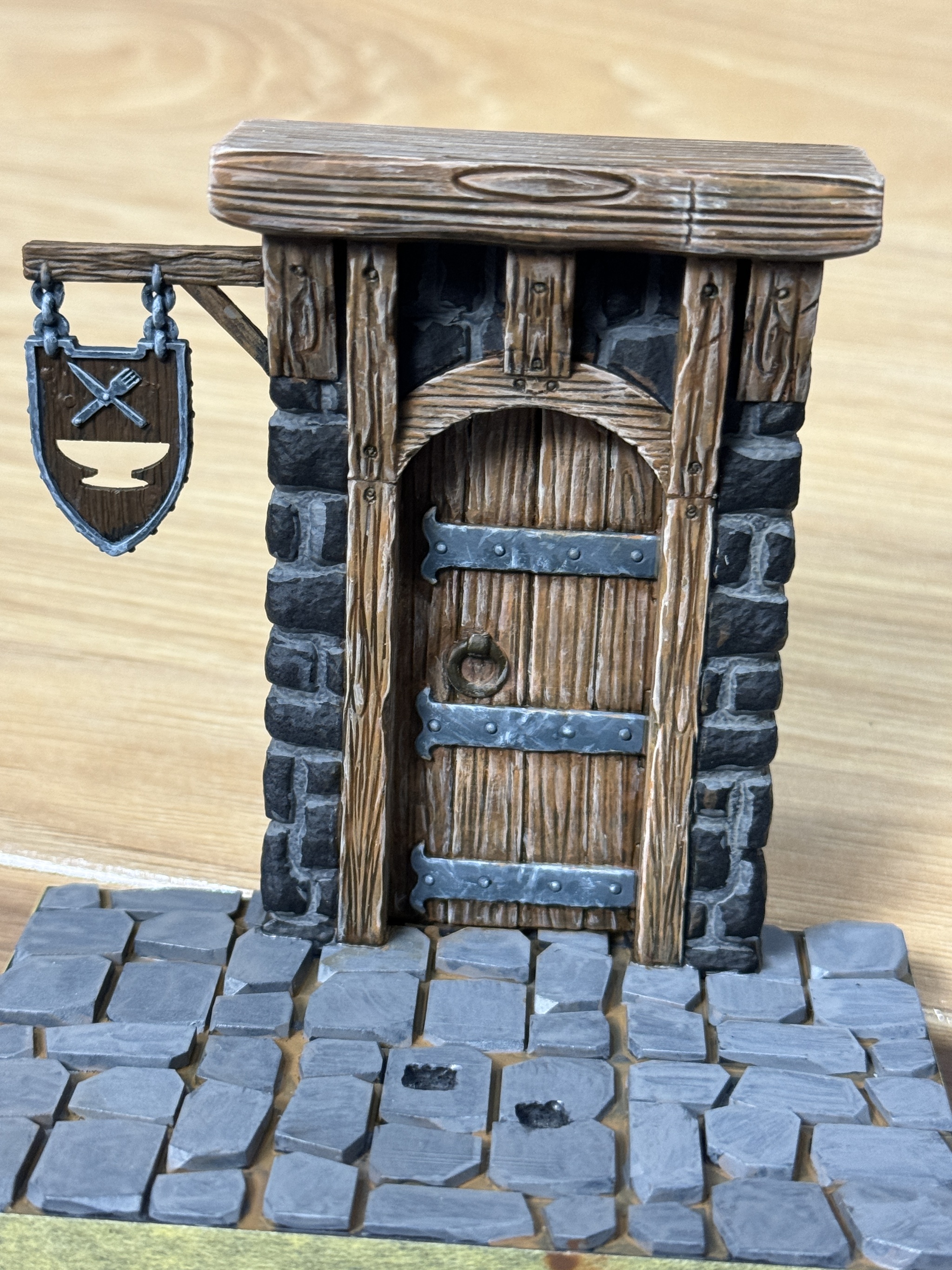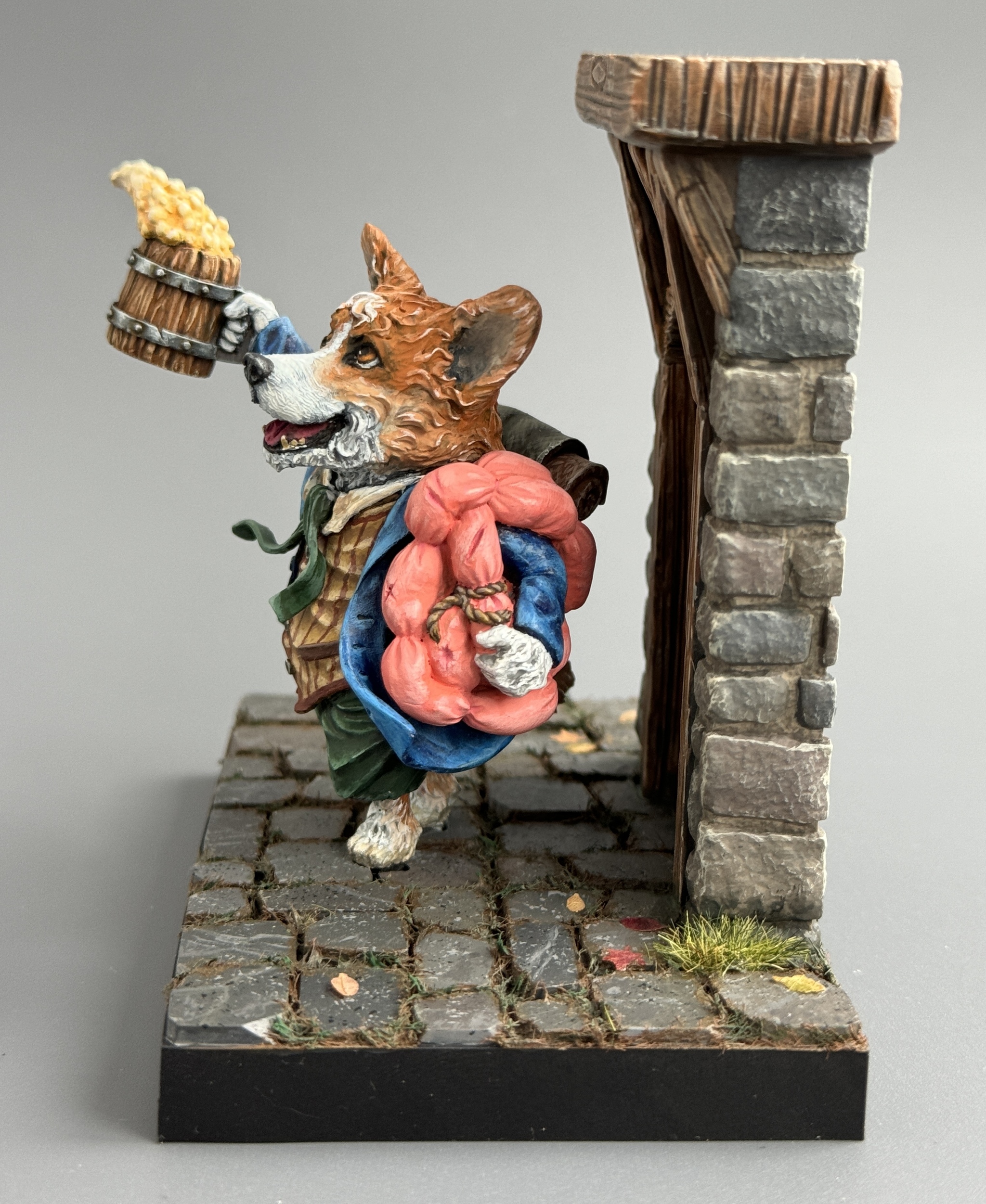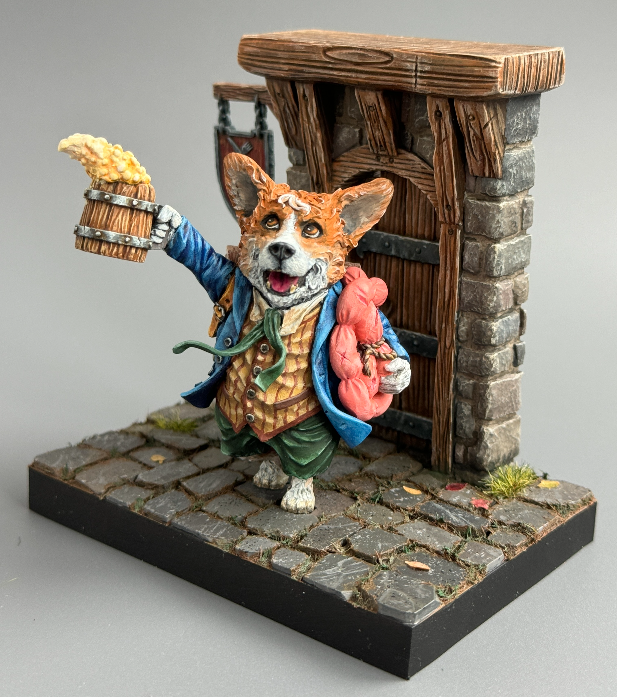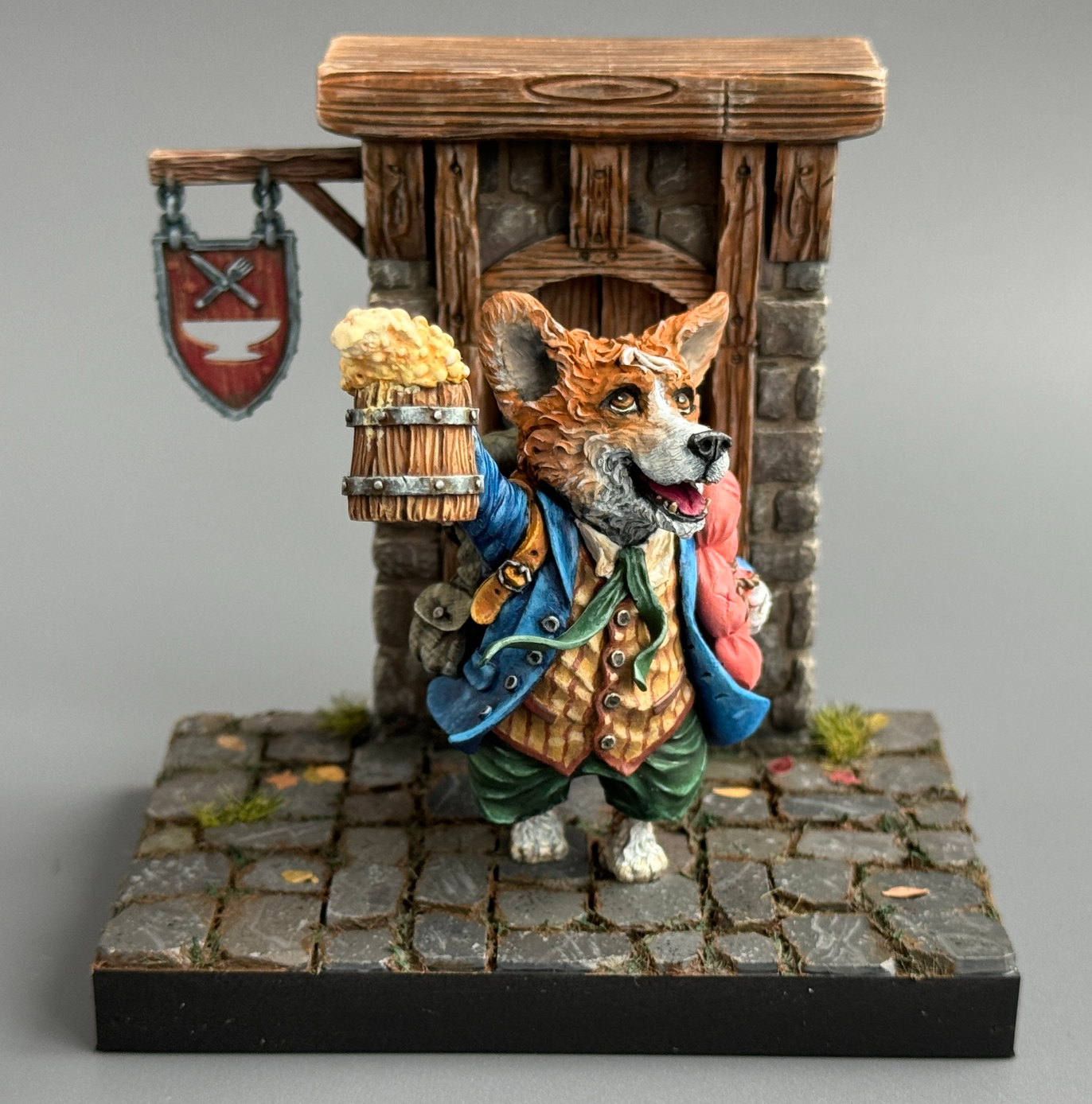 Дальше дело за подставкой, но готовый стандартный кусочек земли от фигурки не совсем зашёл. Хотелось проявить больше творчества и фантазии, так что полезла моделировать в 3D с разных кусков. Виделось мне, что пёсель вышел из таверны или сидит и лакомится там вкуснейшими явствами. Не вышло обыграть что-то в виде столика и барной стойки, слишком громоздкая подставка и сложно было найти подходящие детали. Ограничилась входом в таверну. Склеивала и корректировала в программе Blender.