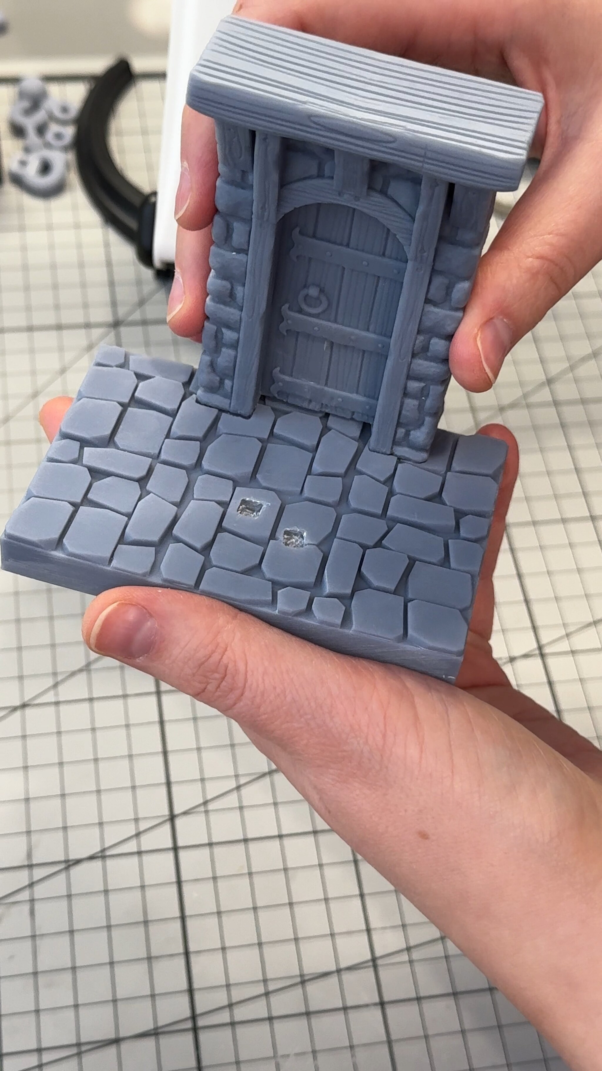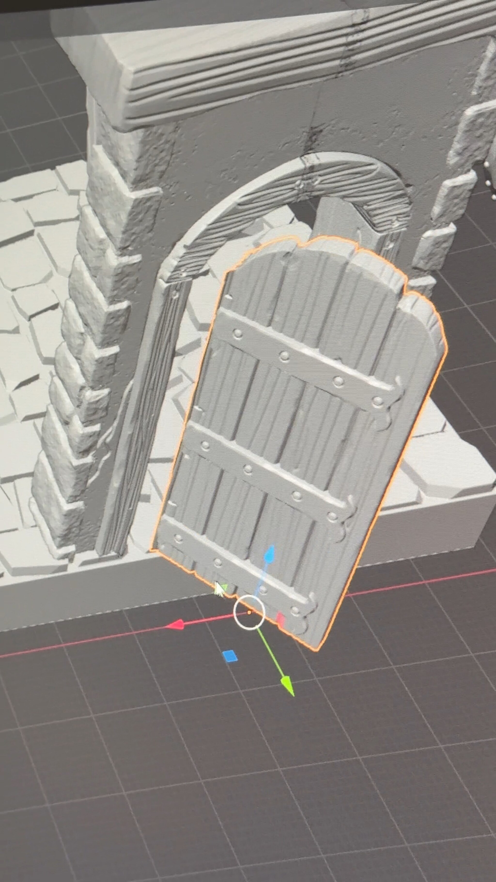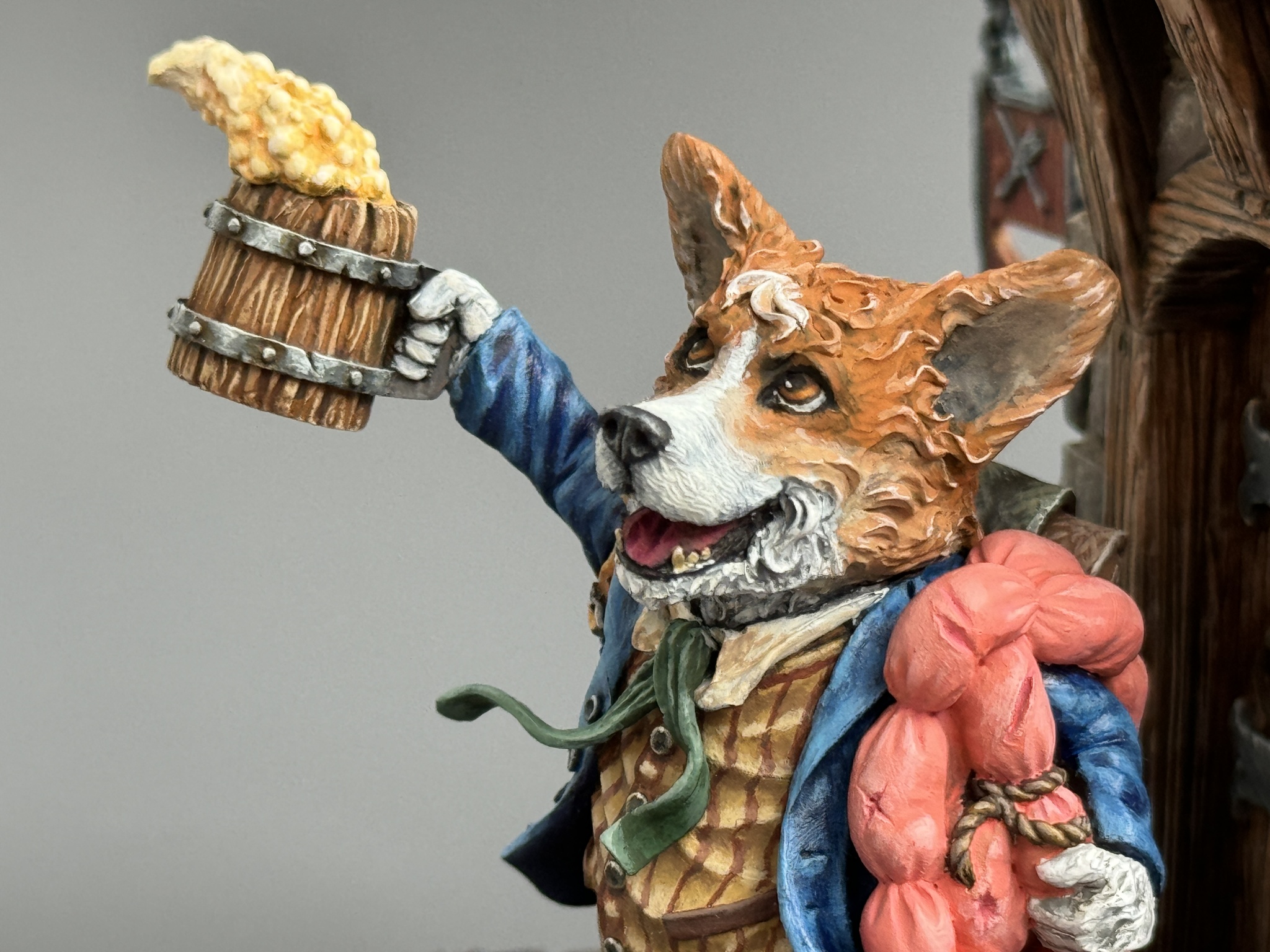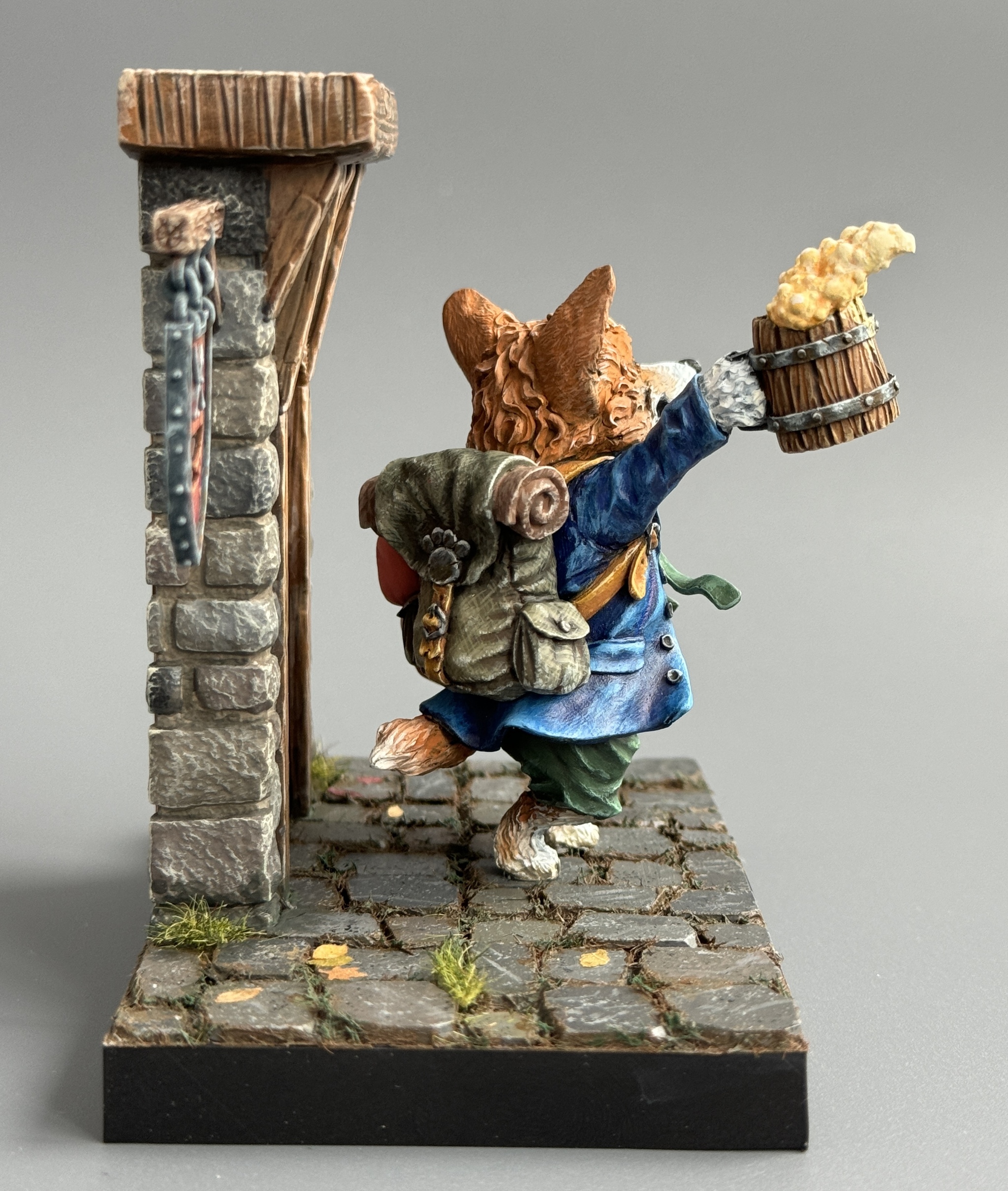 Дальше дело за подставкой, но готовый стандартный кусочек земли от фигурки не совсем зашёл. Хотелось проявить больше творчества и фантазии, так что полезла моделировать в 3D с разных кусков. Виделось мне, что пёсель вышел из таверны или сидит и лакомится там вкуснейшими явствами. Не вышло обыграть что-то в виде столика и барной стойки, слишком громоздкая подставка и сложно было найти подходящие детали. Ограничилась входом в таверну. Склеивала и корректировала в программе Blender.