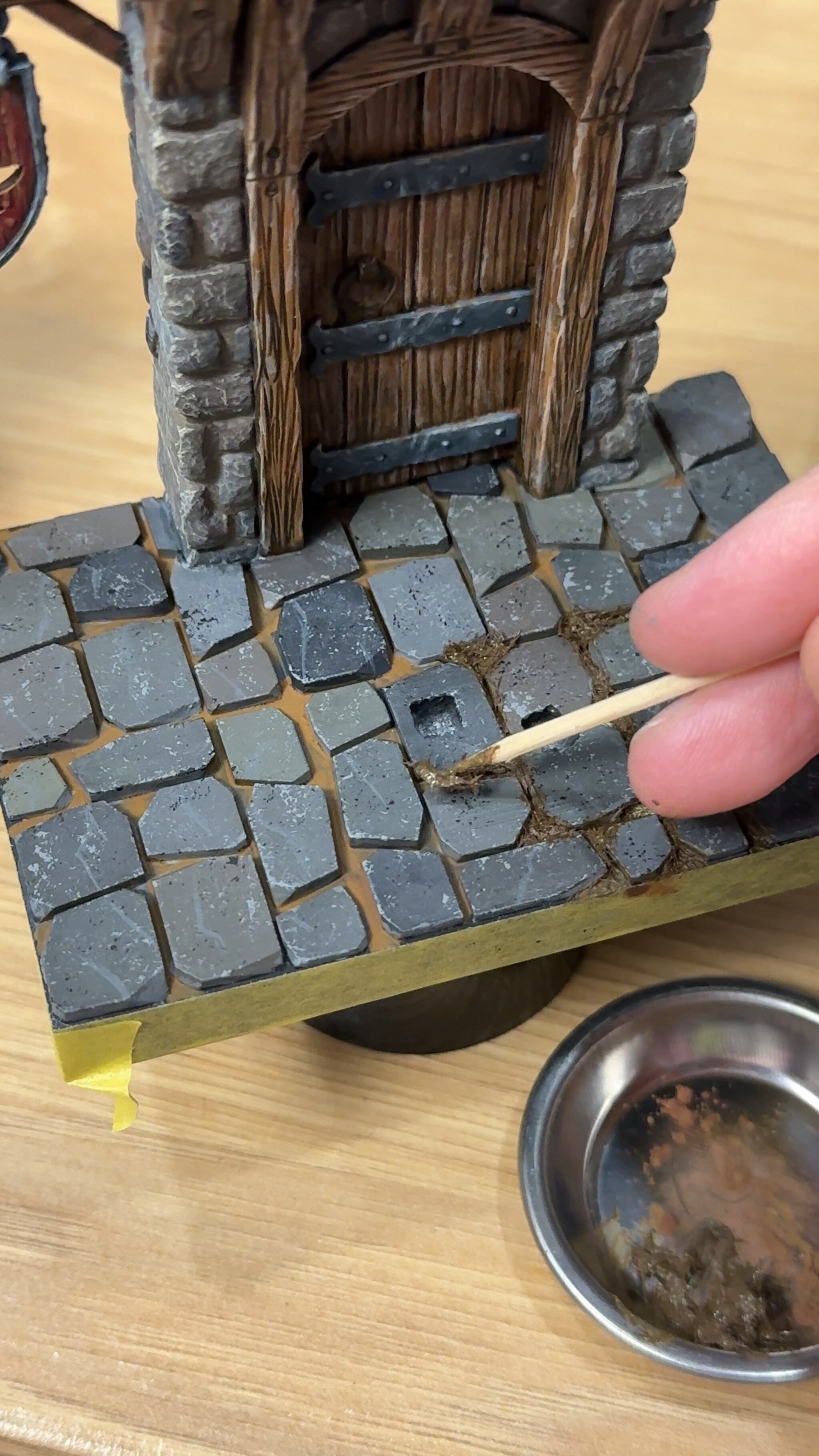 Камни на подставке довольно плоские и казались неестественными, так что надо было как-то заполнить между ними пробелы. Решила напихать грязи от Vallejo (73.807), которая через 5 минут засыхает. Уверена, что это можно было заменить флоком от травы, смешанной с краской и клеем. Но мне лень и проще было использовать готовые варианты.