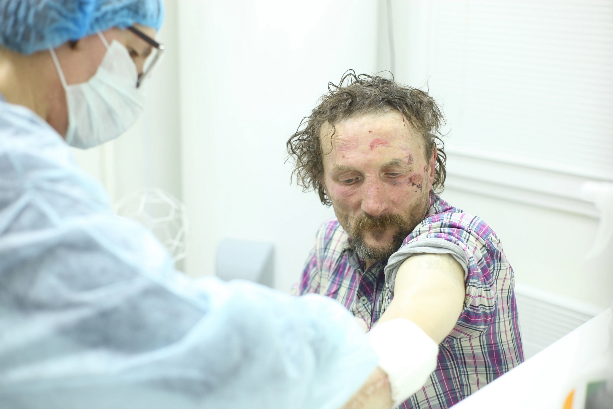 Подходят медики Благотворительной больницы, подъезжает Автобус Милосердия. Стартовые снимки приготовлений к приёму. Приют, улица – попеременно. И тут план ломается…