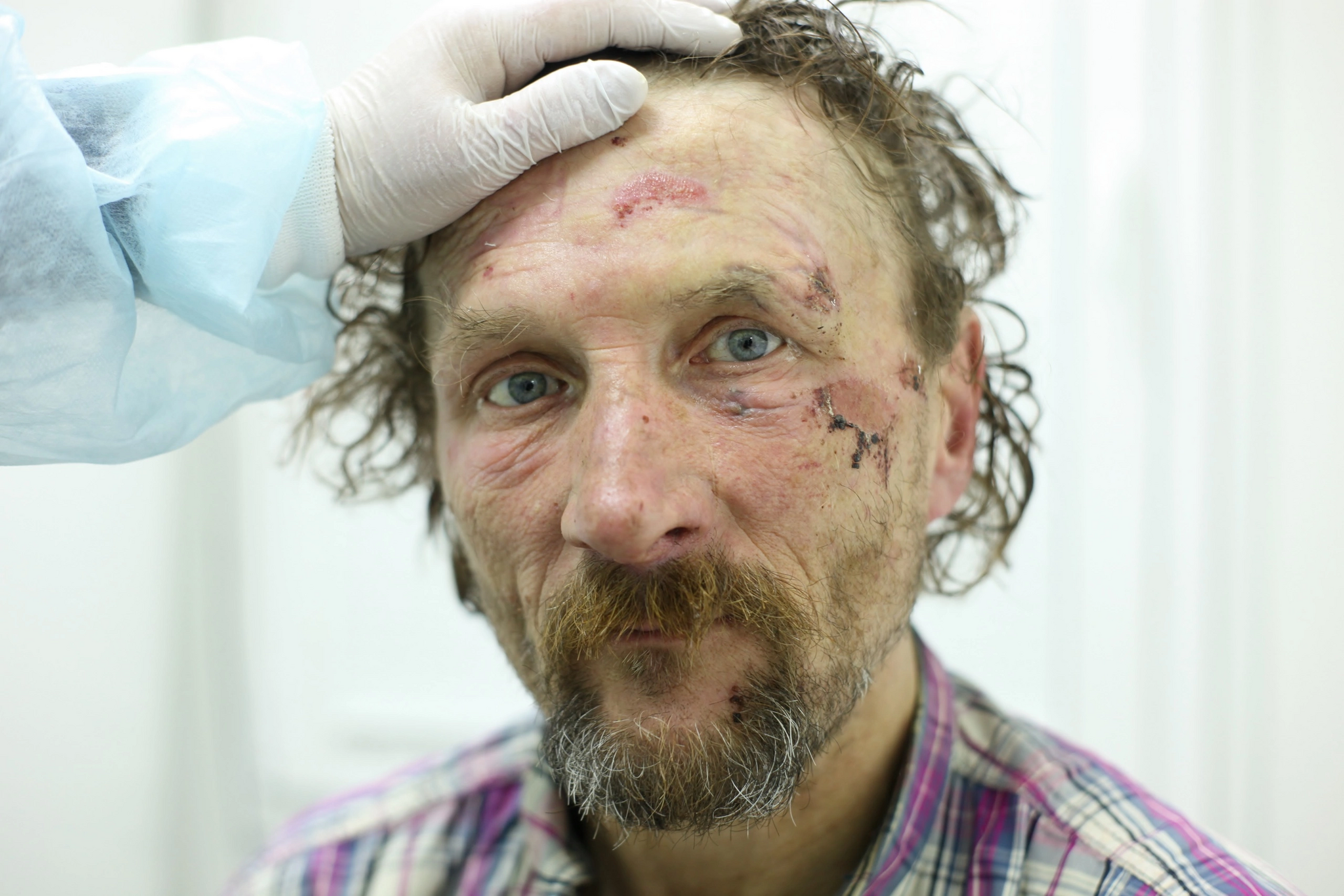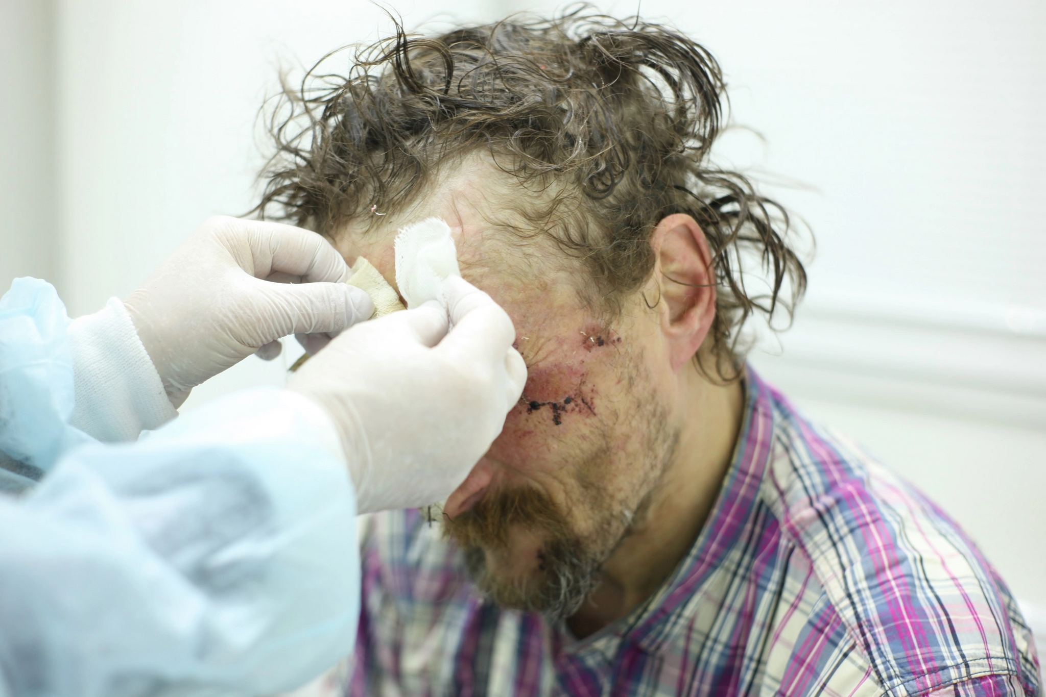 Лена приводит первого пациента. Обрабатываем, перевязываем.