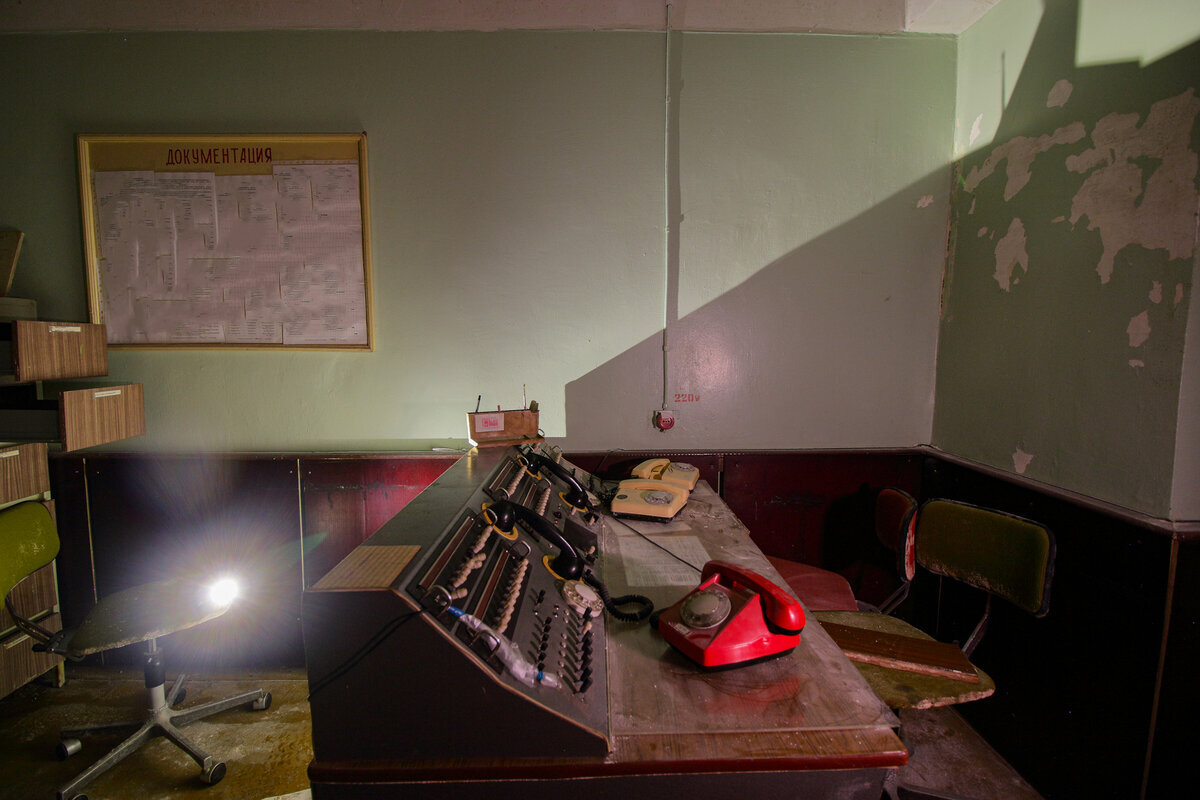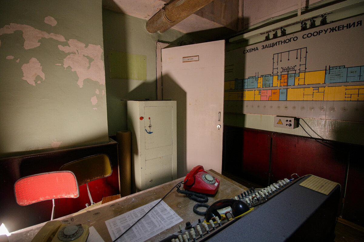 Дальше на очереди узел связи, кабинет состоящий из нескольких помещений. Пульт с несколькими телефонами обеспечивающий связь как с внешним миром, так и с внутренними отделами. Тут же висит схема убежища, со световой индикацией.