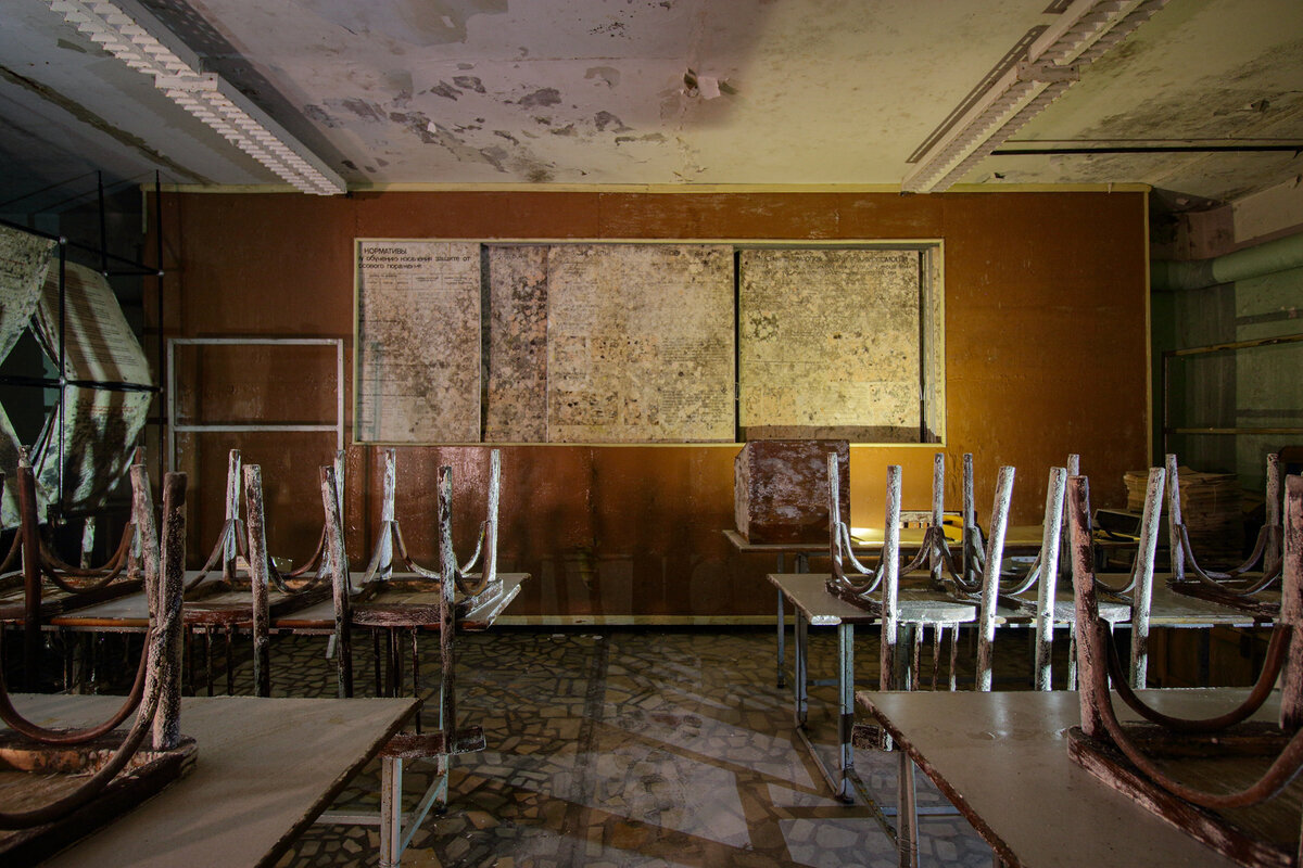 Дальше находится целый учебный класс, с десятком парт и стульями убранными будто для уборки. Тут так же гнилые плакаты, а еще стенд с противогазами, фильтрами, и информаций о действиях при чс.