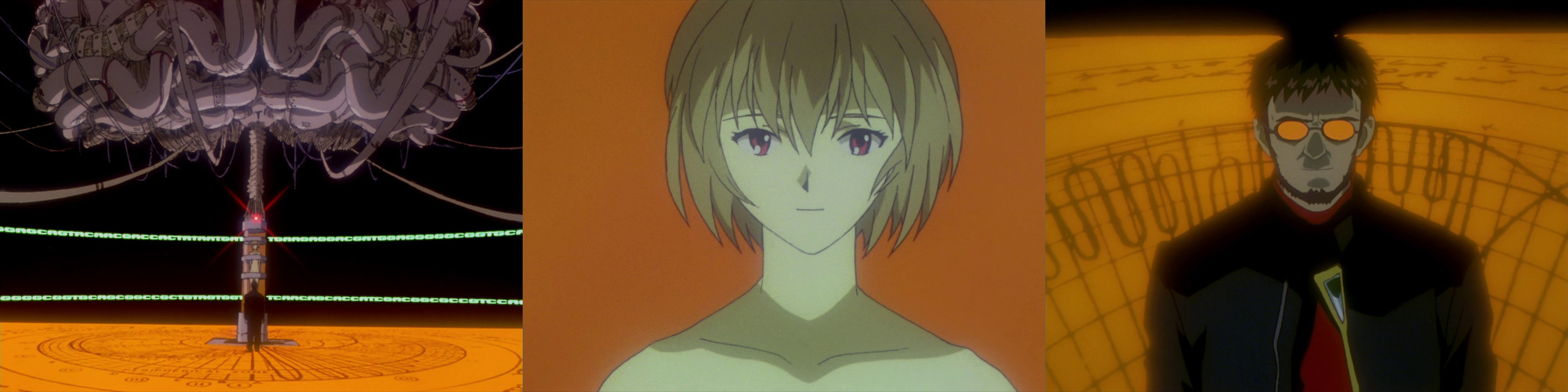Рей участвует в каком-то эксперименте в глубине штаб-квартиры NERV. Обратите внимание, что экспериментом управляет один только Гендо -- судя по сериалу он квалифицирован не хуже Акаги.