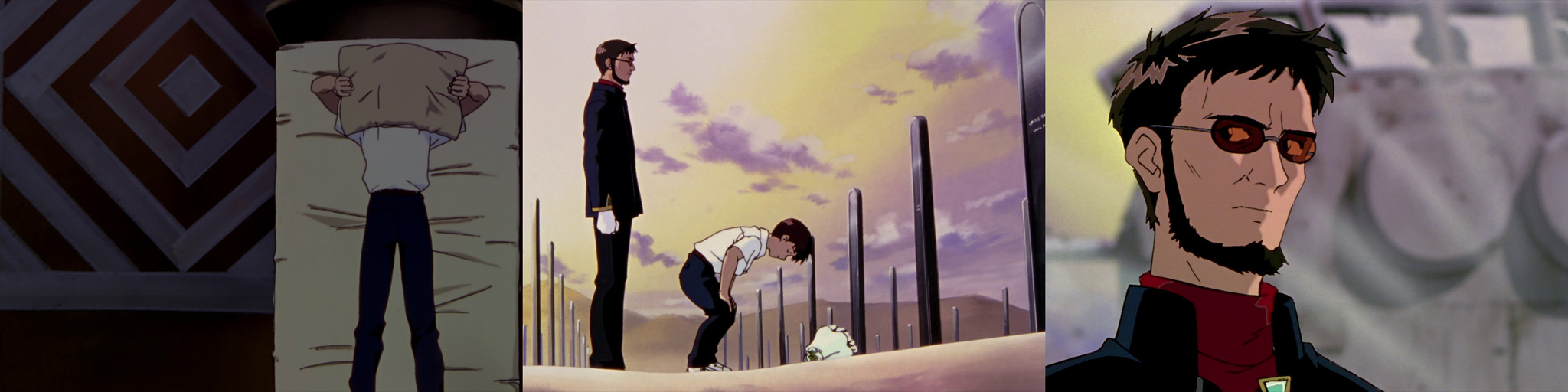 Как мы понимаем, подобные посещения могилы -- единственные события, в рамках которых Синдзи и Гендо разговоривали. Но даже в рамках него Гендо не проявляет ни капали тепла к своему сыну, формально и отстраненно реагируя на его реплики.