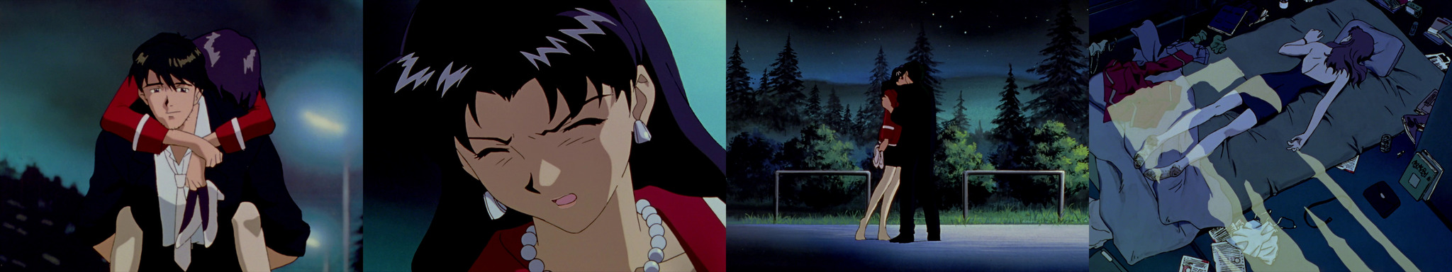 В процессе похода домой есть не до конца ясная сцена -- Мисато и Кадзи показаны в подворотне так, что это можно расценить и как секс, и как то что Мисато блюёт, а Кадзи её держит.