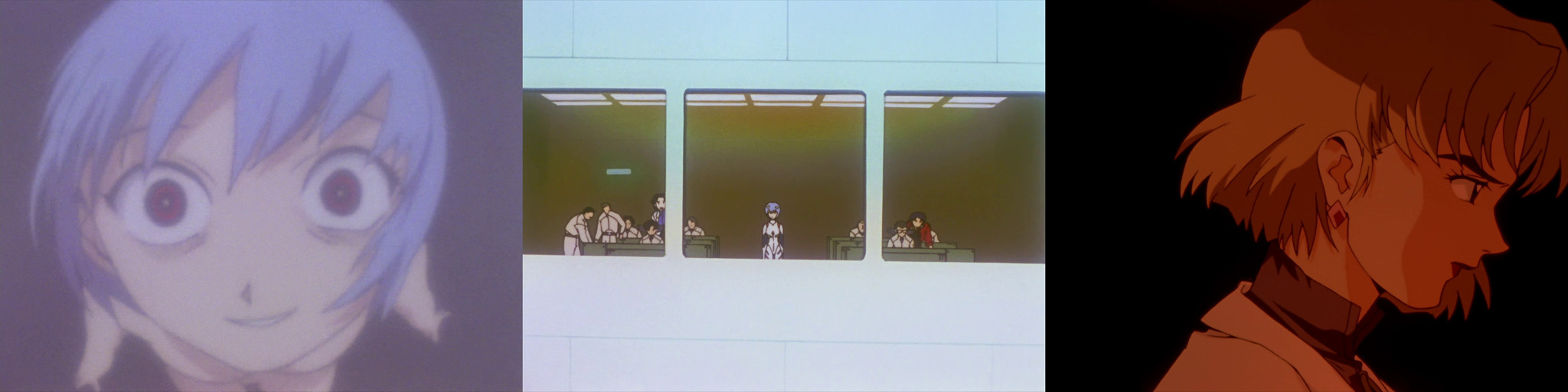 Жутка Рей I. Обратите внимание на цвет волос Рицко (женщина позади левого разделителя). "Я думаю, что Ева-00 пыталась убить меня"