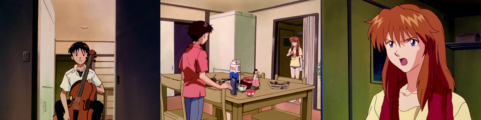 Аска сильно ревнует, понимая что Мисато и Кадзи где-то задерживаются вместе и ... предлагает Синдзи поцеловаться. Синдзи сначала не понимает зачем, но Аска берёт его на слабо и они целуются.