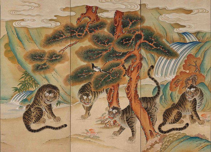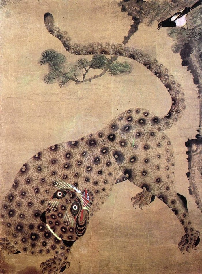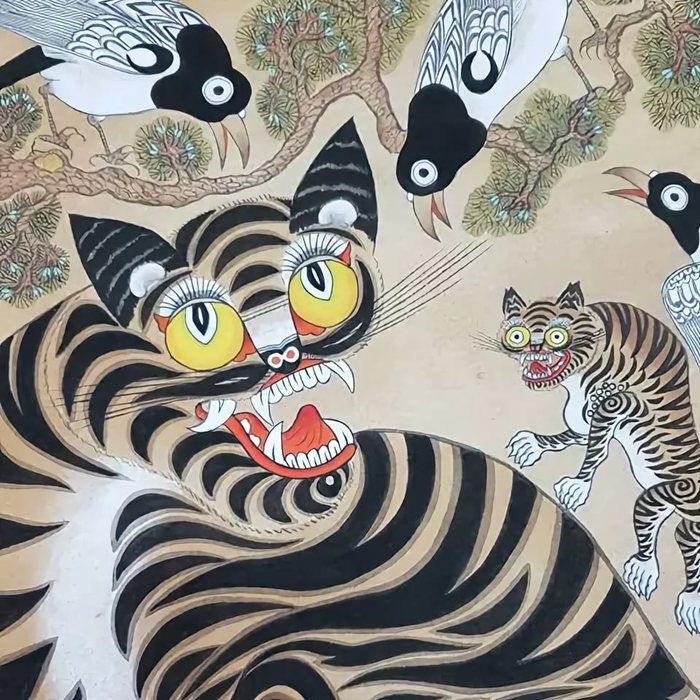 Широкое распространение в народной живописи Кореи получил сюжет тигра и сороки. Смысл таких картин трактуется по-разному, в зависимости от того, в какой части жилища они располагаются. В доме шамана тигр символизирует дух гор, а сорока — его помощника и ученика.