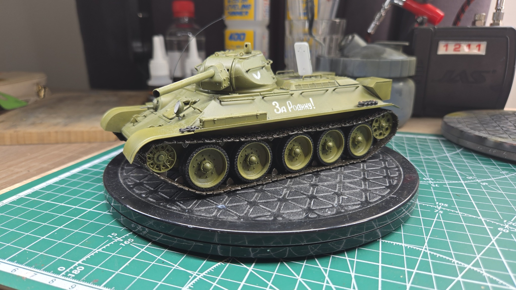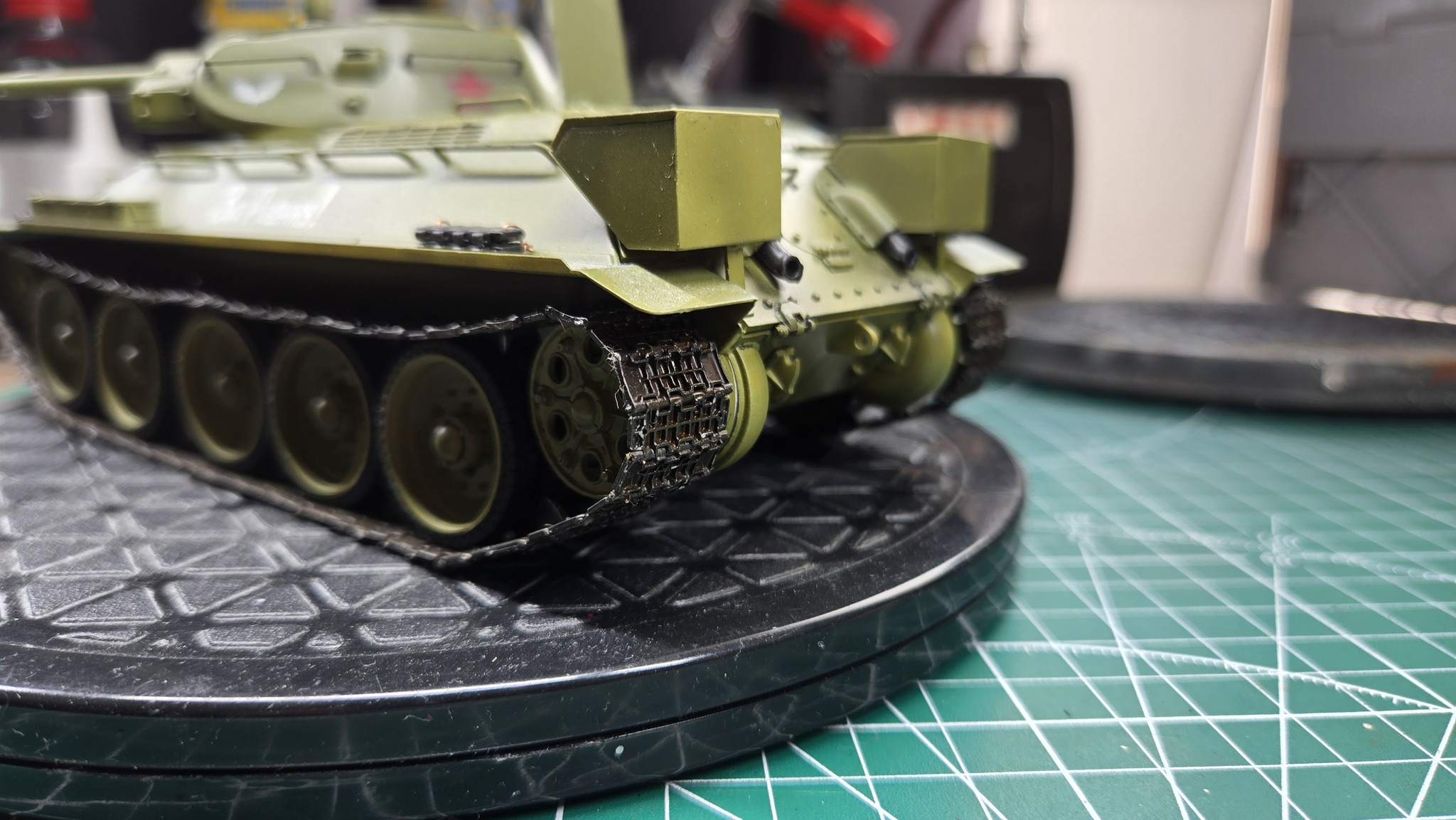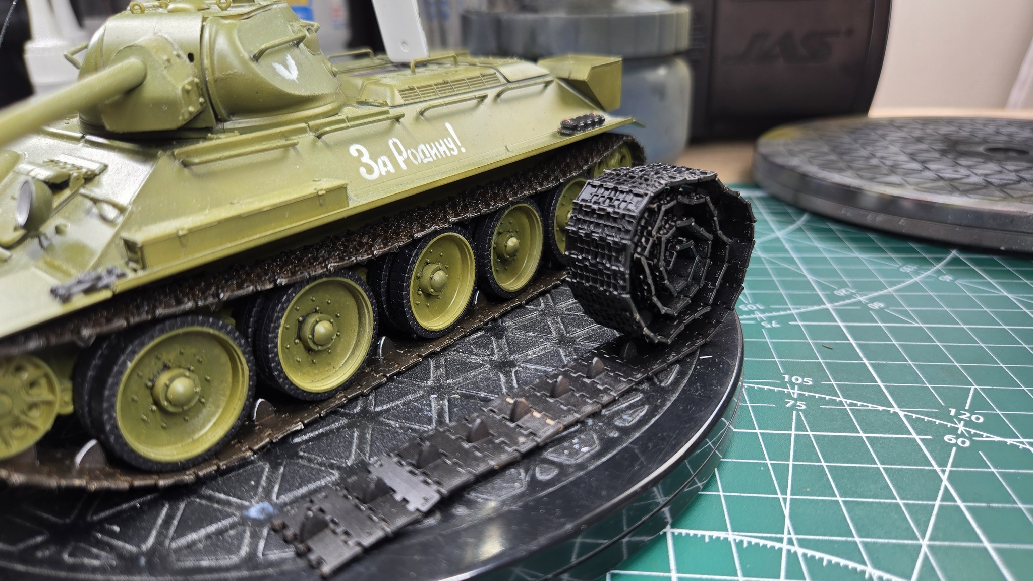 Ну и напоследок нанёс трафаретом знаков. Опять же, внимательный глаз заметит, что на следующих фото есть разные гусеницы - сначала одни, потом другие. Всё потому, что сначала я нацепил туда печатные гусли и только через несколько месяцев мне дошли металлические, на которые я, собственно, и заменил печатные. Всем приятного просмотра! Как всегда готов к конструктивной критике и диалогу в комментах :)