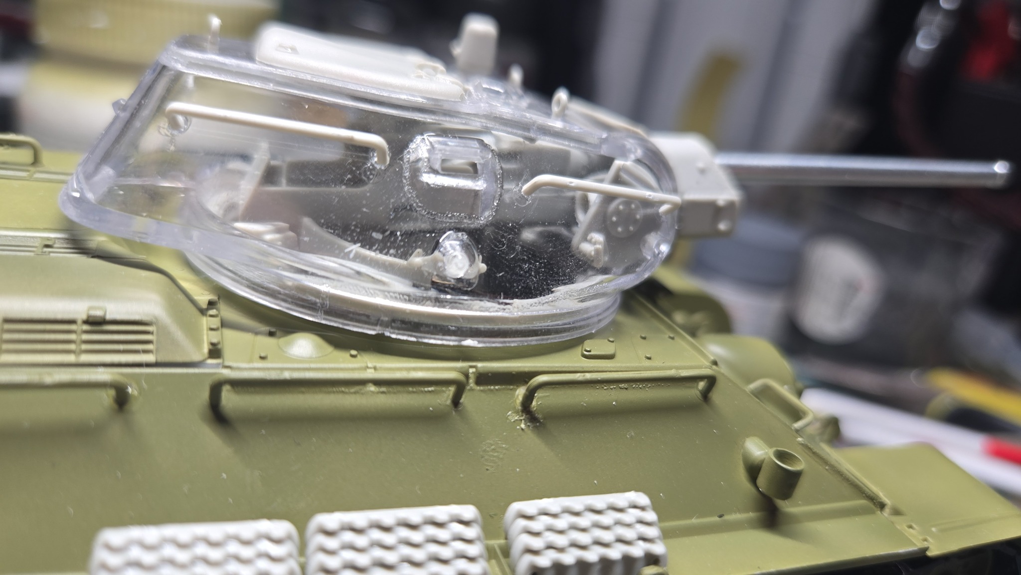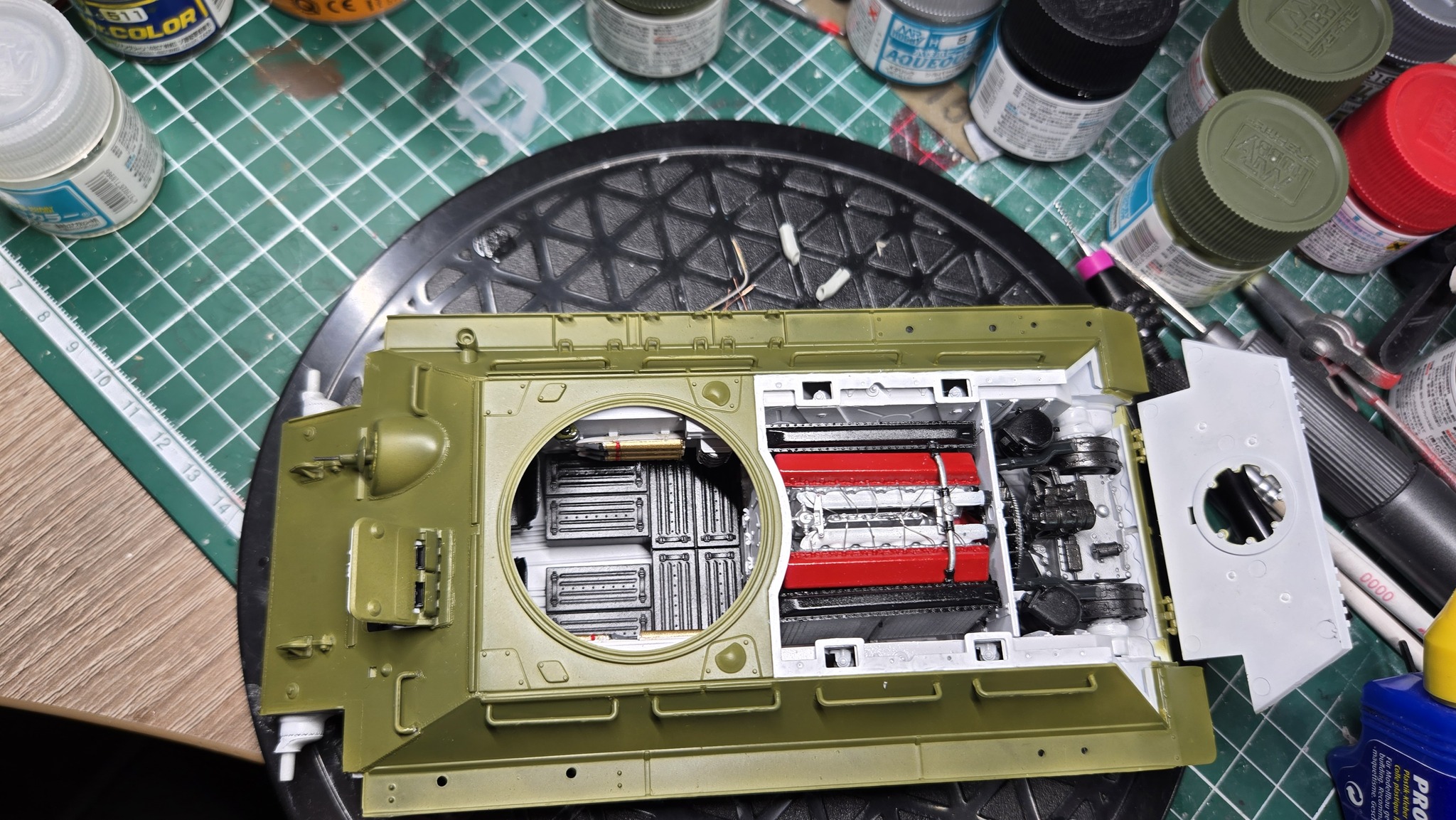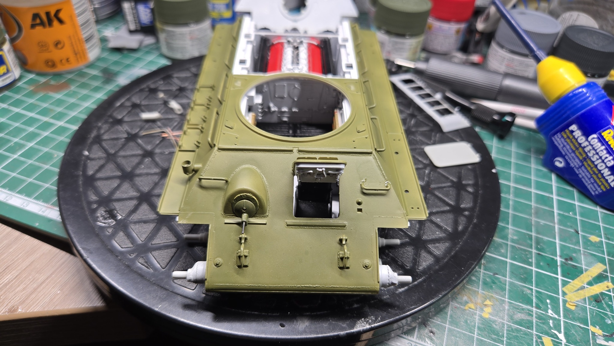 Тут ещё хотелось бы отметить сам набор от AFV Club. Из коробки планируется, что корпус и башня будут прозрачными, но я решил отгородиться от возни с прозрачными крупными деталями на первый раз и залил всё в русский зелёный.