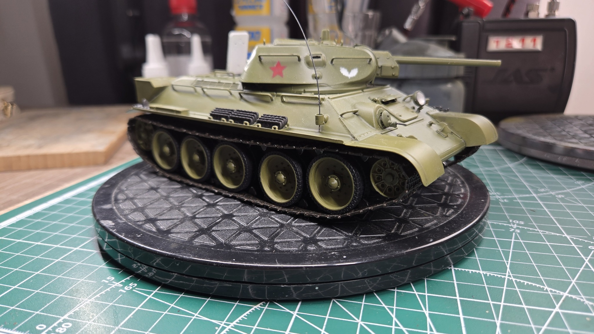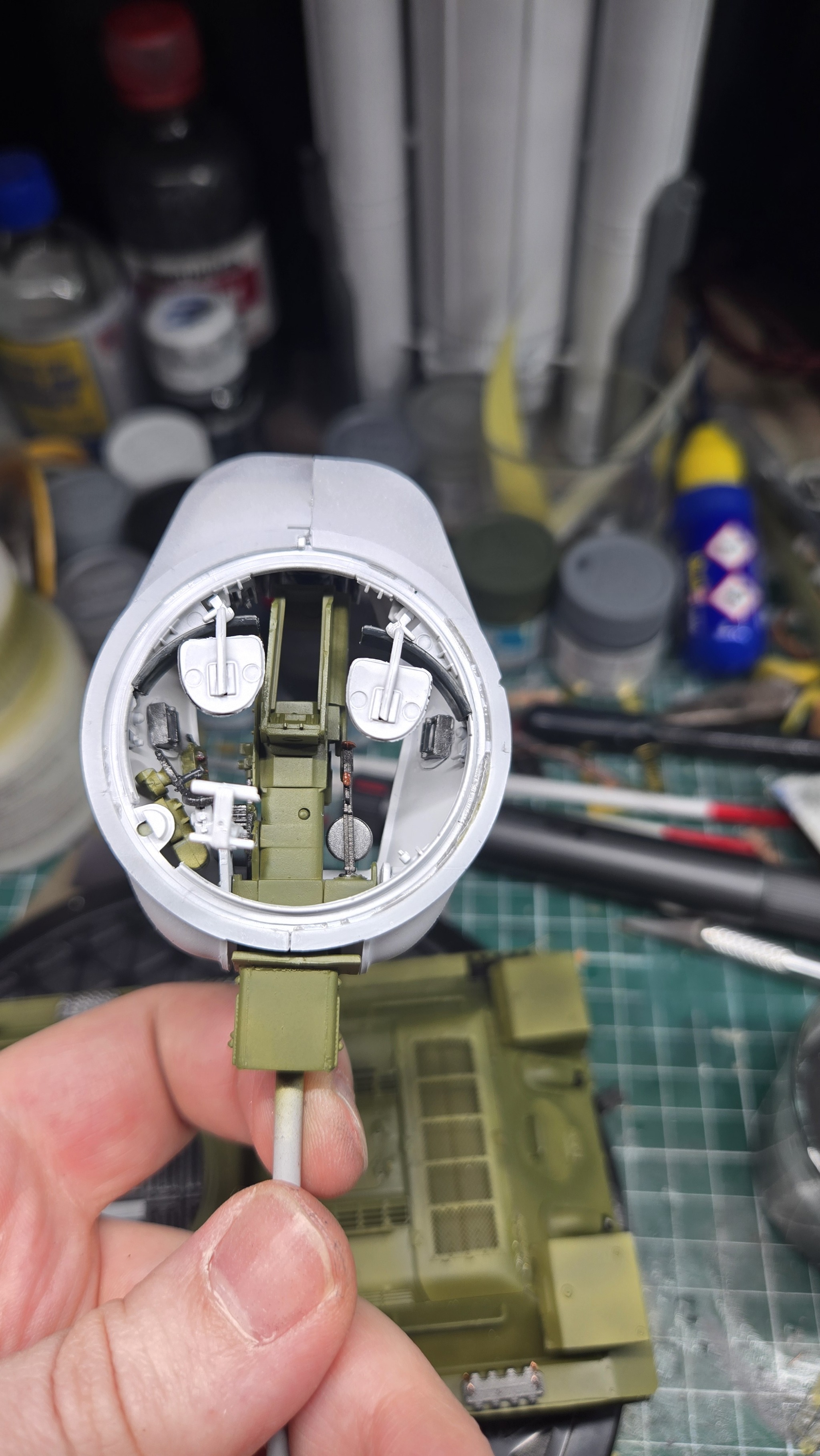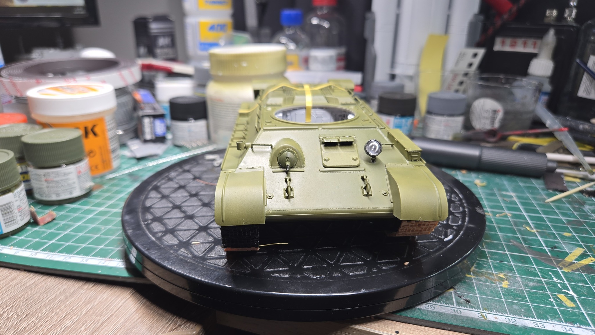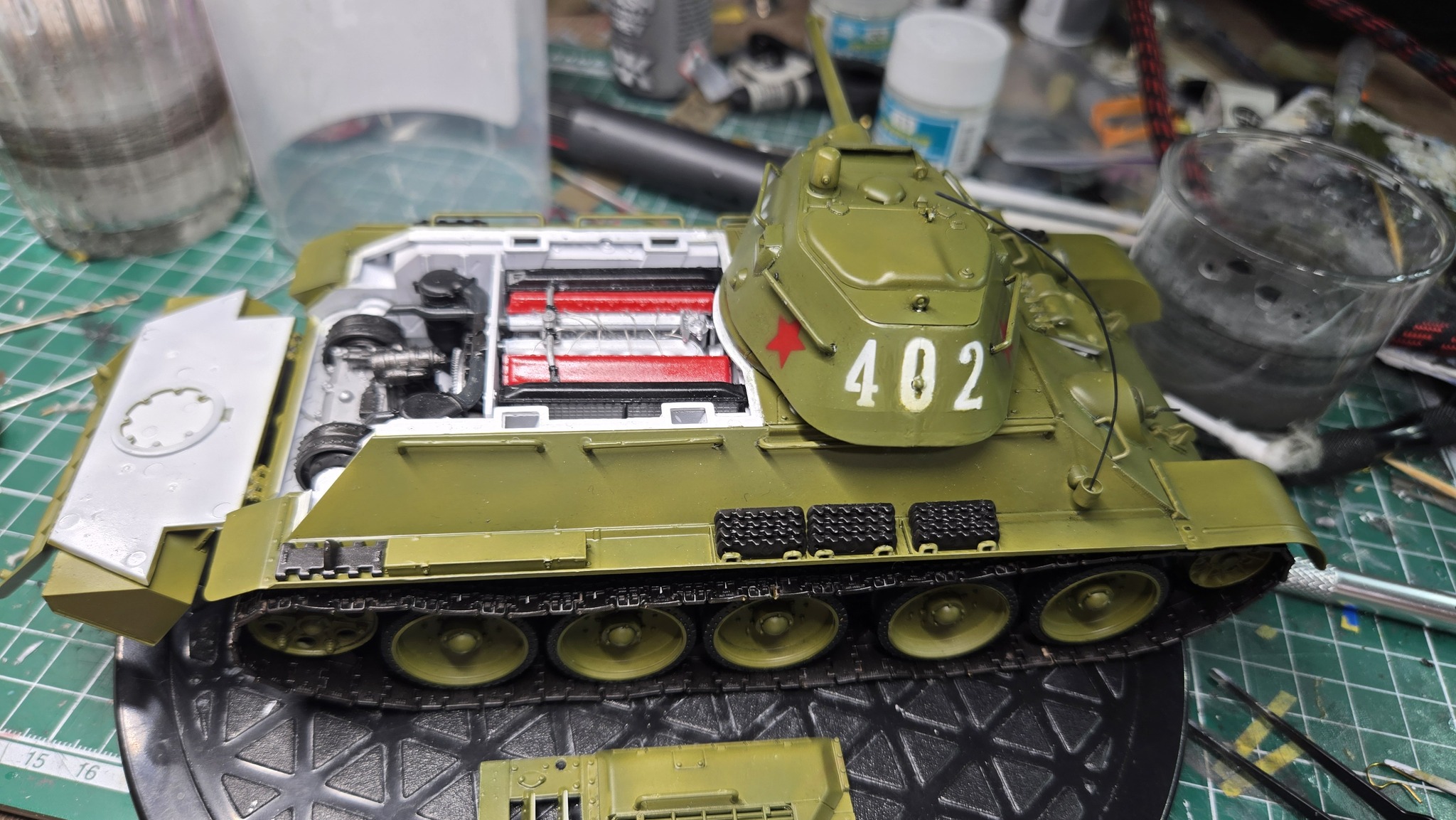 Тут ещё хотелось бы отметить сам набор от AFV Club. Из коробки планируется, что корпус и башня будут прозрачными, но я решил отгородиться от возни с прозрачными крупными деталями на первый раз и залил всё в русский зелёный.