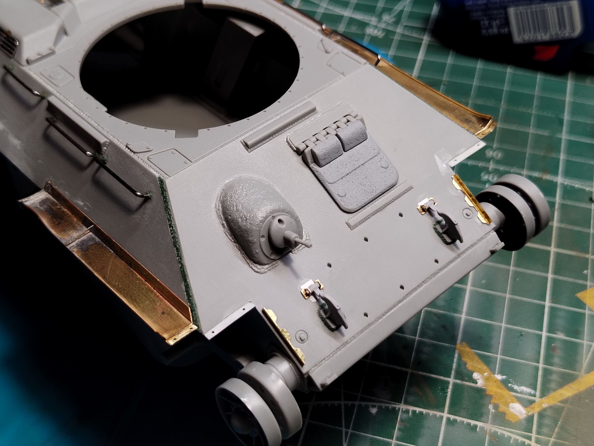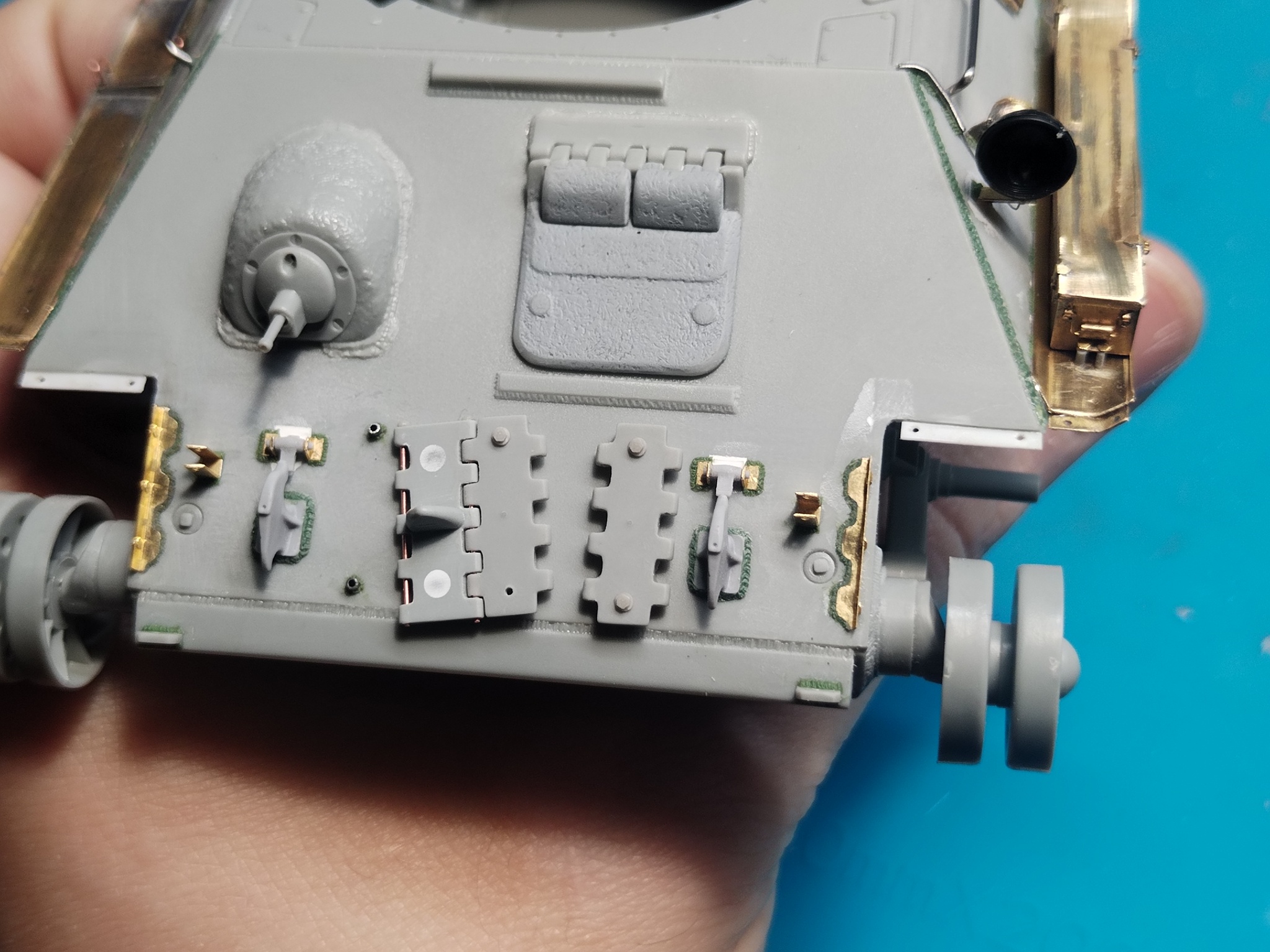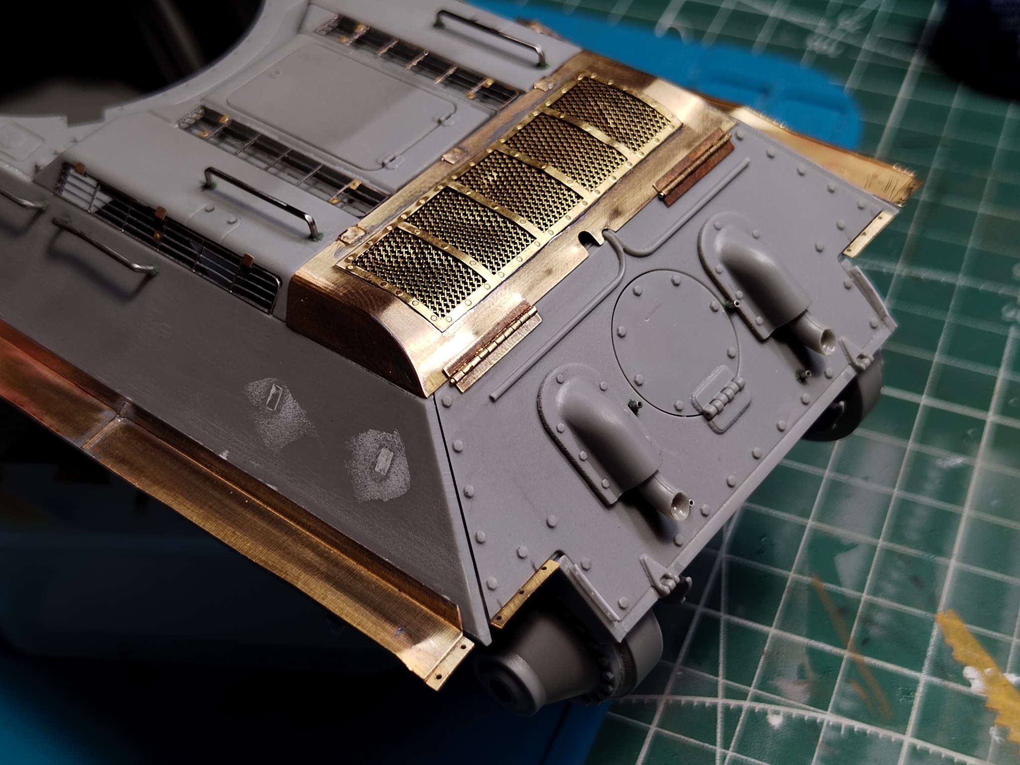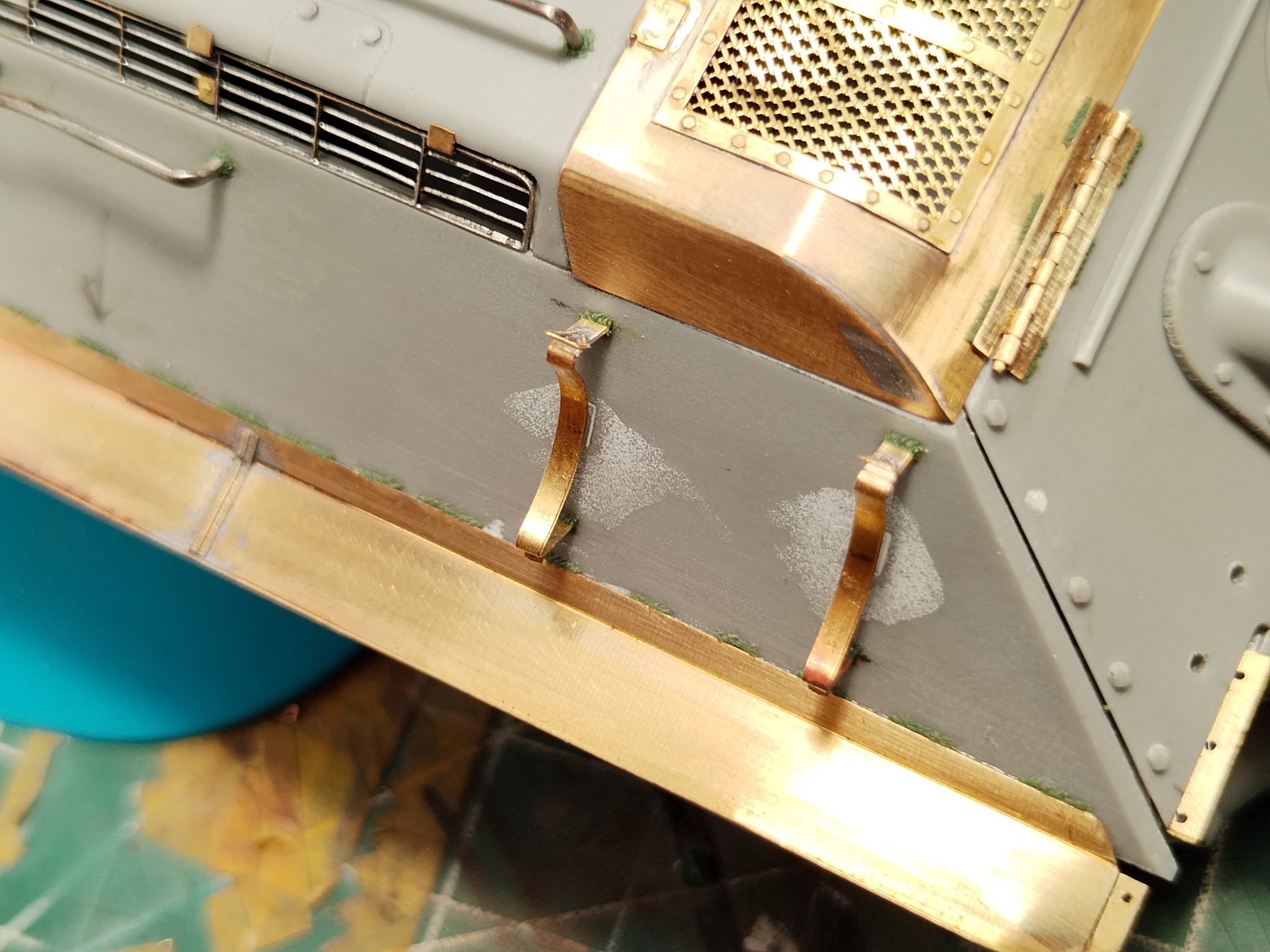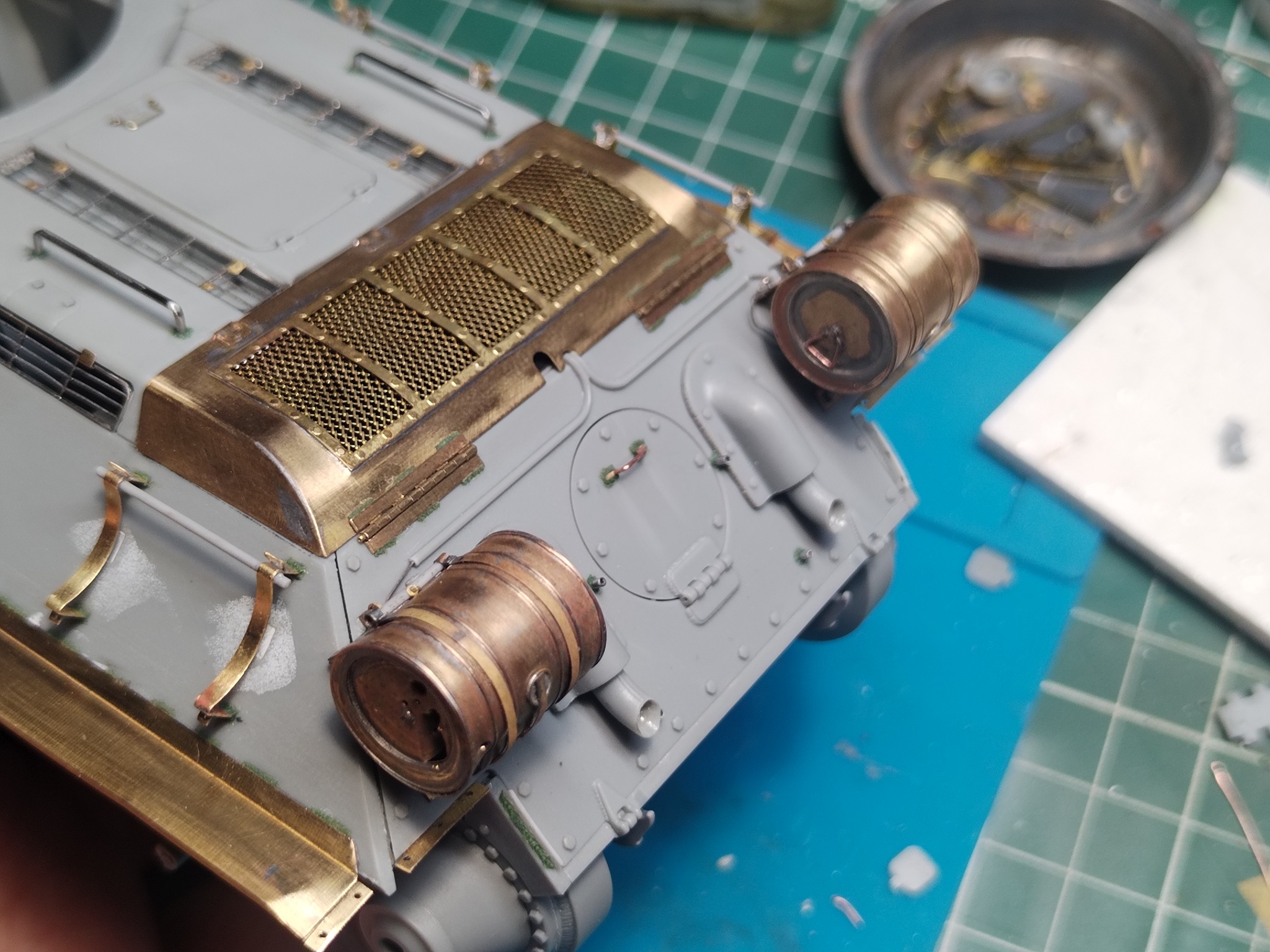 Дальше по доработкам: расточил выхлопные патрубки, спаял из травления крышку жалюзей отвода воздуха, сделал из иглы от шприца бонки крепления печки. Снова добавил детали крепления брызговиков, так как сзади их тоже не будет. Ну и обязательный атрибут для моделей Т-34 — травлёные жалюзи воздухопритока, без них никуда.