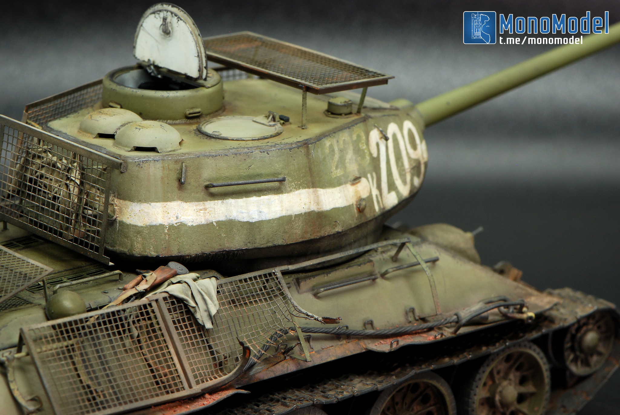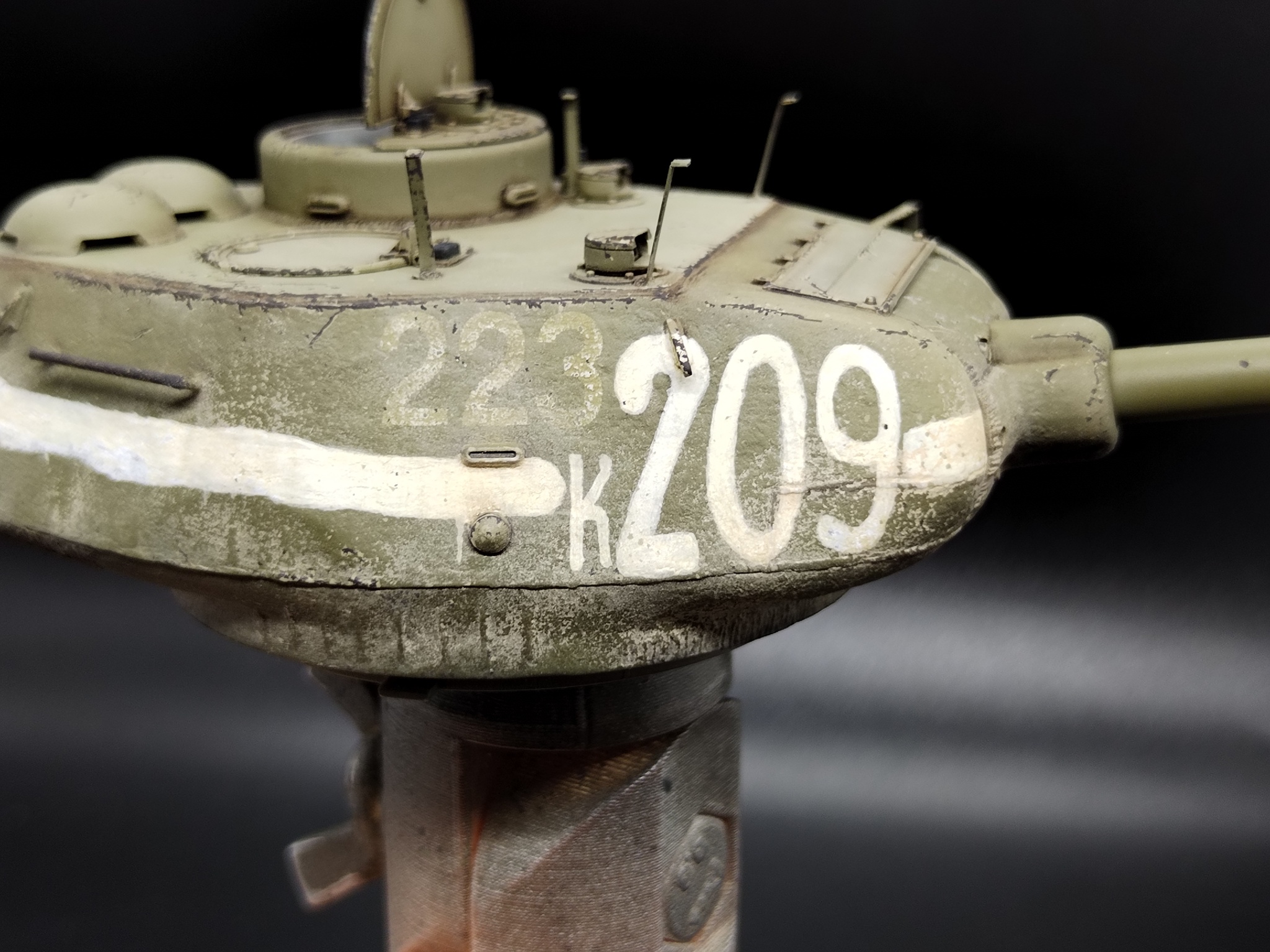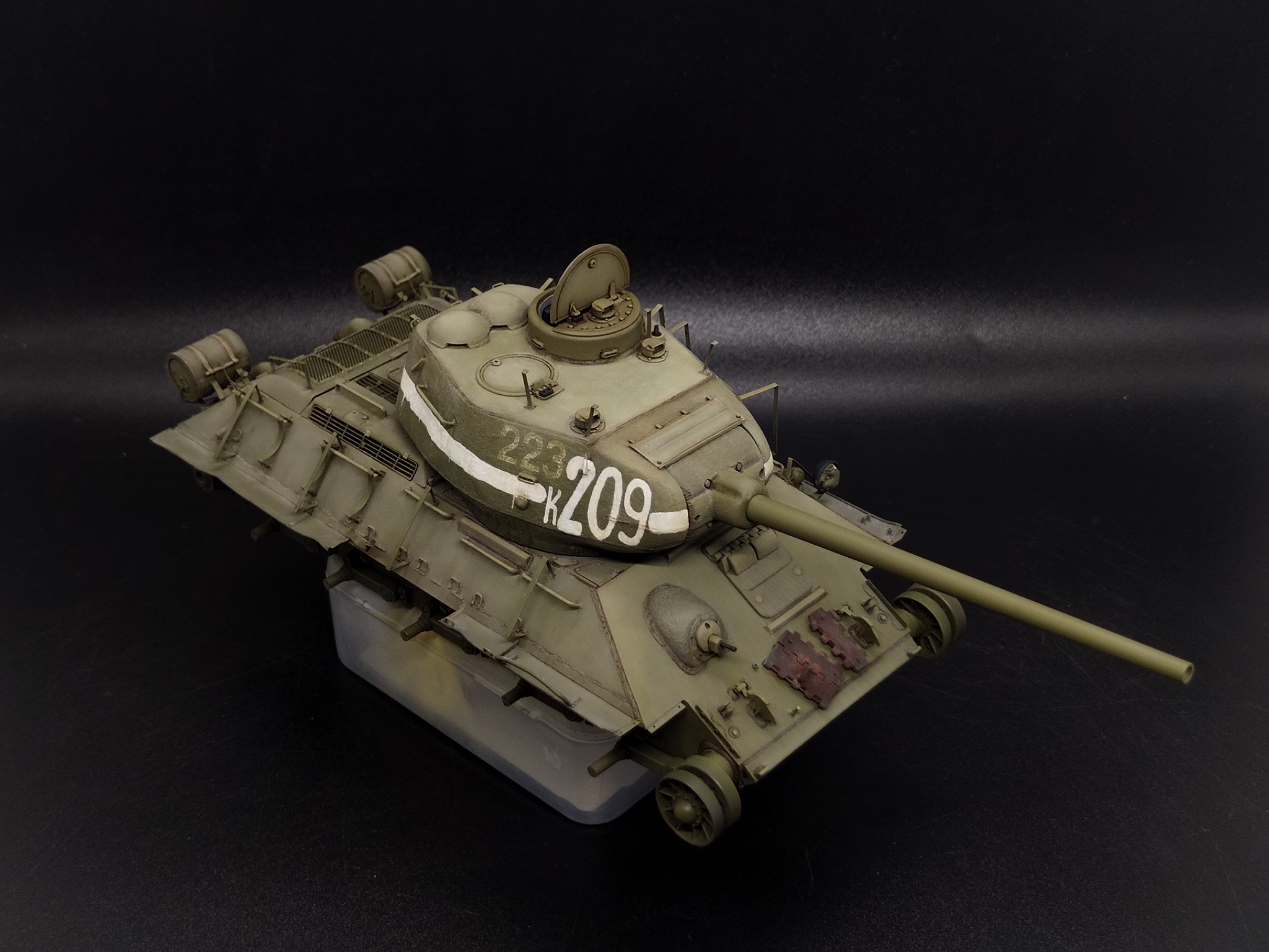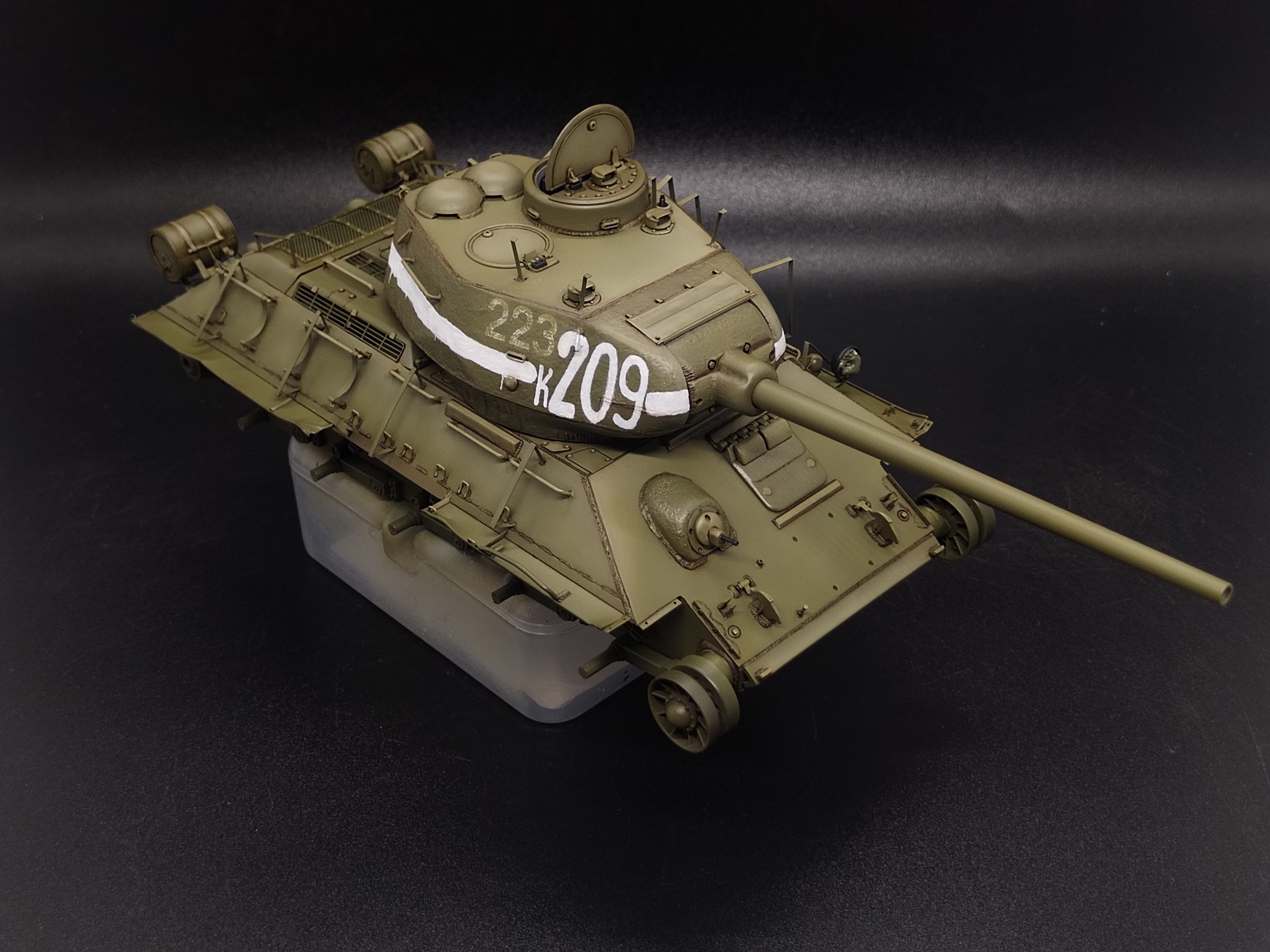 В работе кит от Dragon, который они с юмором окрестили «Т-34-85 c броней из пружинных кроватей». Сбирать «просто из коробки» — скучно. Покопавшись в архивах, нашёл танк завода №183 с катками-«пауками» и — главное — с двумя номерами: старым, бледным, и поверх него новым, жирным «К-209». На снимке он с оторванной полкой и здорово пожеванным экраном. Вот они — характер и история в одном кадре.