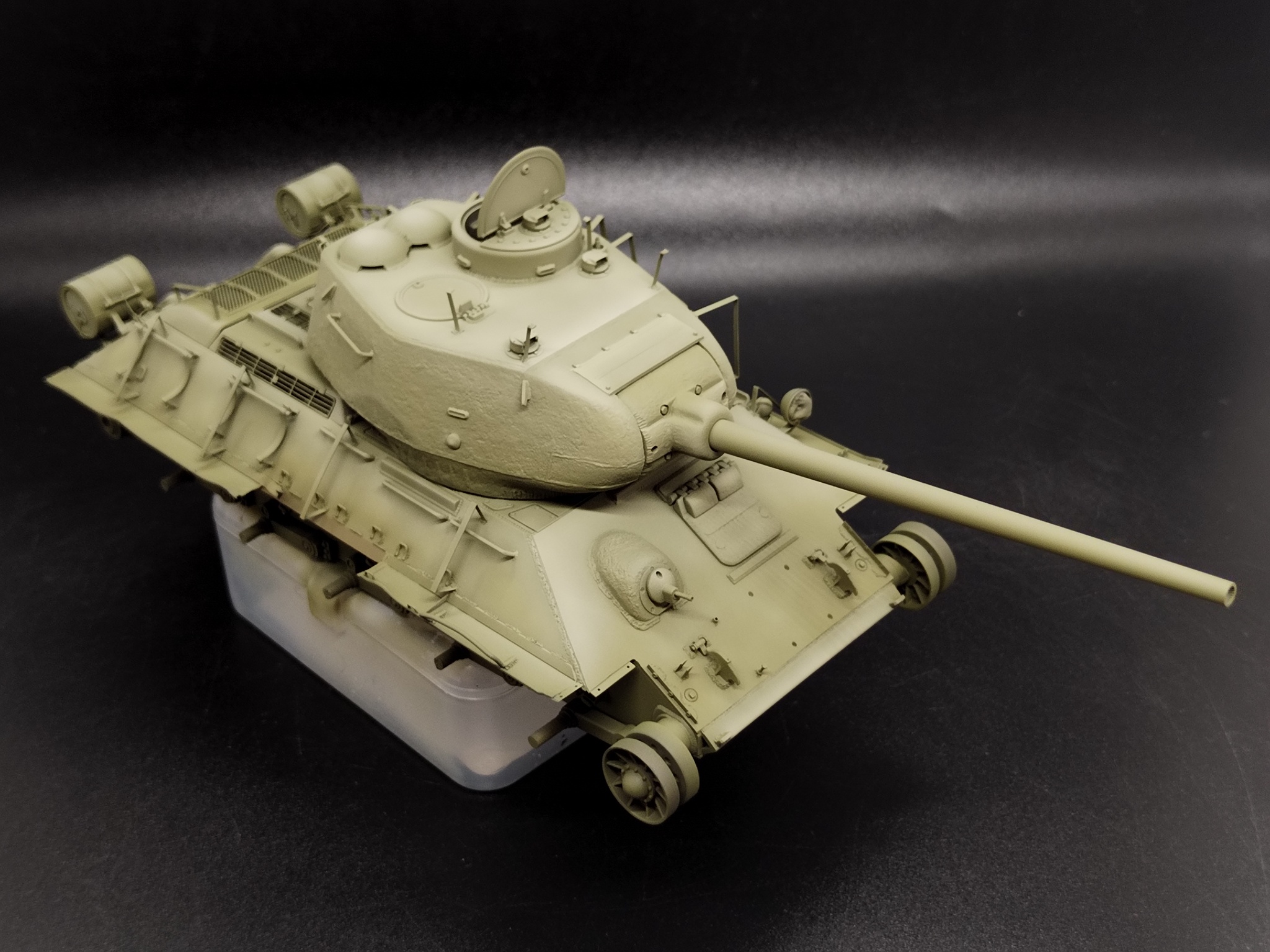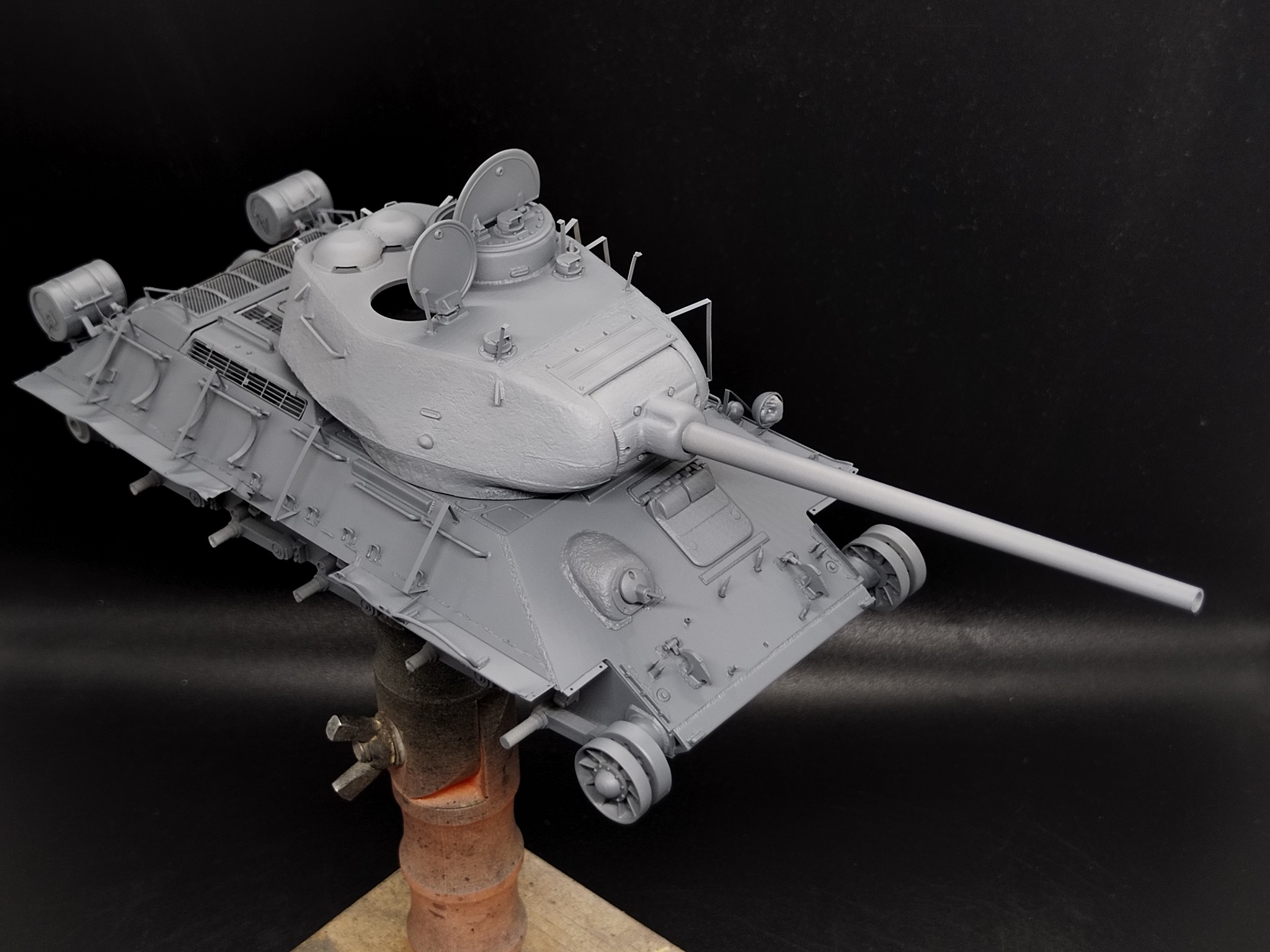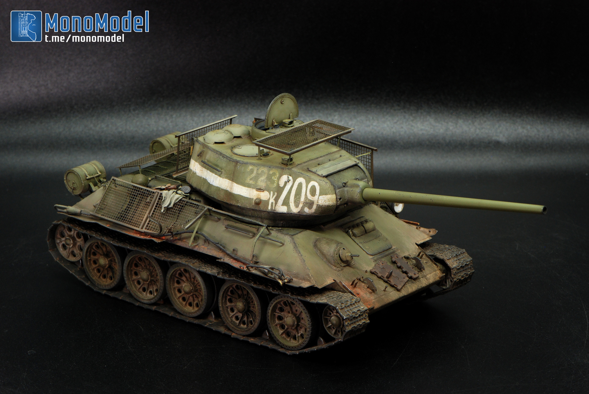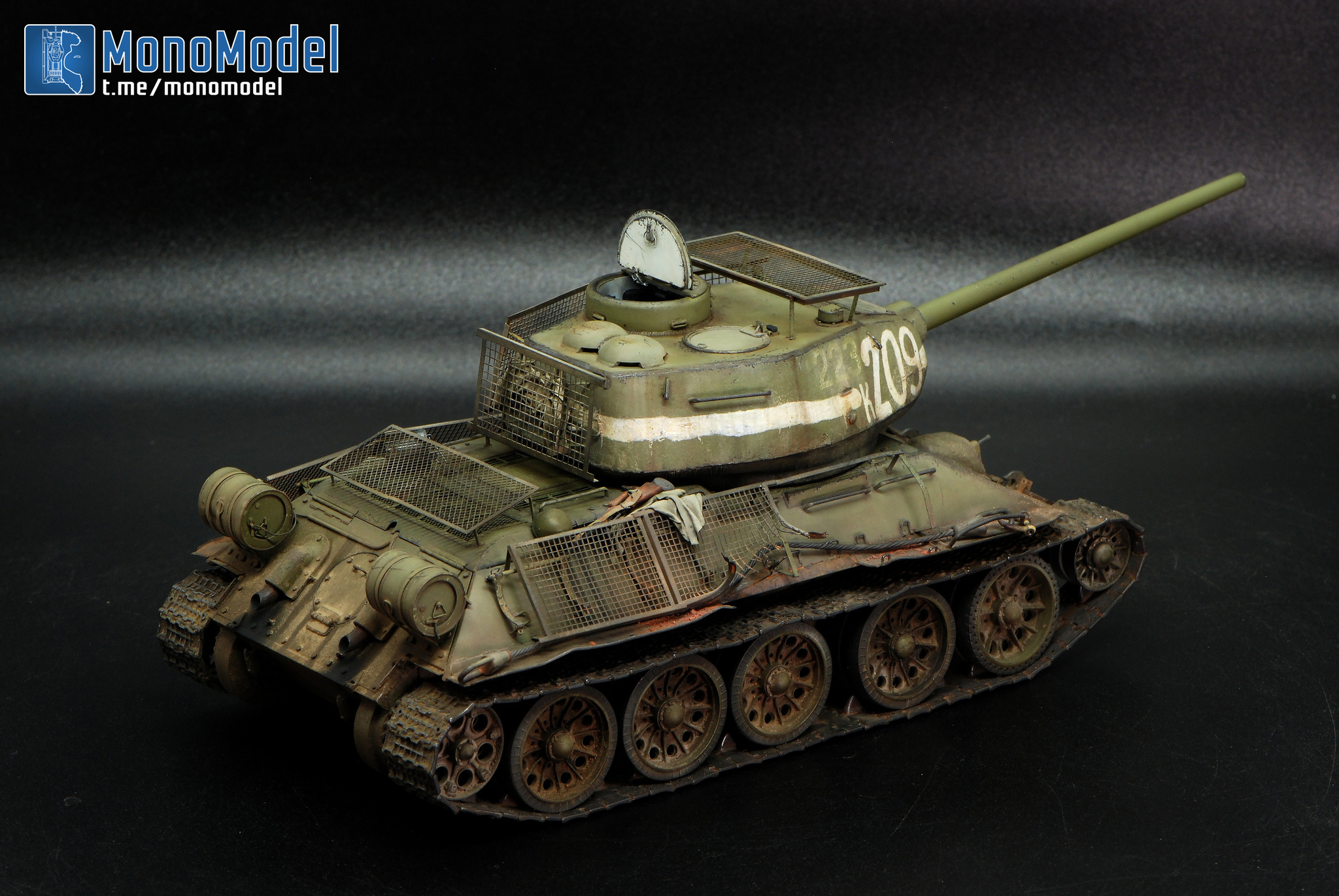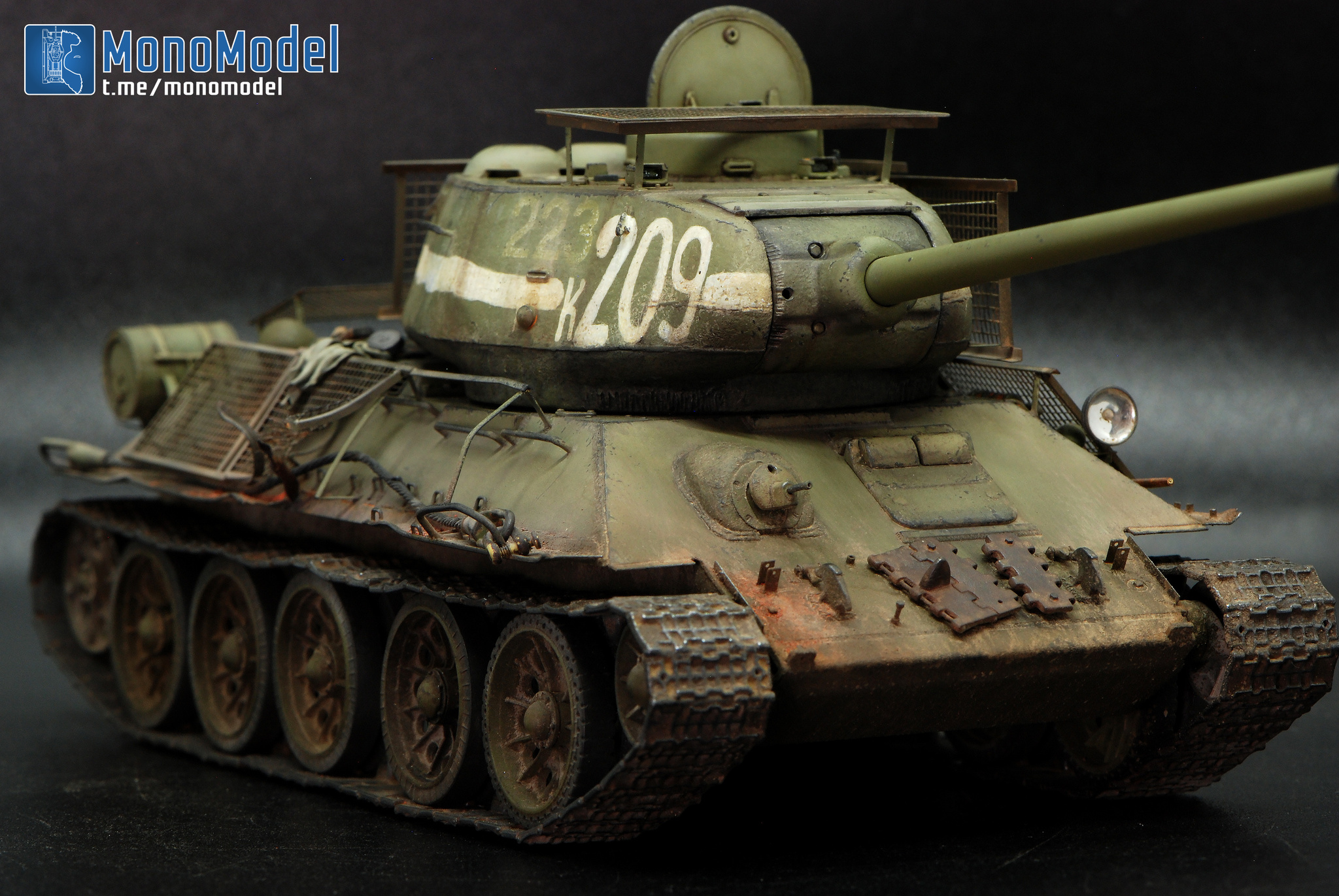 В работе кит от Dragon, который они с юмором окрестили «Т-34-85 c броней из пружинных кроватей». Сбирать «просто из коробки» — скучно. Покопавшись в архивах, нашёл танк завода №183 с катками-«пауками» и — главное — с двумя номерами: старым, бледным, и поверх него новым, жирным «К-209». На снимке он с оторванной полкой и здорово пожеванным экраном. Вот они — характер и история в одном кадре.