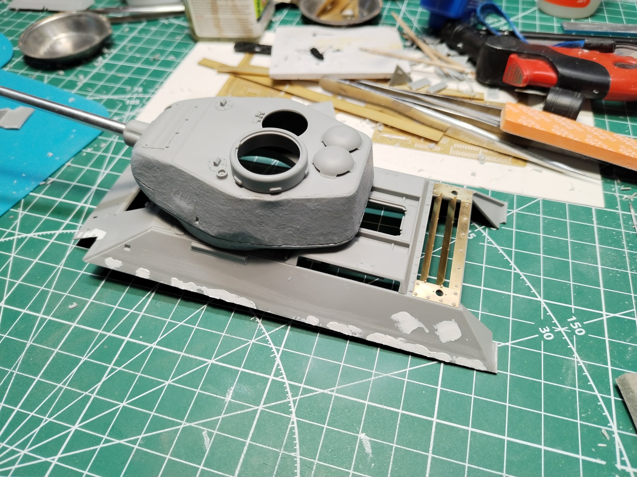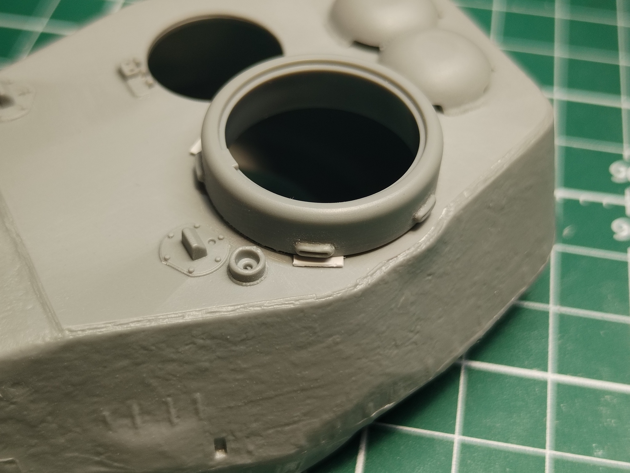 Чтобы всё исправить, пришлось полностью сварной шов под родную башенку. В образовавшуюся щель я вставил пластиковые подкладки. Только после этой подготовки можно было начинать сделать новые, правильные швы, которые уже соответствовали бы размеру башенки, большой командирской башенке. Конечно сделал заново и литьевой шов пов сей башне.