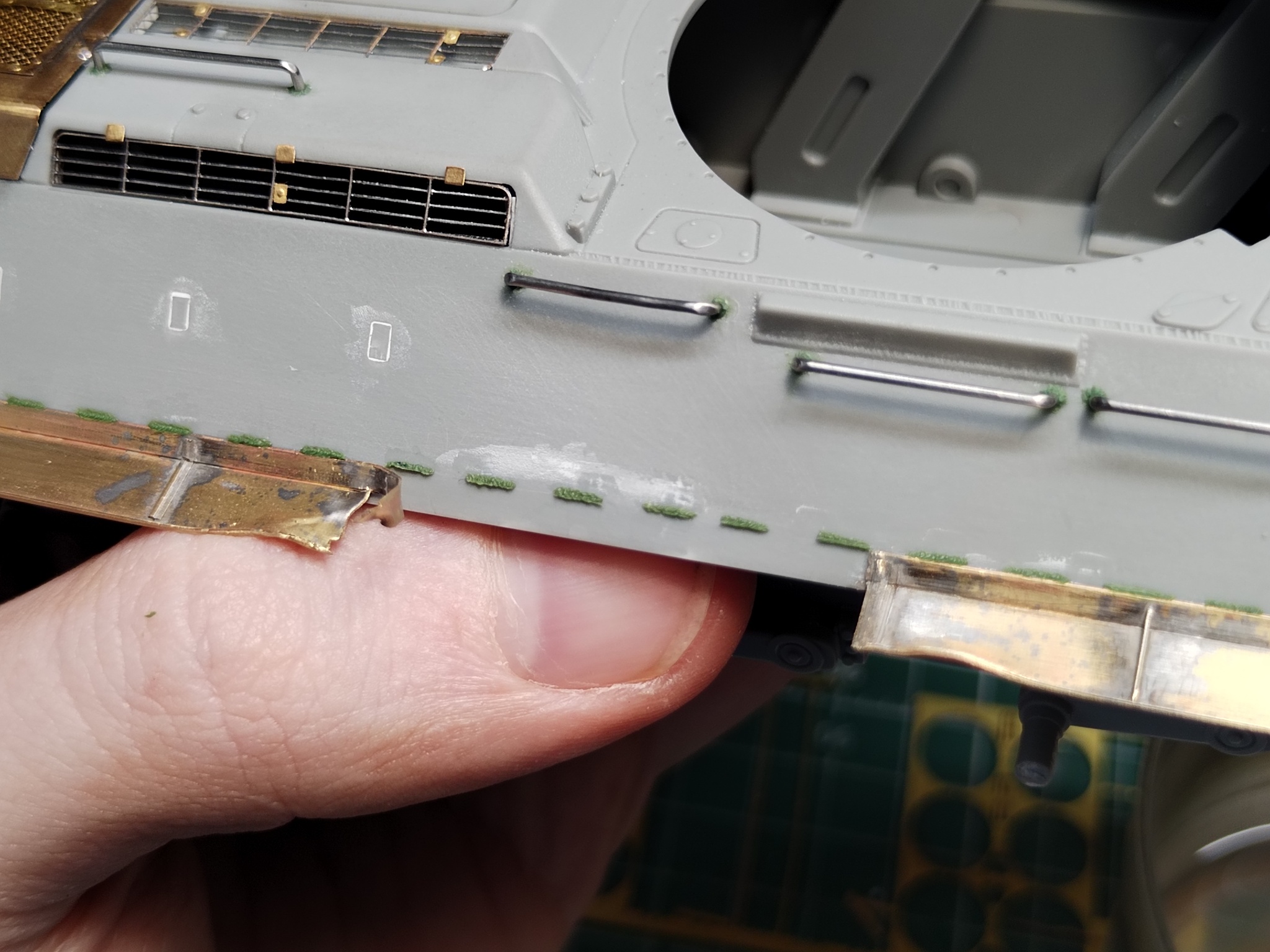 Куда же без сварных швов: сделал их на полках, «обварил» все поручни, петли, крепления брызговиков, участки, где оторвана полка, крюки, крепления баков и экранов. Швы сделал из Green Stuff, выполняя работу в четыре захода, чтобы случайно не испортить уже готовые и чтобы верхние детали не мешали прорабатывать нижние.