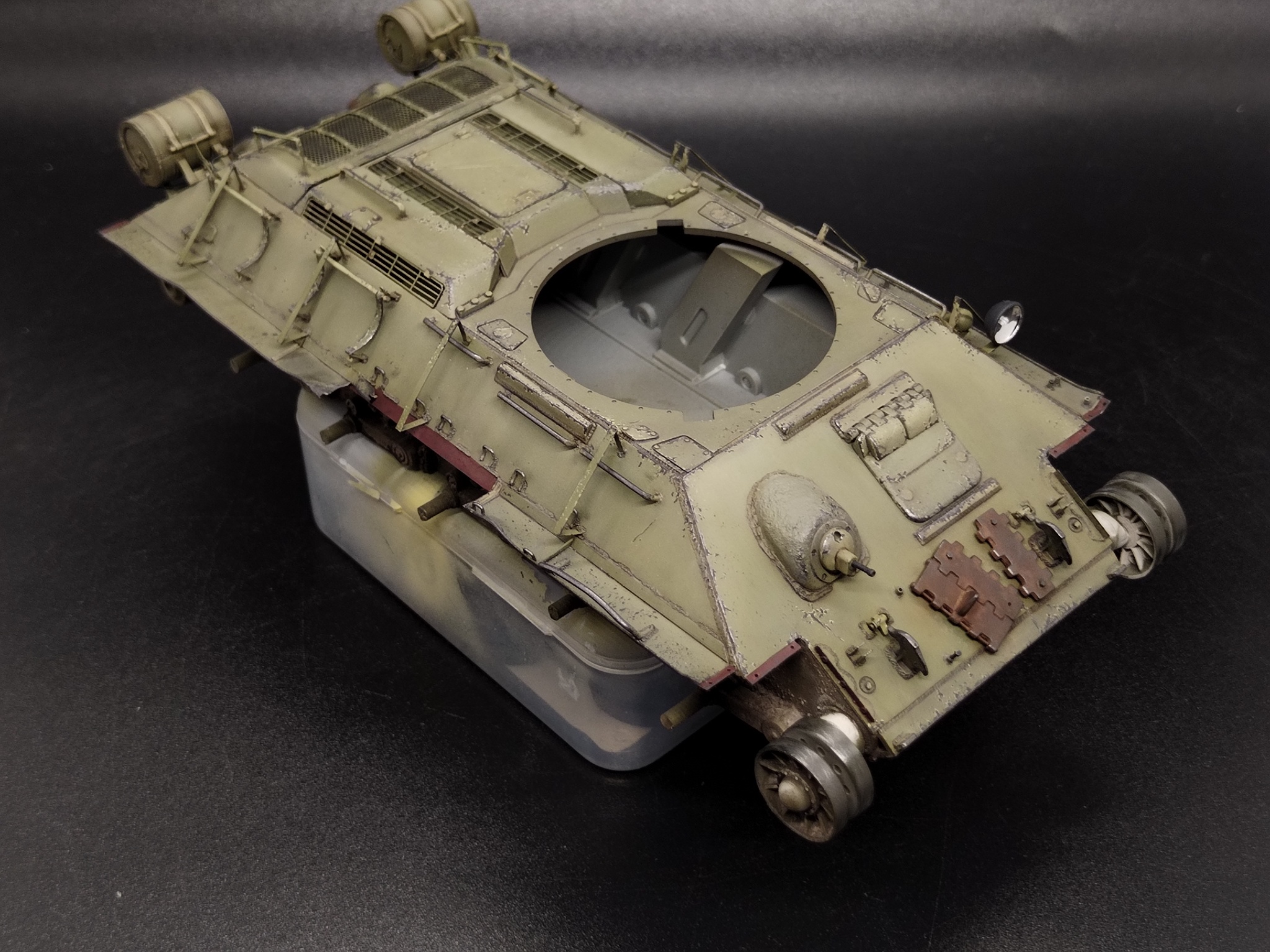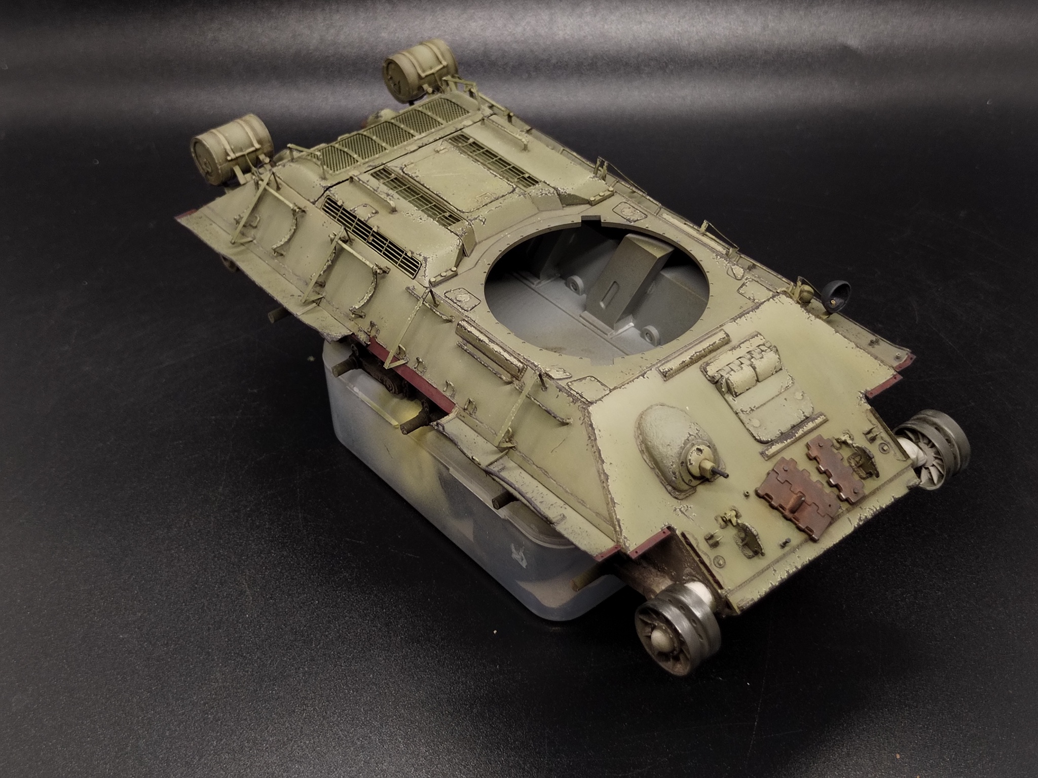 На сколы у меня всегда уходит непропорционально много времени. На одну башню — часов пять. Я не тороплюсь, прорабатываю каждый лючок, каждую кромку. Делаю двухслойные сколы: сначала цвет сколотой краски, потом, внутри, жженую умбру. Знаю, что получается с перебором, но опыт подсказывает: последующие слои фильтров, пыли и грязи съедят 30-40% яркости. Отдельно проработал места, где на прототипе были сняты брызговики и оторвана полка — там нанёс сколы до цвета грунта (железного сурика), так как эти детали, скорее всего, и не красились.