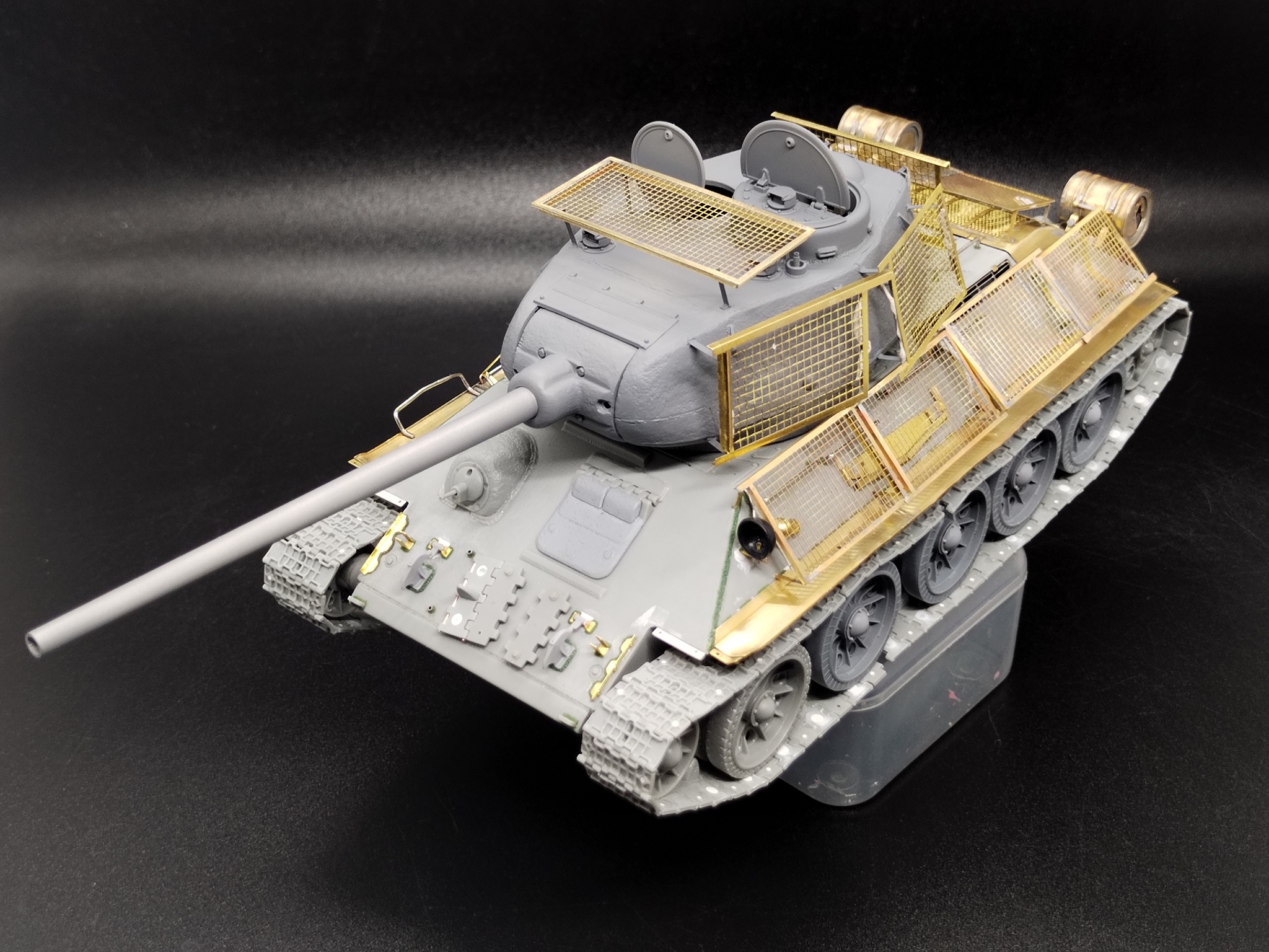 Dragon-овский набор, честно говоря, разочаровал. За эти деньги получаешь пластик с историческими нестыковками, сетки, которые не подходят к прототипу, и полное отсутствие вменяемой разметки для их установки. Вывод: если хочешь собрать точный берлинский Т-34 с экранами, лучше взять пластик от «Звезды», травление от «Микродизайна» и квадратные сетки, а потом всё собрать и подогнать самому. Будет и правильнее, и, как ни парадоксально, проще. Но когда последняя деталь приклеена, а модель уезжает на финальную фотосессию, все эти мытарства отходят на второй план. А впереди уже ждёт следующая коробка из стопки.