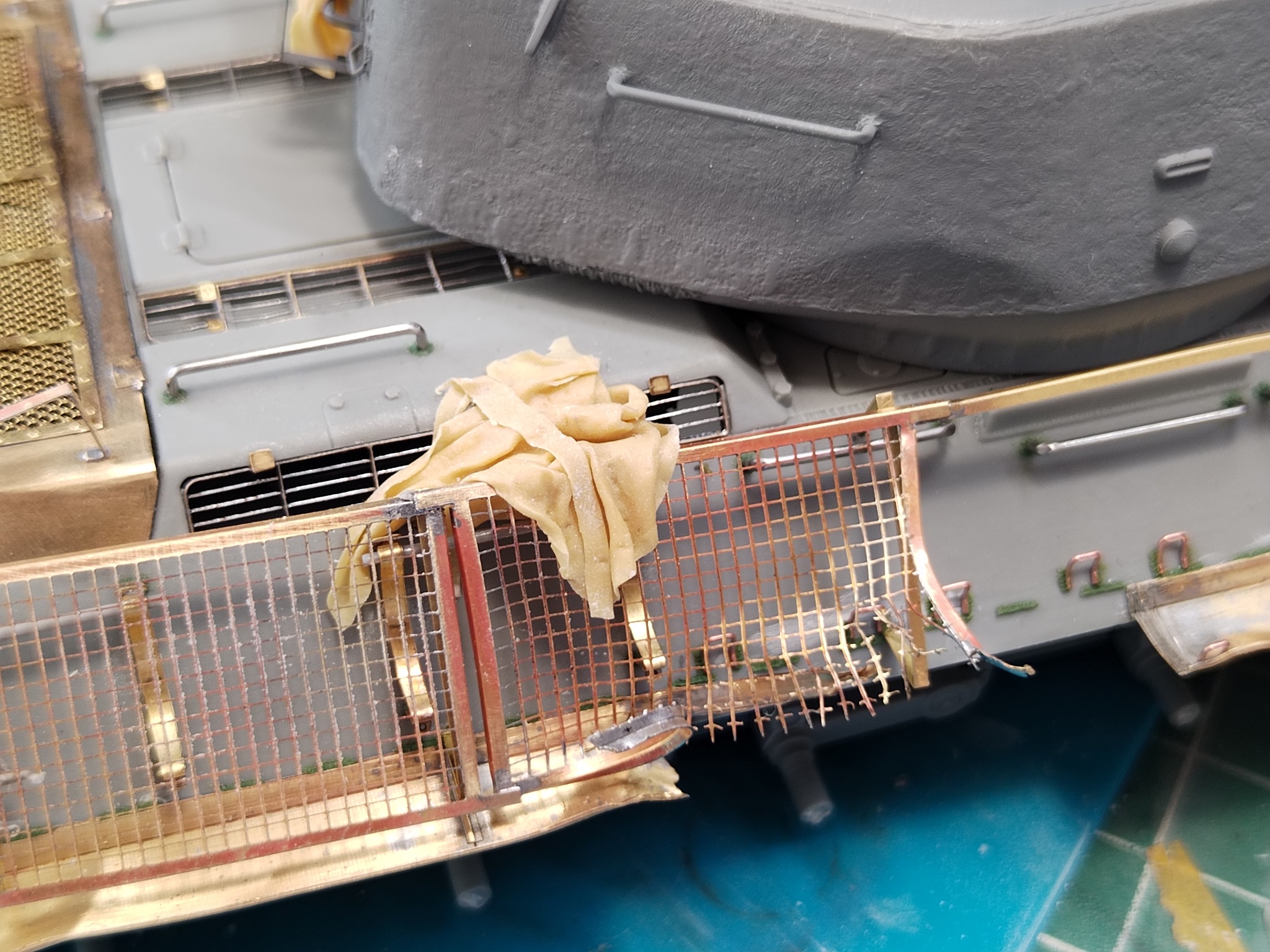 Самое обидное открытие ждало с сетчатыми экранами, ради которых всё и затевалось. Dragon в одной коробке умудрился положить несовместимые вещи. Их пластик — под машину 183-го завода, а сетки, как выяснилось, по размерам и рисунку подходят только к прототипам с корпусами завода №112. На моём прототипе сетки корпуса сделаны из квадратных ячеек, а все производители (и Dragon, и МД) давали ромбики. Пришлось импровизировать: бортовые сетки я собрал из башенных сеток от «Микродизайна». Сделал четыре секции, убрал ящик ЗИП (его на фото не было) и изобразил на правом борту характерный загиб и повреждение, как на архивном снимке.