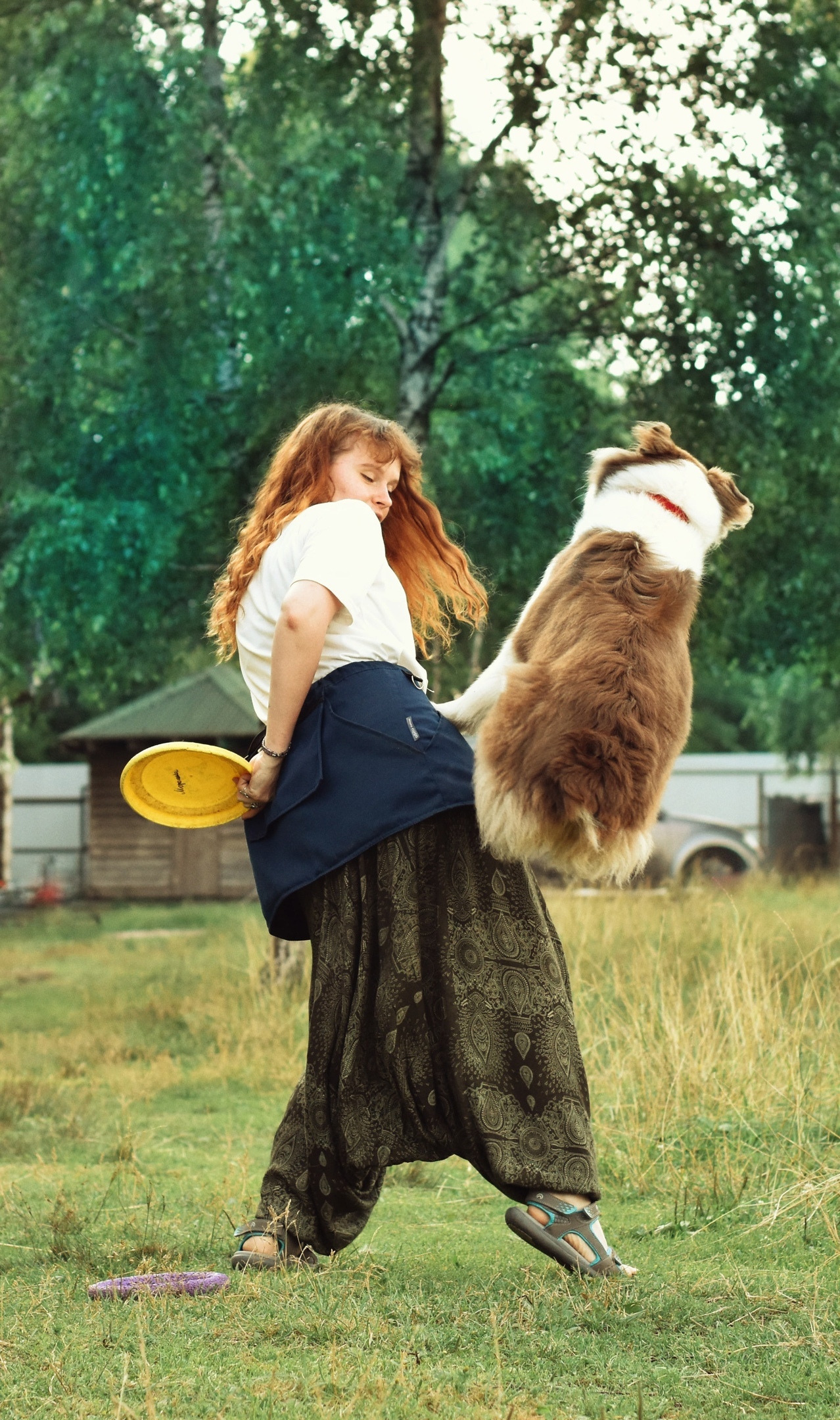 Собаку зовут Морошка, порода - аусси (австралийская овчарка). Также вы можете ее знать по нашумевшей фотографии в образе Морошкалянджело и - нашу пару по передаче "Лучший пёс на ТВ3", где мы заняли первое место в своем выпуске. Дополнительно Морошка занимается пастьбой, фрисби, иногда снимается на телевидении и путешествует вместе с нами.