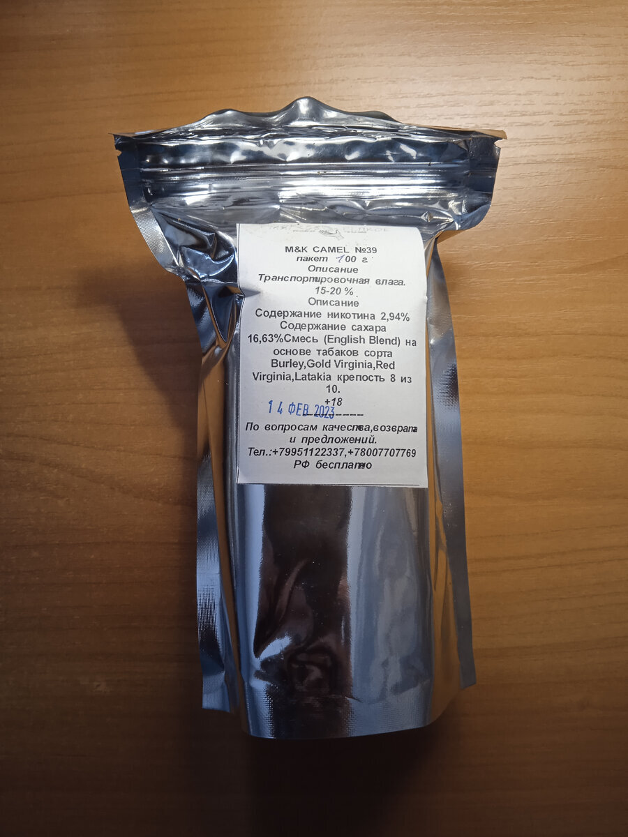 Все тактико-технические характеристики мешки указаны на этикетке. Запах из пакета бисквитов и выпечкой. Такой приятненький, не очень сильный аромат. Подсушил я табачок, забил и курю! Неплохой бленд я вам скажу. Во вкусе нет преобладания ароматизатора, табак на первом месте. Интересный букет Вирджинии, Берли и копчёного табака. А вот крепость явно не 8/10, максимум 6. Но это даже лучше, восьмерку я бы не смог курить.