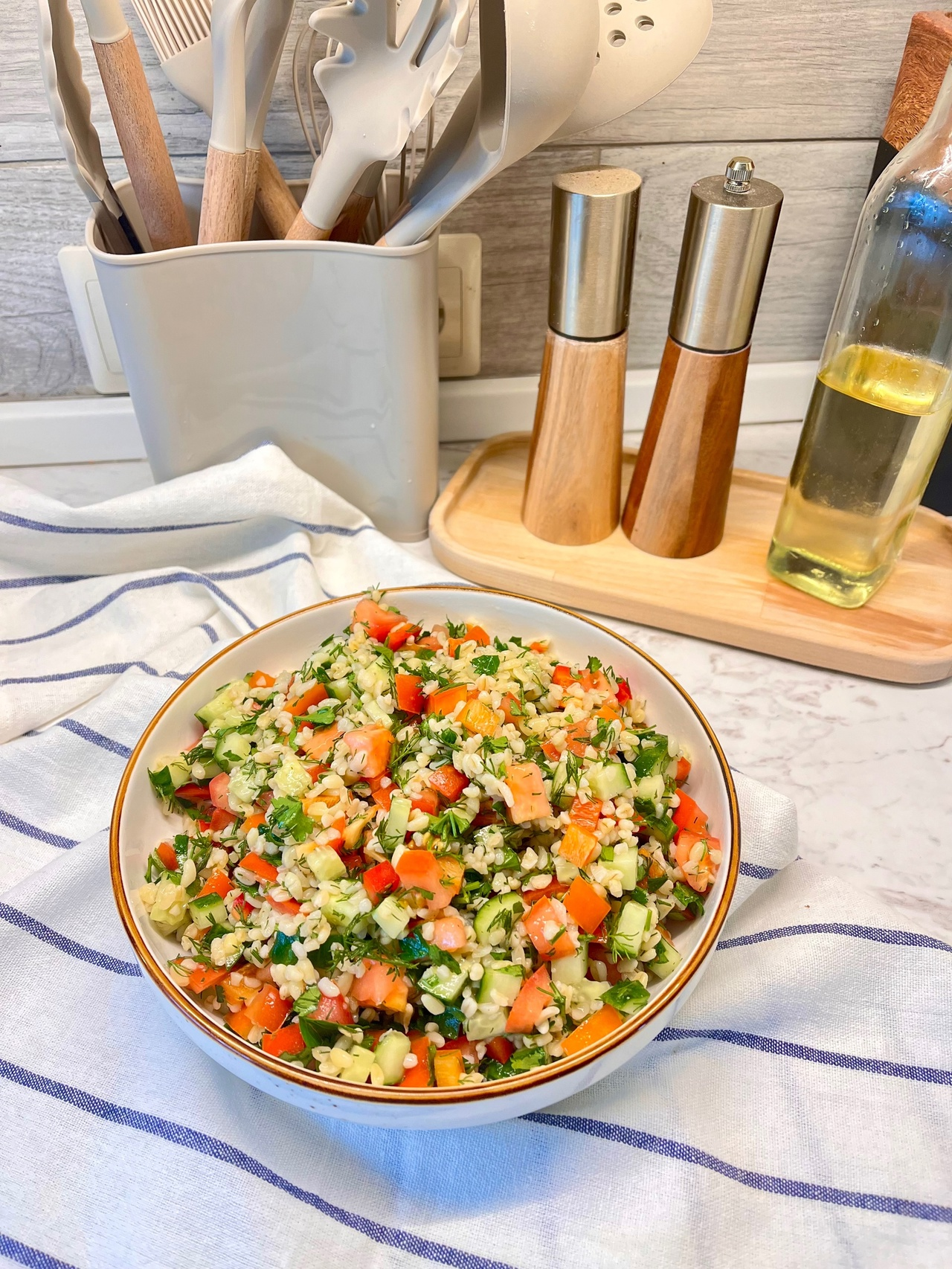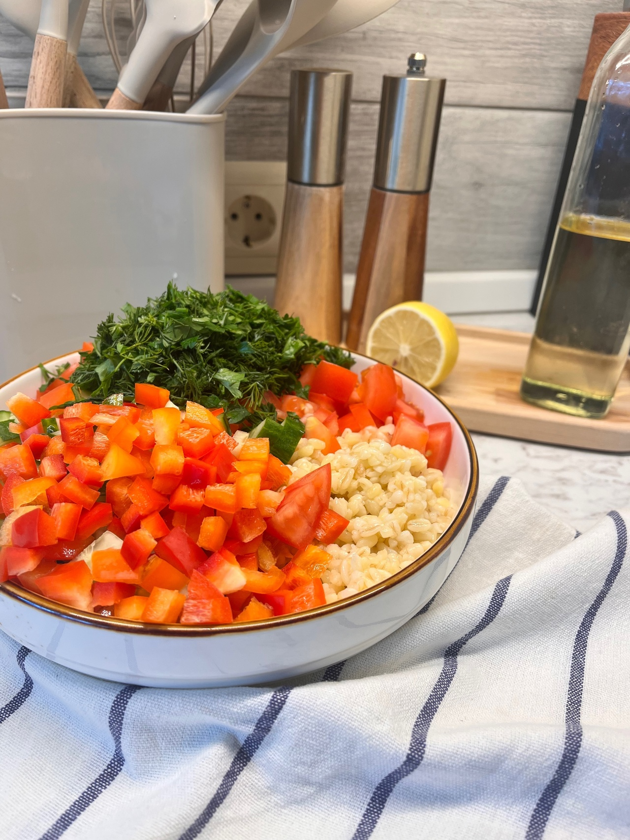 Овощи режем кубиками, зелень режем мелко и соединяем все с булгуром.
