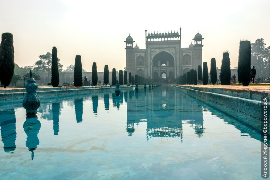 Через северные ворота, которые сами по себе являются шедевром архитектуры, посетители попадают в парк, с фонтанчиками посреди зеркальной глади воды, мраморными тропинками и газонами. Здесь вы будете поражены удивительной симметричностью расположения садов и архитектурных сооружений. Есть в Тадж-Махале только одна несимметричная часть, но об этом чуть дальше.