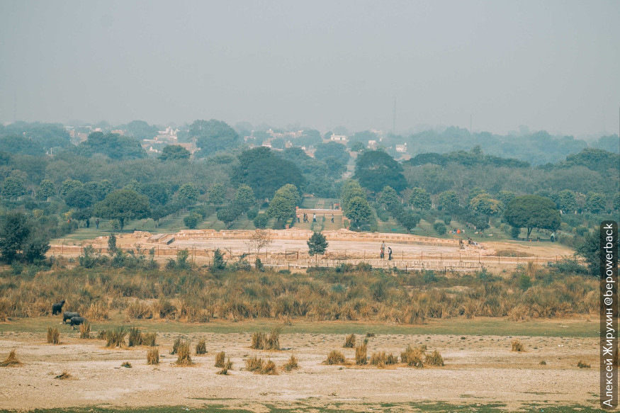 С задней стороны Тадж Махала открывается вид реку Ямуну (Джамна). Руины напротив — это фундамент нереализованного проекта Шах-Джахана — Черного Тадж Махала, который он хотел построить для себя. Его сын Аурангзеб, увидев, что отец ослабевает и уже не имеет сильной власти, совершил в стране переворот и сам стал правителем. Первое, что он сделал придя к власти, это заточил отца в башню и прекратил строительство «черного» мавзолея. Единственным утешением стала возможность взирать на Тадж-Махал из окна своего заточения Красного форта Агра, по которому мы тоже чуть прогуляемся.