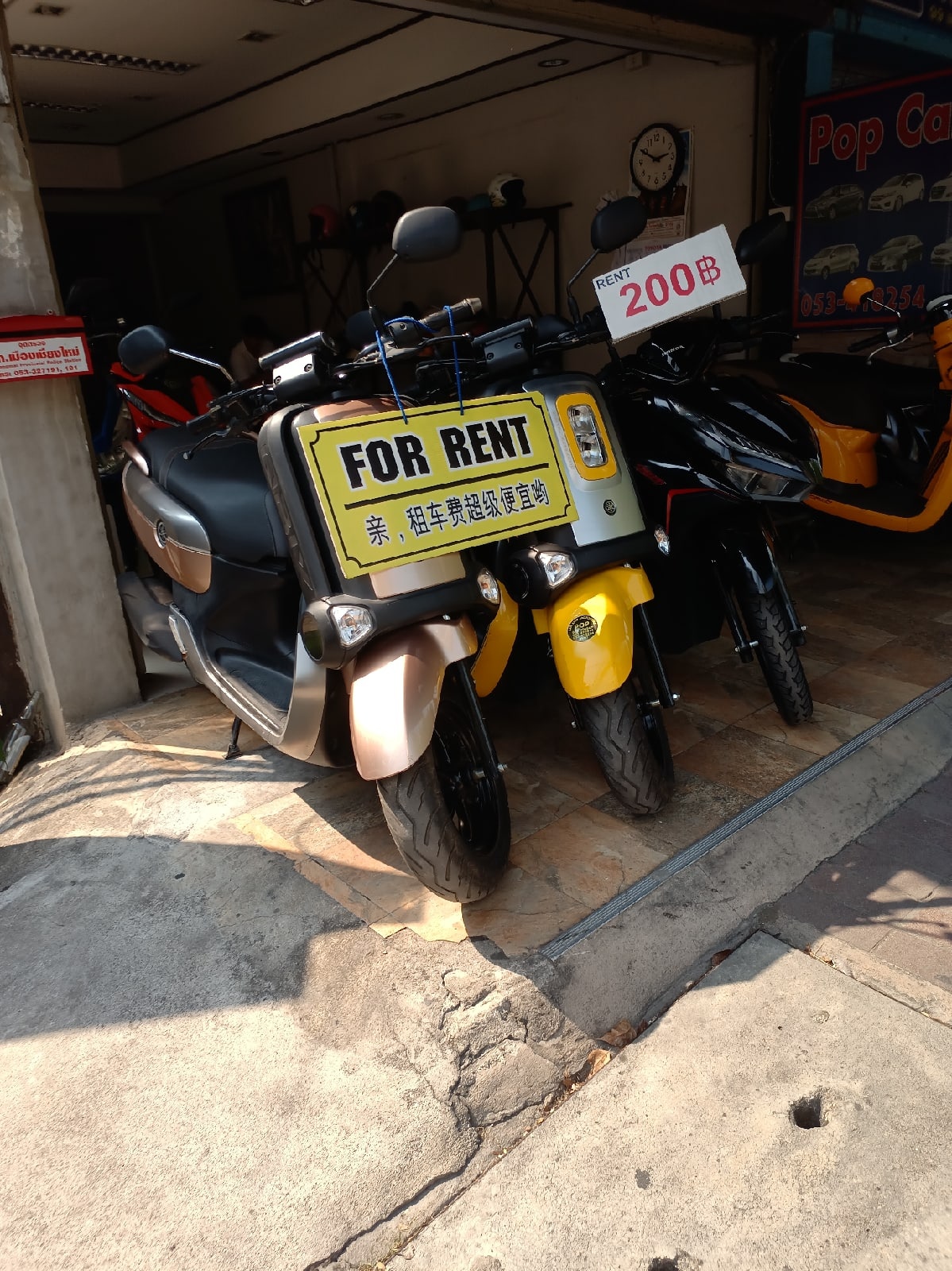 Поблизости пустуют прокаты байков. Странно, что они не уронили цены - хотят 200 бат в день, хотя на той же Лой Кро разные конторы просят 100 бат/день. Но всё равно парковки забиты, никто технику не арендует, так как у постоянно живущих здесь экспатов есть свои машины или скутеры.