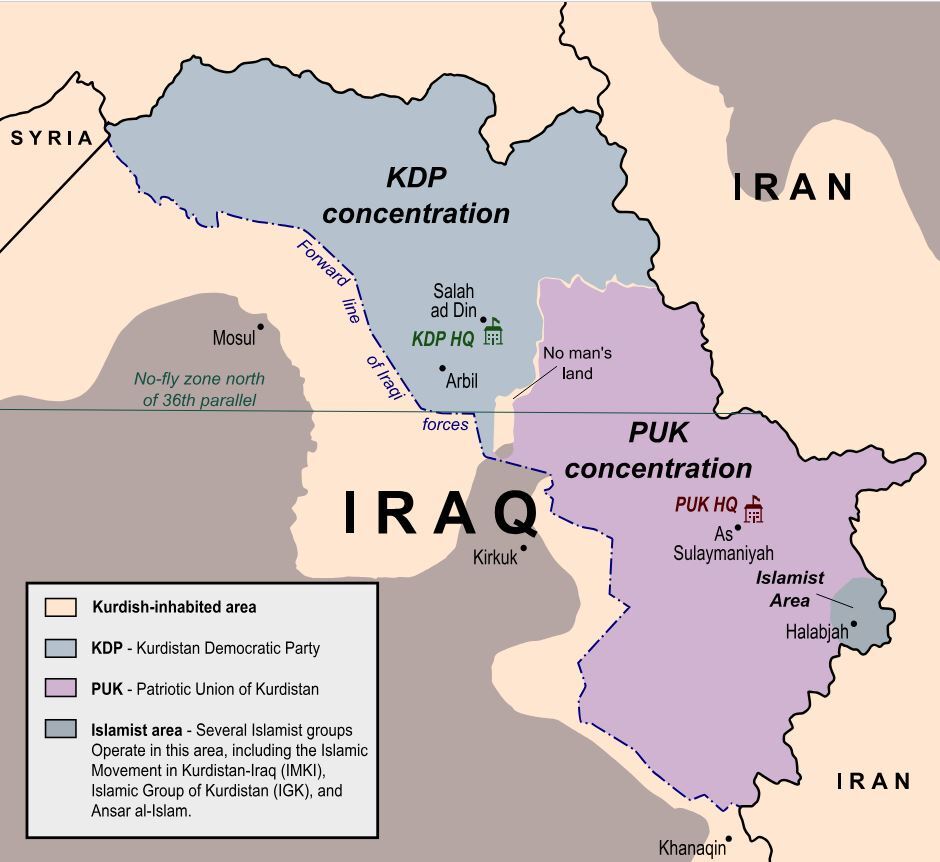 Север Иракского Курдистана и его столица – Эрбиль контролируется Барзани , юг - Талабани. Карта старая. Источник https://en.wikipedia.org/wiki/Iraqi_Kurdish_Civil_War