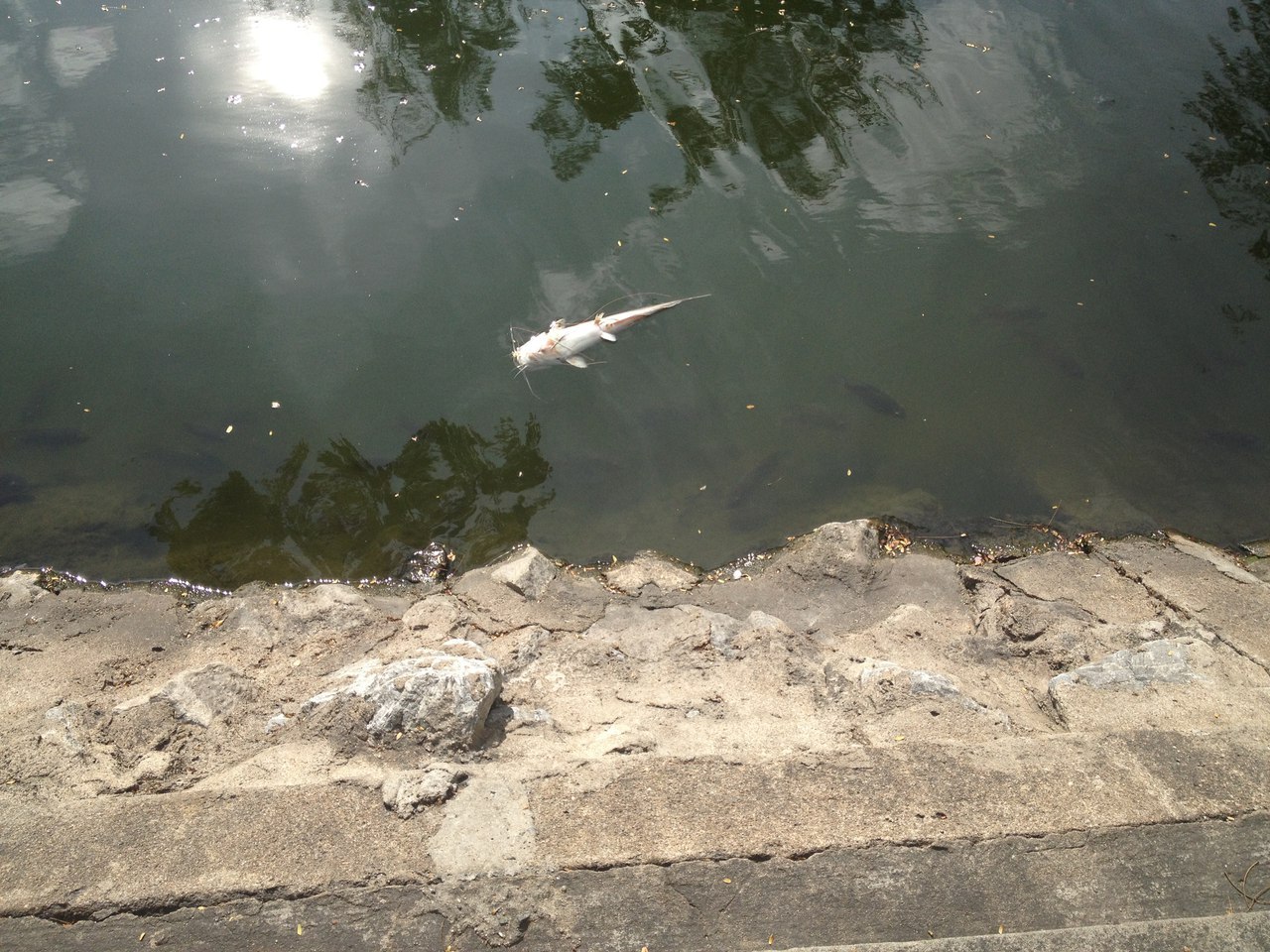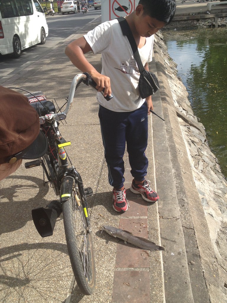 Дело было в Тае. Шли мы себе, шли вдоль рва, похожего на речушку, никого не трогали, как вдруг видим что-то белое! Оказалось мертвый сомик всплыл. Первый раз за весь месяц увидели мертвую рыбу в этом рву. Постояли, поглазели и уже собирались уходить, как неожиданно слышим сирену. Вдруг, откуда ни возьмись, к нам подъехал мальчик с мигалками и рацией на своем велосипеде. Ему еще не хватало формы, наручников и пушки.