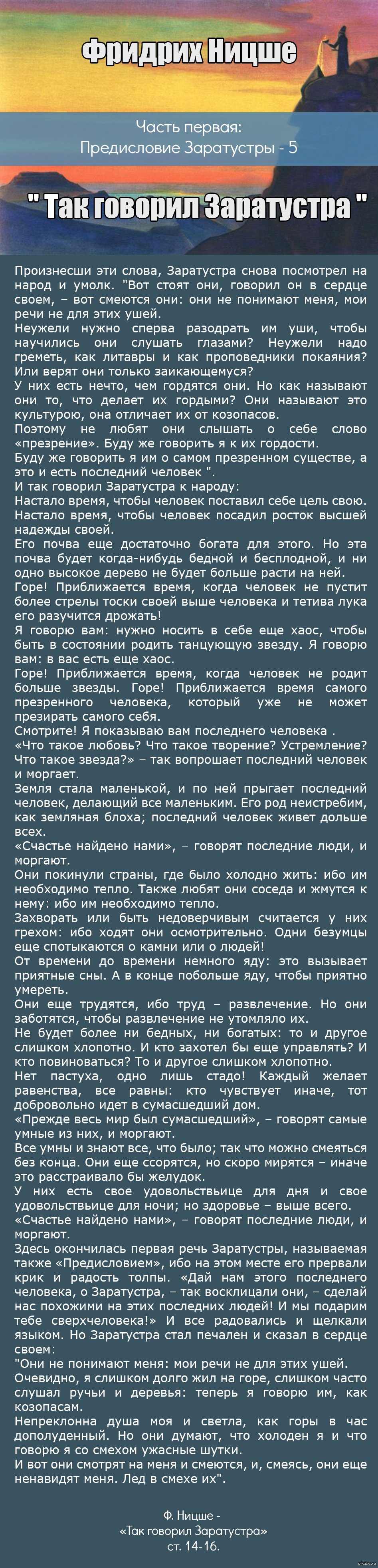 0 giver0 "Так говорил Заратустра" - Ф. Ницше. Часть первая: Предисловие Заратустры - 5. 10 лет назад Оставляем в комментариях свое виденье данной главы. [моё] Заратустра Ницше Философия Книги Длиннопост Комментарии Мысли