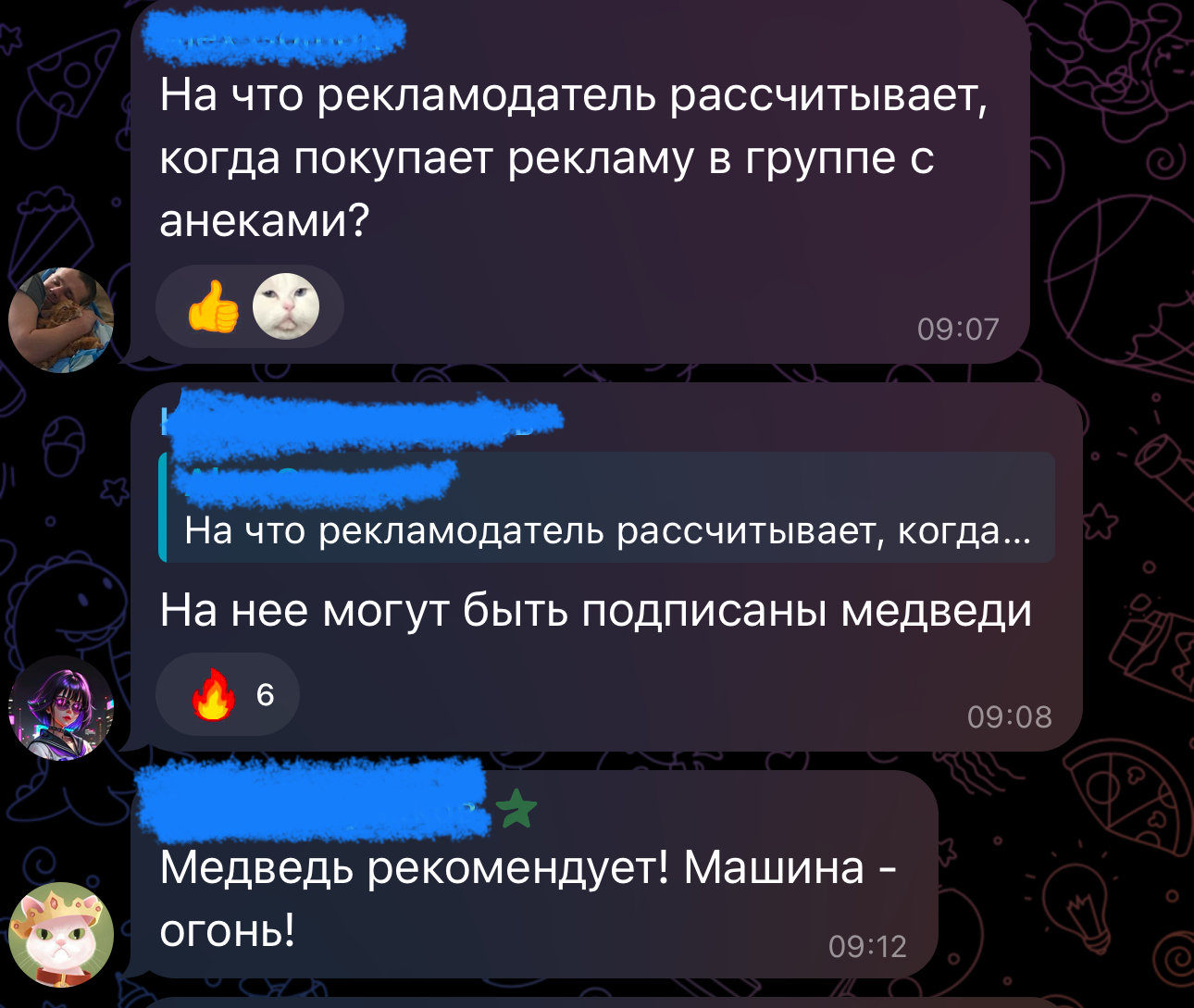 7 SloBro Юмор Так и хочется сесть внутрь! 1 год назад Из комментов к посту с рекламой автомобиля в телеге Рекламы ТГ канала не будет) Анекдот Стереотипы Маркетинг Машина Медведи Огонь Ещё 0