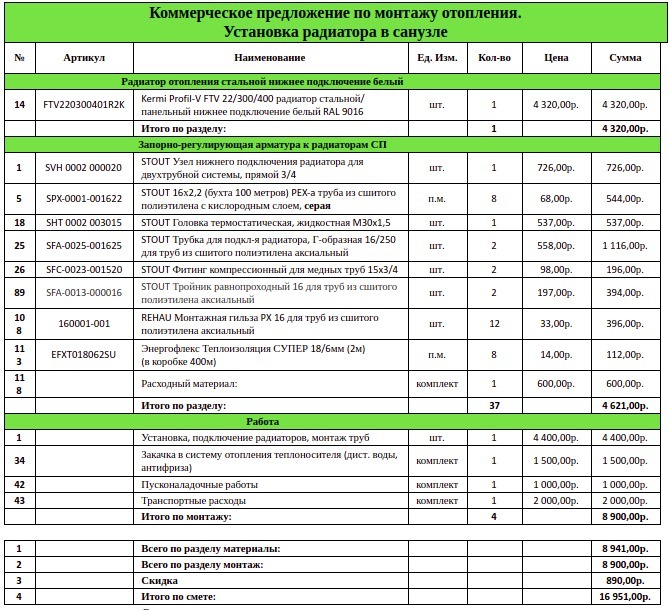 ну если бы мы добавили например 3 радиатора, то смета была бы конечно не 16*3. Но все равно тыщ 35-40 бы вышло.