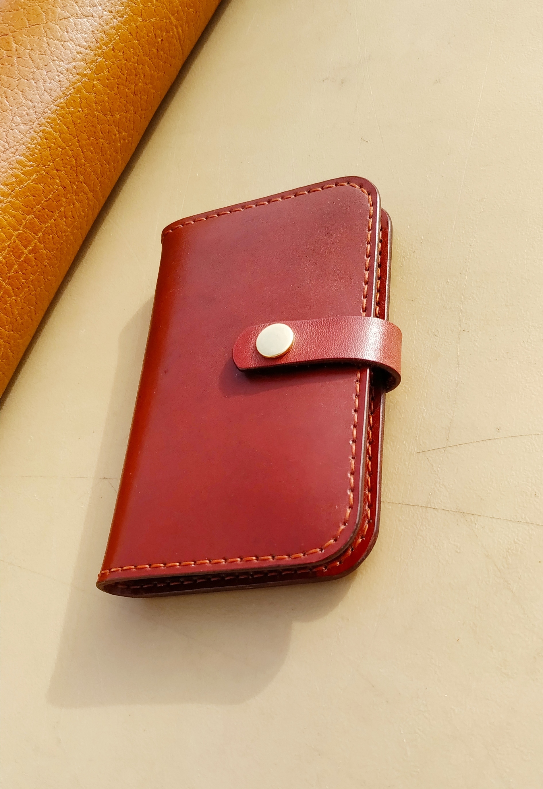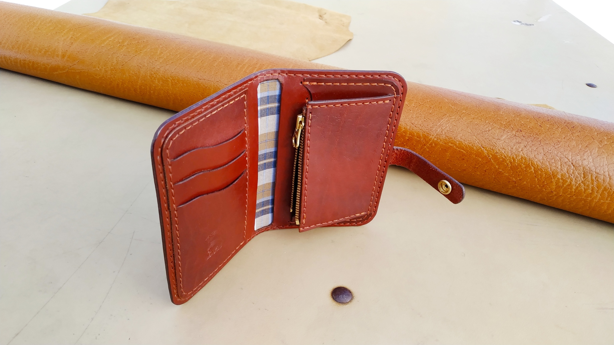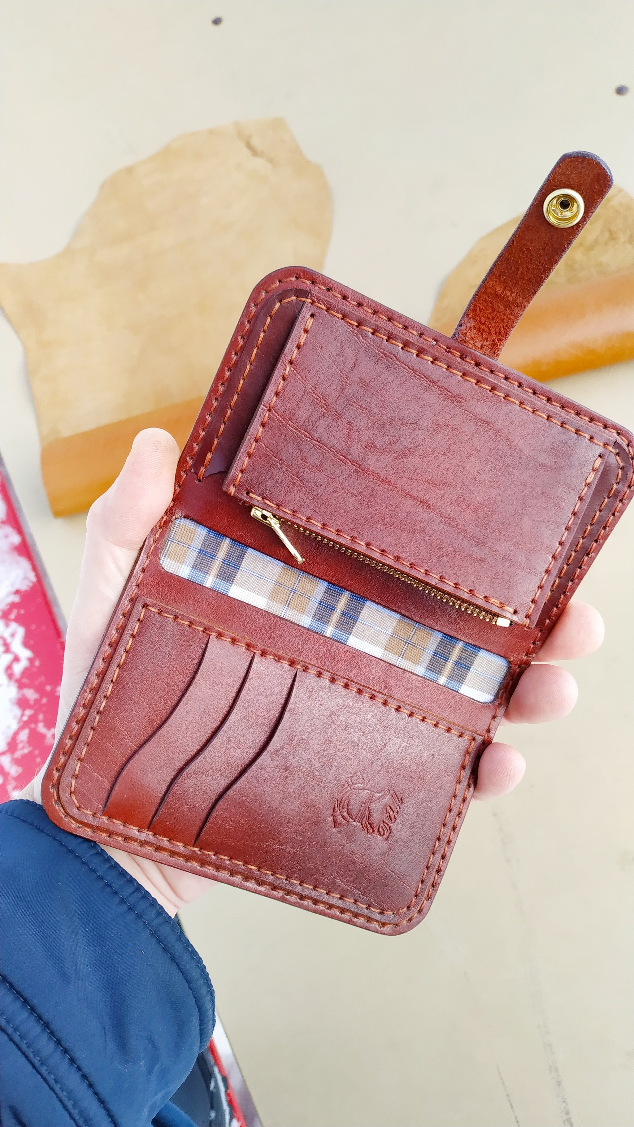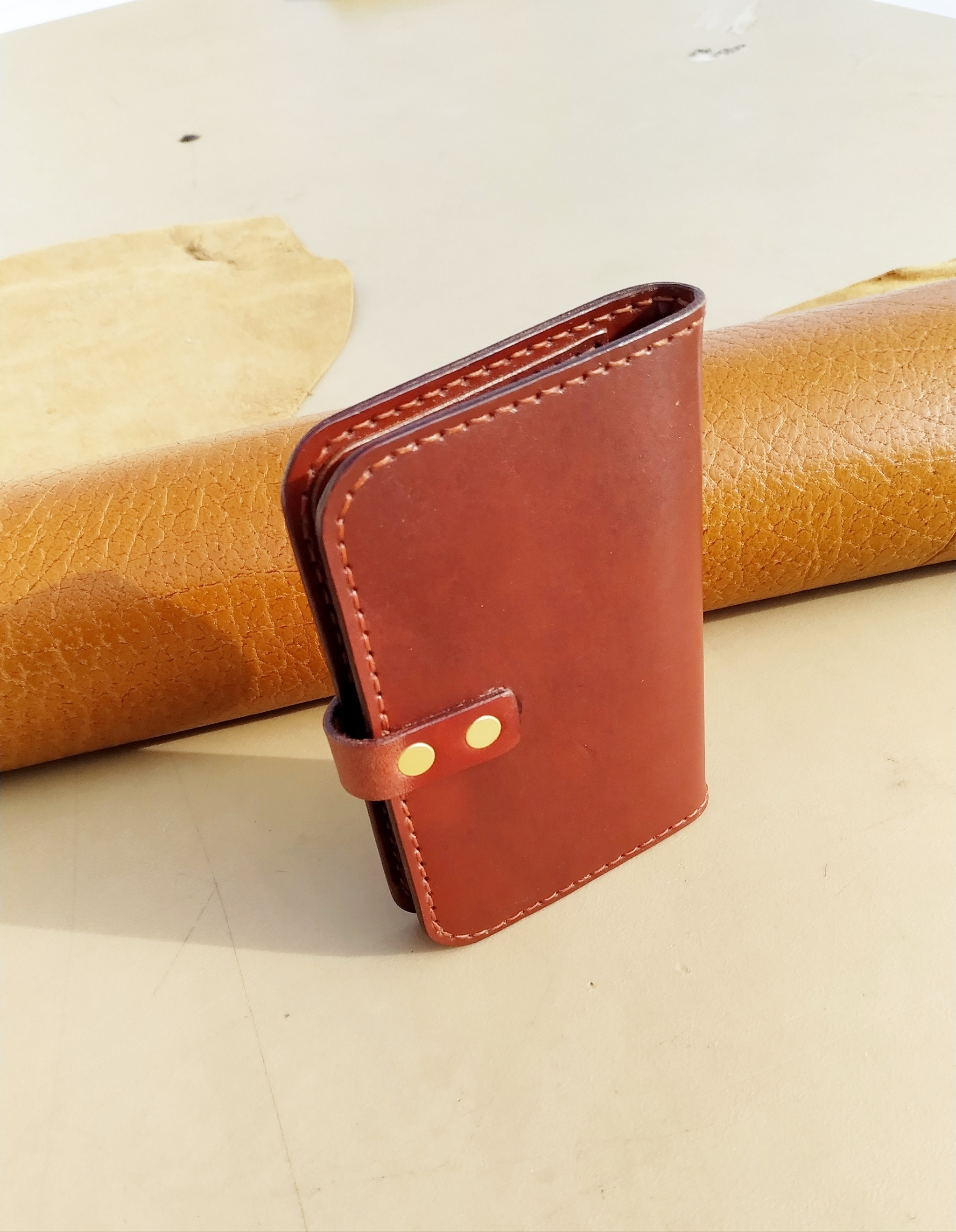 Портмоне в оттенках кизилового варенья для различного добра автолюбителя. Размер 90х135 мм. Использован белорусский краст 1,2-1,4 мм, очень плотный. Заводской финиш каким то тугоплавким воском. Пробойник строчный, высечной, шагом 5 мм. Нить 0,6 мм "ржавчина". Фурнитура и молния латунные.