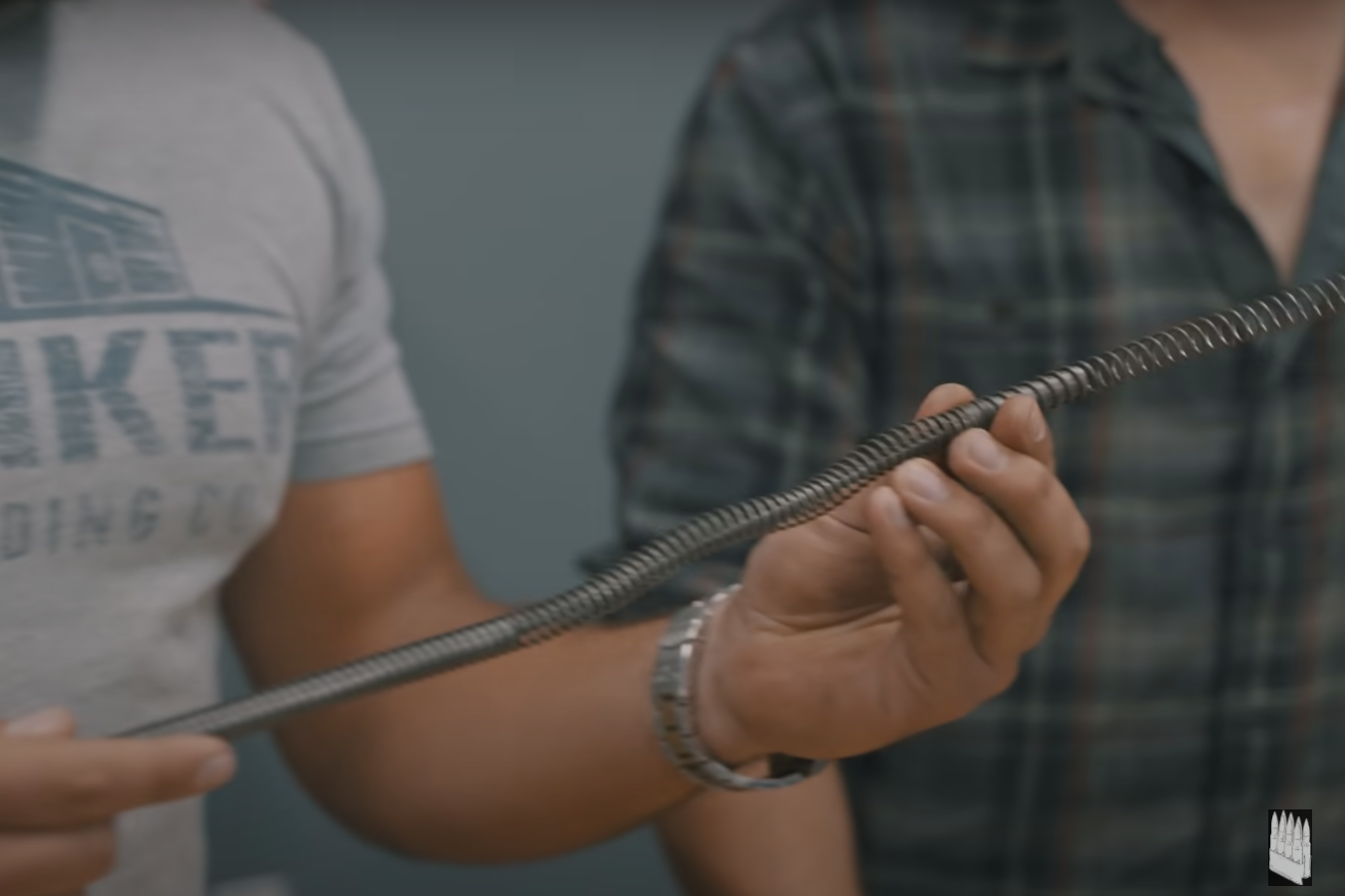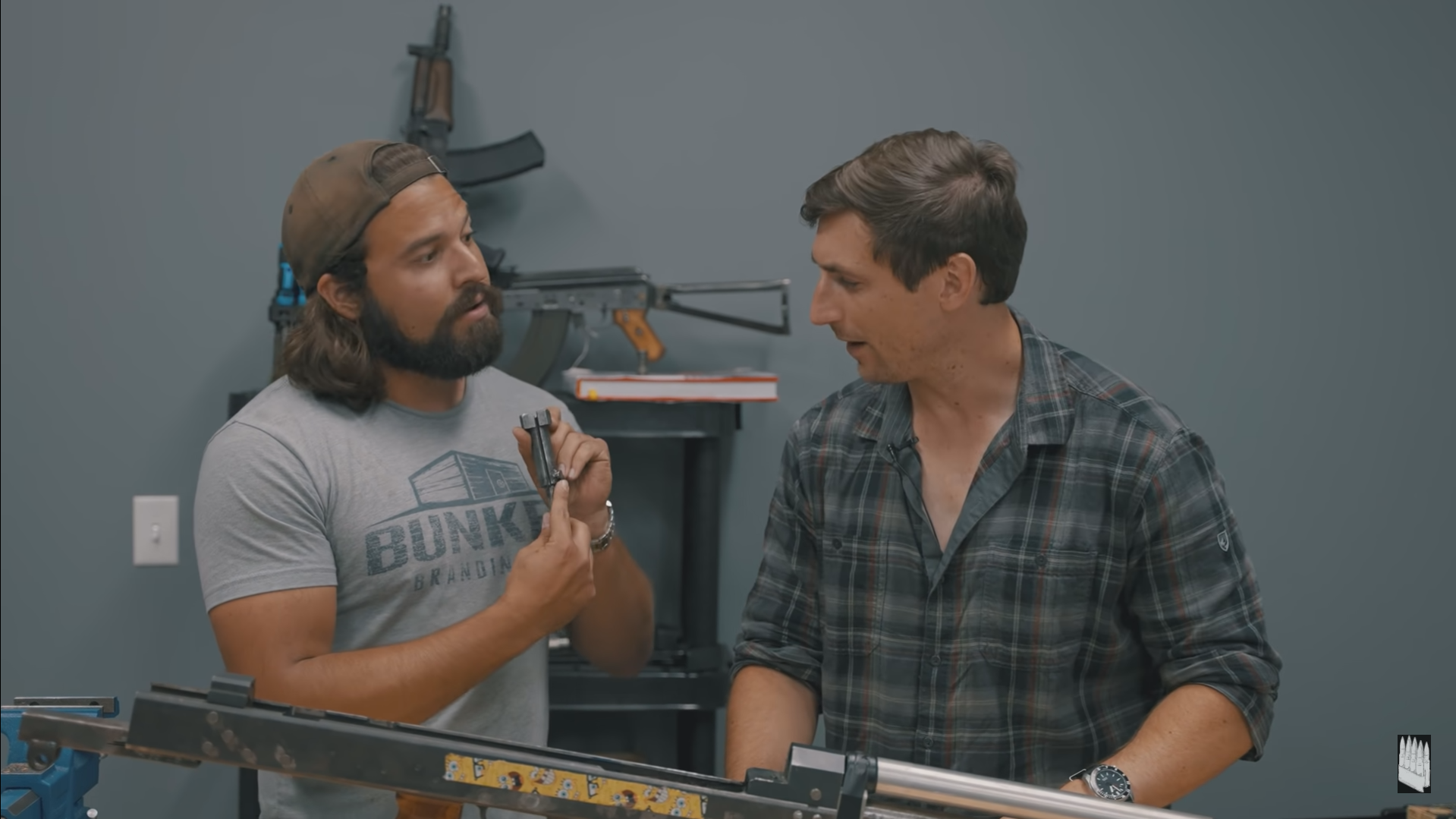 В прототипе первого поколения использовалось две параллельно расположенные возвратные пружины, но во втором решено было попробовать с одной. Сделали для неё буфер отдачи, чтобы с мясом не вырывало. Брендон считает, что у этого буфера сейчас слишком большой ход, нужна пружина посильнее