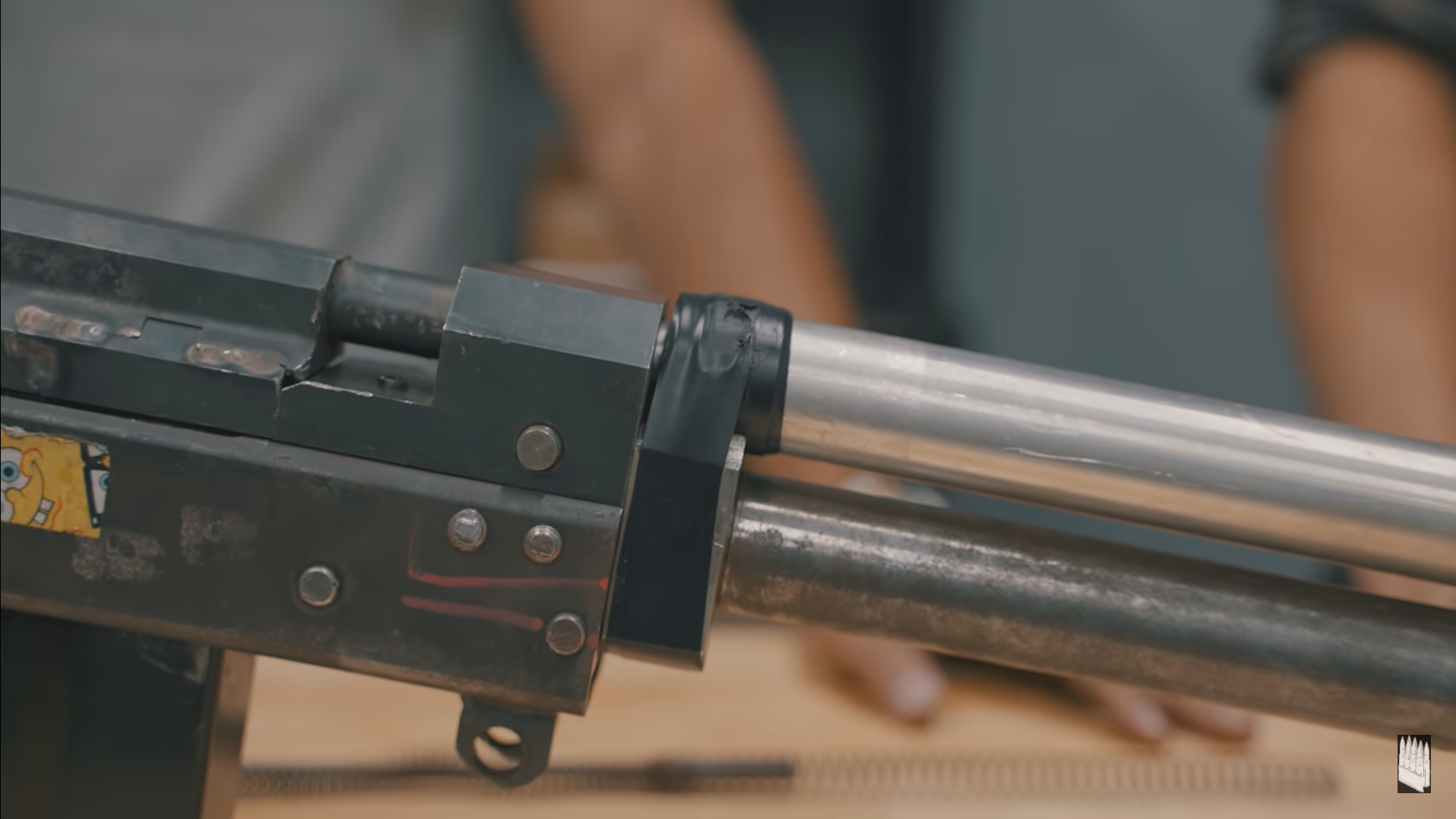 Газовую трубку вообще вручную на токарном станке точили. Сейчас она держится только на изоленте, потому что для неё ещё не слелали крепление. Брендон говорит, они пробовали закреплять её и строительными стяжками, и "тактическим хомутом для шлангов", но в итоге изолента подошла лучше всего, потому что она тянется, а поэтому не лопается от ударных нагрузок, как было с первыми двумя вариантами.