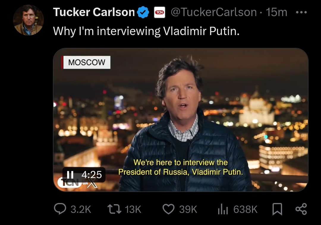 По словам журналистов, президенту Украины не задавали сложные вопросы, каждое его интервью больше похоже на напутственную речь. Это не журналистика, это госпропаганда, которая убивает людей. Пока СМИ и политики продвигали образ Зеленского как рекламный продукт, никто не слышал голос Путина. Американцы заслуживают услышать его позицию, у нас нельзя отнять на это право." - примерный перевод.