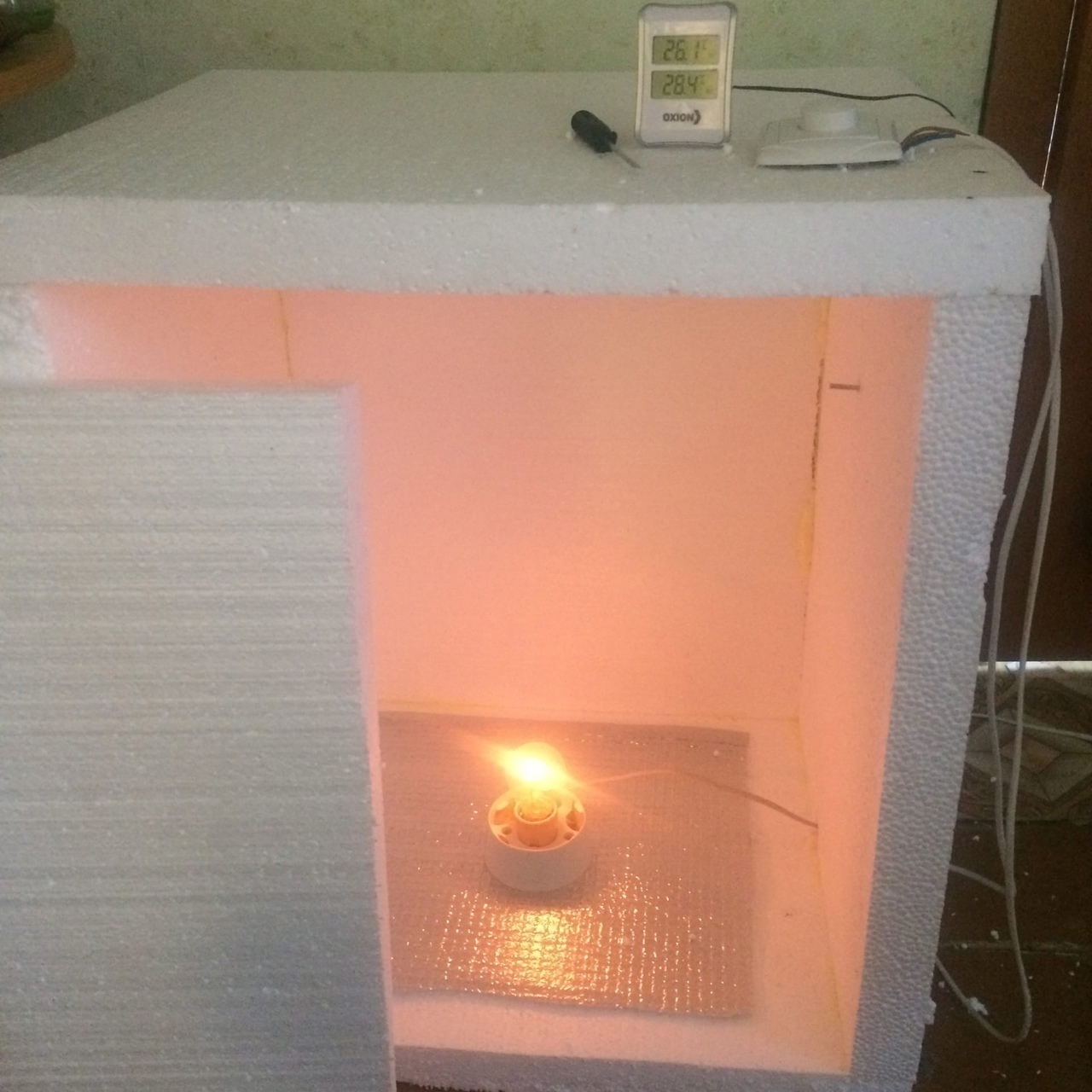 Собрать и высушить Вирджинию - половина дела. Вторая половина - ферментация. Можно, конечно, дать полежать листам пару лет, но есть способ термической обработки. Для этого я собрал ферментатор из плит ППС. Внутри - лампа накаливания 75Вт через диммер. С помощью диммера я выставил внутри ферментатора температуру 48град и оставил там табак в банках на 2 недели.