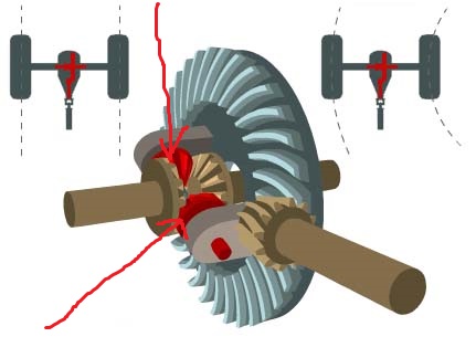 В этом механизме есть главная передача, которая передает вращение с кардана на колеса, и есть 4 шестерни, которые позволяют балансировать вращение между двумя колесами. Так вот эти 4 шестерни и надо сварить, тогда вращение будет передавать строго поровну на оба колеса