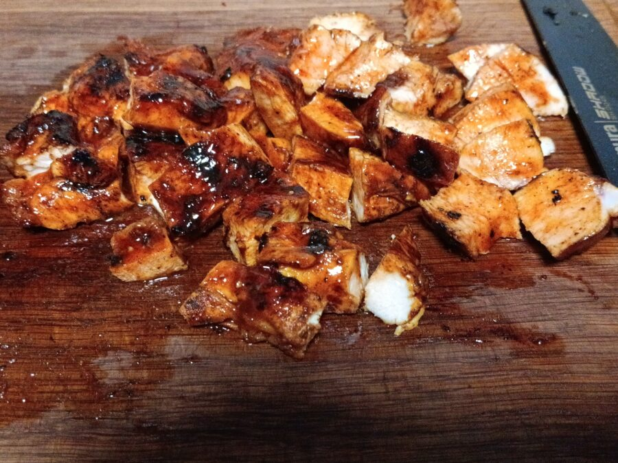 Переложите на доску и дайте постоять 5 минут. Нарежьте на кубики и смажьте глазурью, в зависимости от желаемой остроты (чем больше глазури, тем острее курица).
