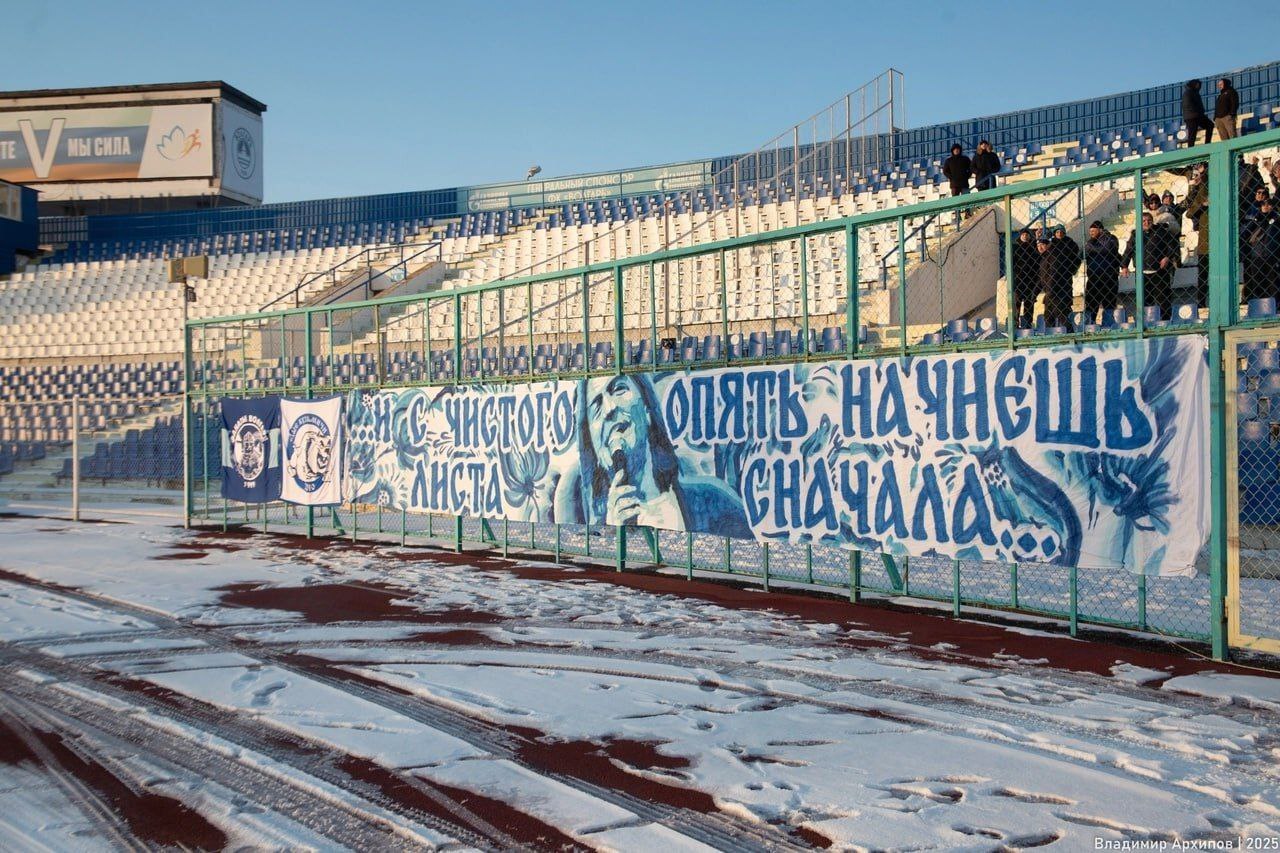 Фанаты астраханского Волгаря на матче с Родиной II. Лицевик с цитатой из композиции Дмитрия Маликова и с изображением самого певца — такого мы ещё не видели 😁