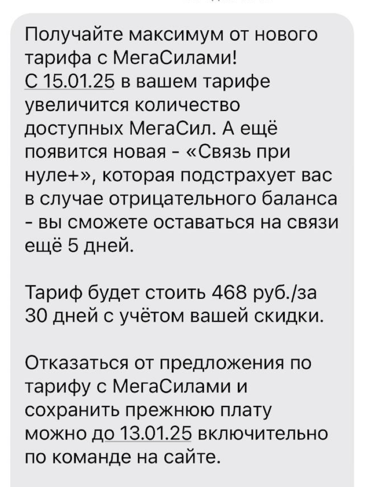 Если новые условия не подошли, для отказа можно набрать команду не позднее указанной в SMS даты.