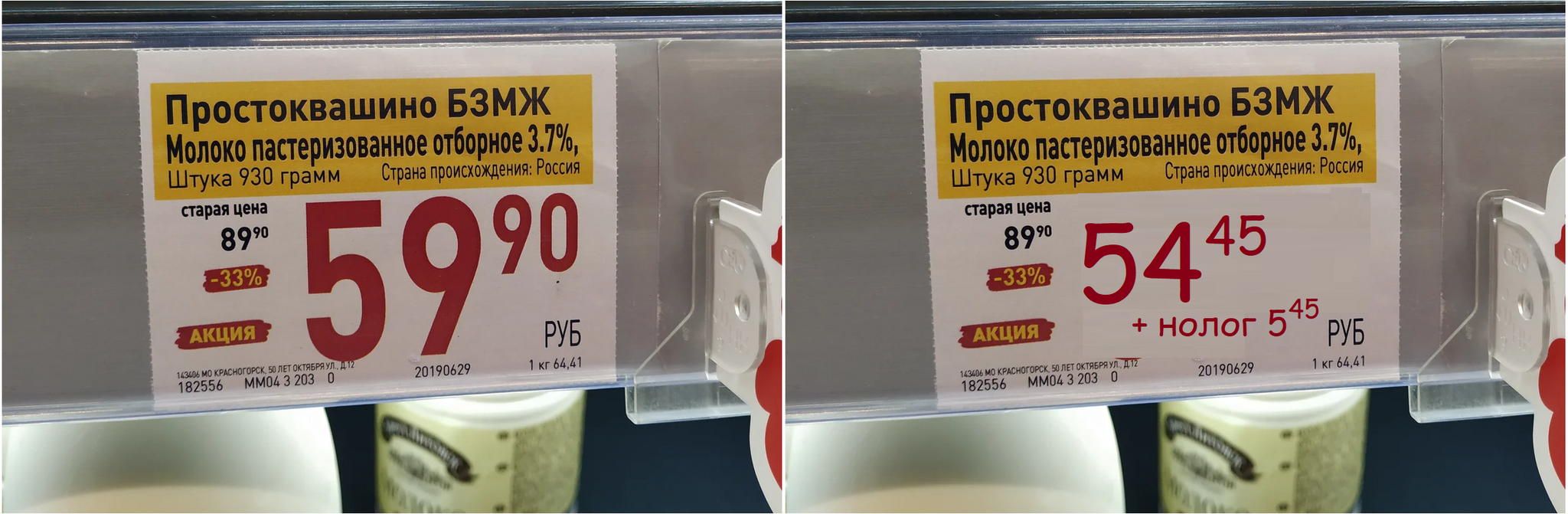 Я показать вам другую сторону этого дна. Во всех ценах заложены налоги, про которые мы, покупатели, не думаем в момент. Я точно знаю, что какая-то часть стоимости купленных мною продуктов уйдёт в казну прямо из магазина. Но какая именно, увы, не разбирался. Беглым поиском на пикабе не нашёл, а в интернете пишут, что на некоторые продукты НДС = 10%, а на остальные = 20%. Теперь предствьте у нас такие вот ценники: