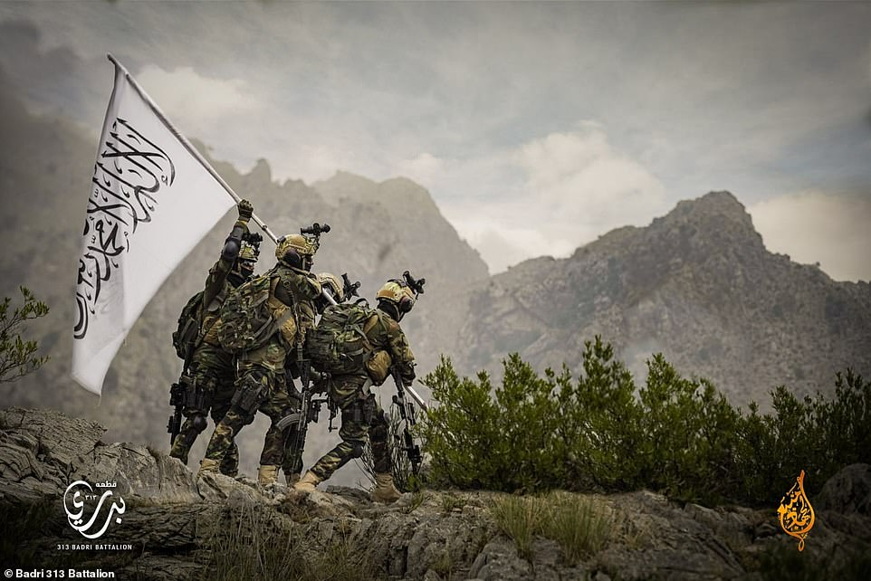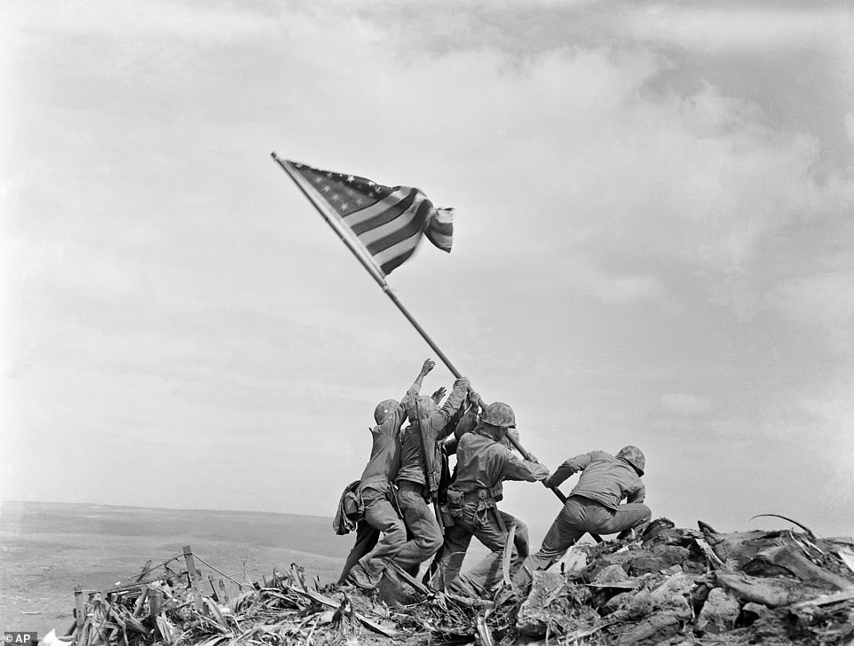 Группа боевиков Талибана воссоздала известную фотографию Второй мировой войны в США в коллекции пропагандистских кадров, которые они опубликовали на этой неделе. На отдыхе (вверху) группа солдат поднимает флаг Талибана и носит американское оружие и снаряжение.