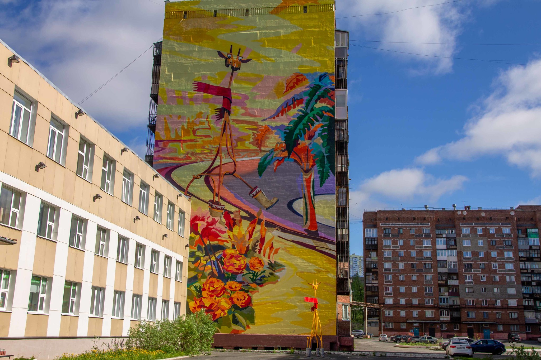 Как и на всём Крайнем севере, в Талнахе стараются раскрашивать стены домов масштабными картинами.